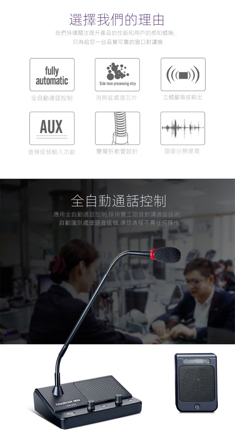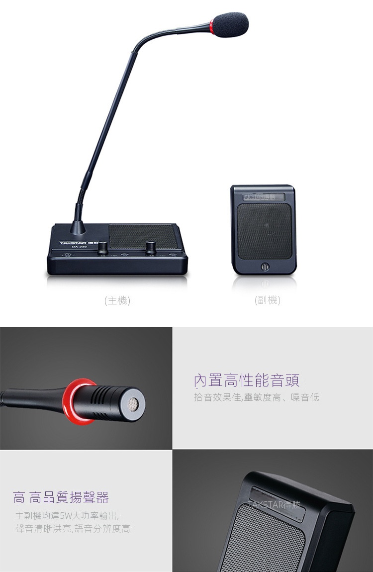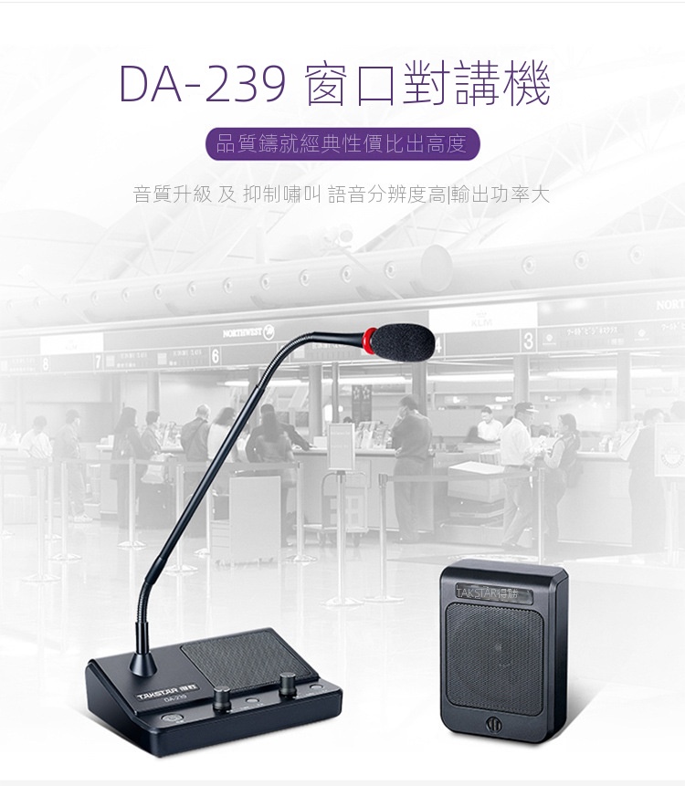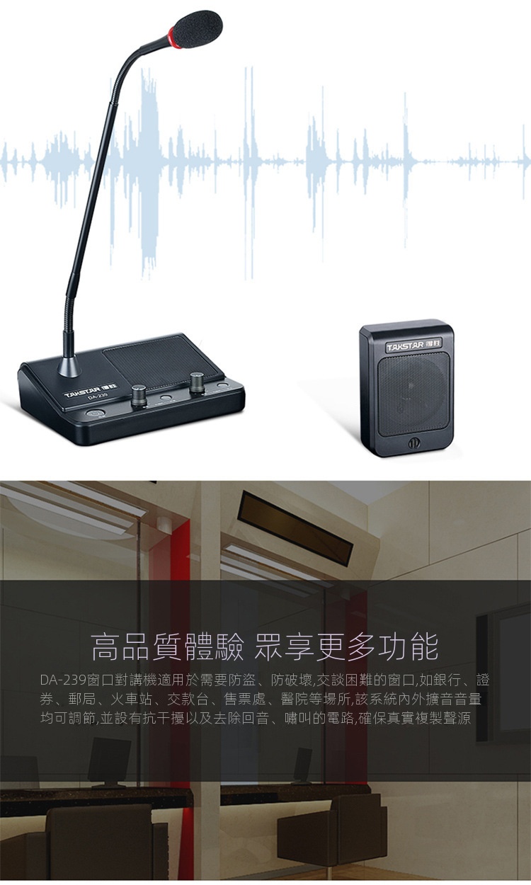 得勝 TAKSTAR DA239 視窗櫃位對講機 ,具備全自動通話控制、雙分機接口及立體聲插座輸出,支持高清錄音與3W輸出功率。內建高性能音頭,靈敏度高、噪音低,音質清晰自然。支援音頻信號輸入,可連接電腦、手機等設備進行外播。適用於銀行、證券、郵局、火車站、交款台、售票處、醫院等場所。