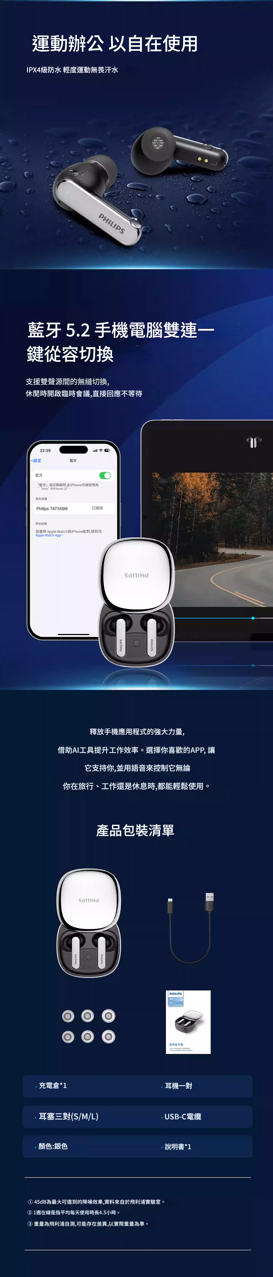 Philips 藍牙降噪翻譯耳機TAT5599,搭載智慧型AI同聲傳譯技術,實現面對面無障礙溝通。32小時超長續航,藍牙連接穩定,降噪功能強大,讓您在嘈雜環境中也能享受清晰音質。無論商務還是旅遊,皆為您的溝通利器。