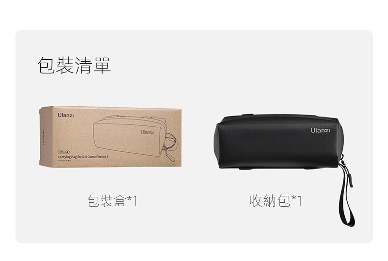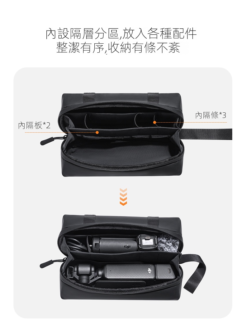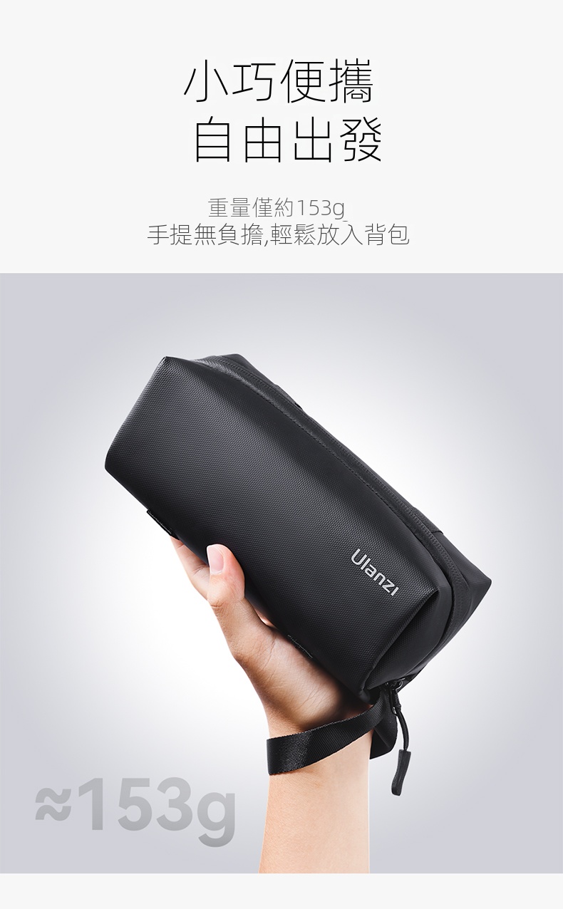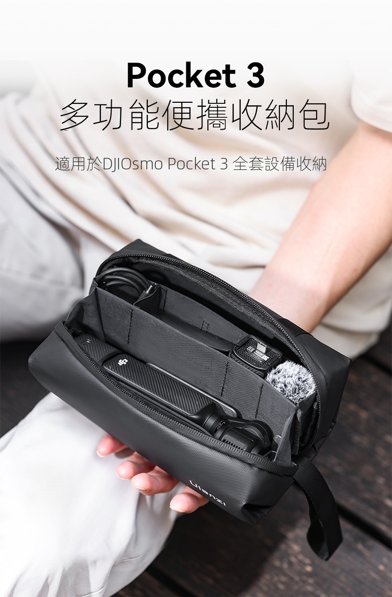 Ulanzi Pocket 3 收納包是一款專為 DJI Osmo Pocket 3 設計的多功能便攜收納包。它不僅能夠輕鬆容納全套設備,還提供多種擴展模組的存放空間,讓您隨時取用,記錄精彩瞬間。收納包內設有隔層和分區,確保各種配件整潔有序,使用起來更加方便。 此外,該收納包採用防潑水面料和軟絨內襯設計,提供細緻的保護,防止設備受潮或碰撞損傷。防水拉鏈進一步增強了其耐用性和實用性。重量僅約 153 克,輕巧便攜,手提無負擔,也可放入背包中,適合各種出行需求。 除了作為Pocket 3 的專屬收納包外,它還可變身為數碼收納包,適用於手機、Mini補光燈、相機電池、數據線、SD卡等多種電子產品的存放。小巧的設計和多樣化的攜帶方式(手提、肩背、外掛)使其成為日常出行的理想選擇。