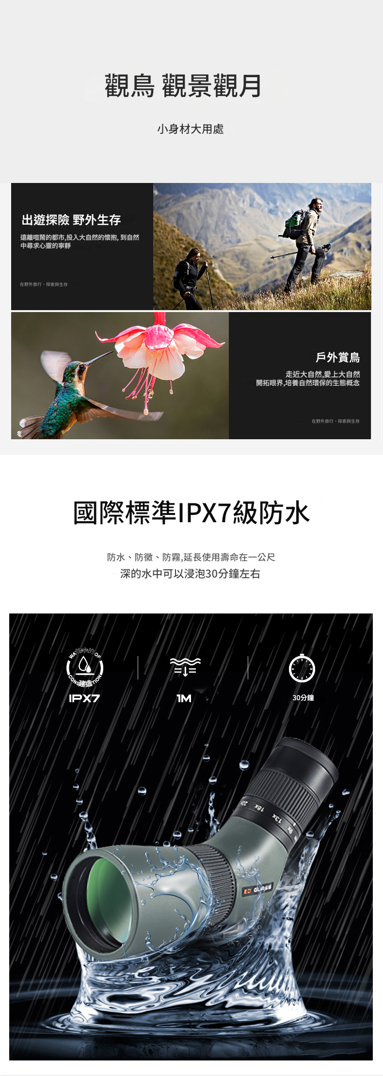 EYESKEY 9-27x56天驕系列高清ED鏡觀鳥鏡,採用平場ED鏡片,能夠提供高達99%的全景清晰畫面,色彩逼真,讓您享受高清且清晰的觀鳥體驗。此外,它還具有高倍無極變倍功能,能夠滿足不同的觀看需求,讓您輕鬆觀察遠方的景象。此外,觀鳥鏡IPX7級防水功能,能夠在一米深的水中浸泡30分鐘左右,延長使用壽命。鎂合鏡身堅固耐用,金屬材質確保儀器的精密性和耐用性
