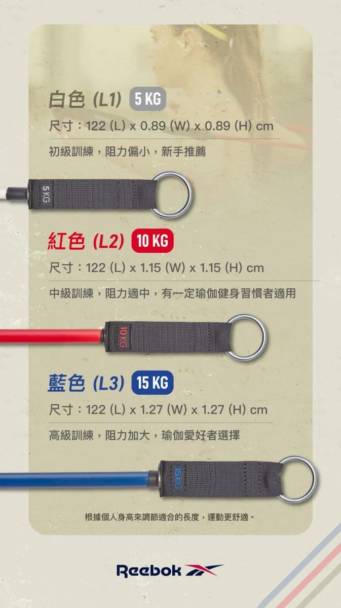 • 藍色(L3)- 15公斤: 高級訓練, 阻力加大, 瑜伽愛好者選擇 根據個人身高來調節適合的長度, 運動更舒適。