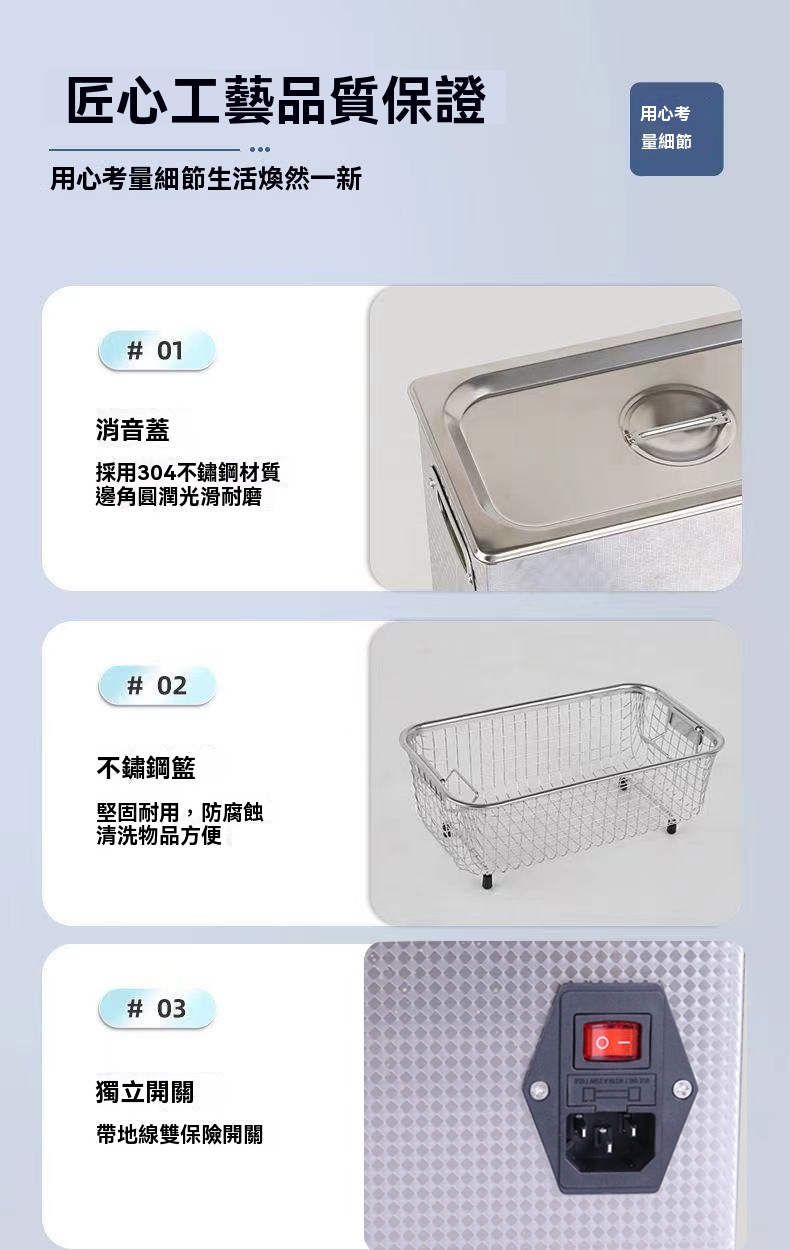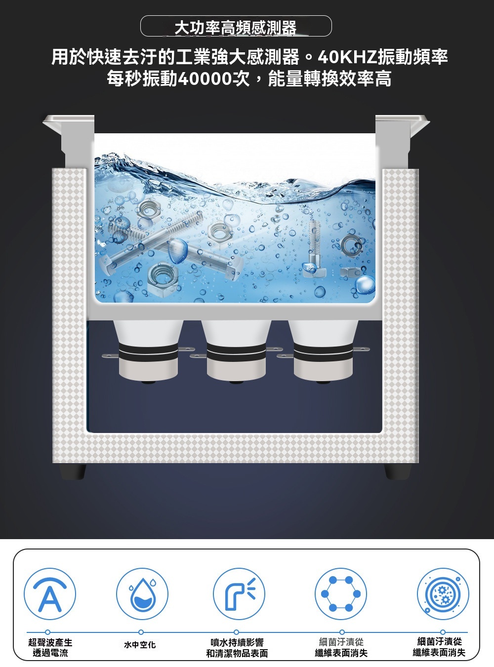 • 大功率高效清洗:通常搭載360W的超音波功率(部分型號或可選更高功率)及多個工業級震子,確保強勁且均勻的清洗力度。