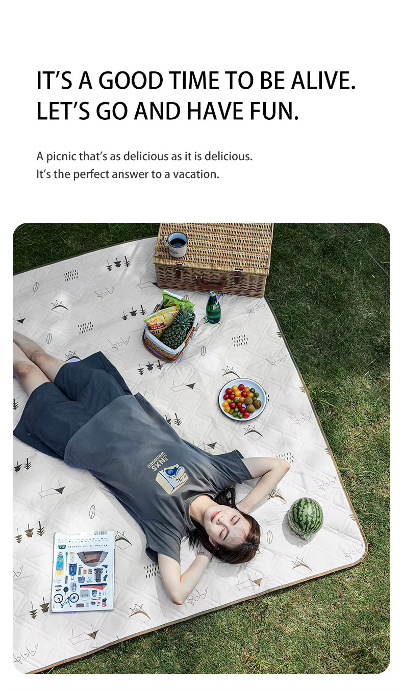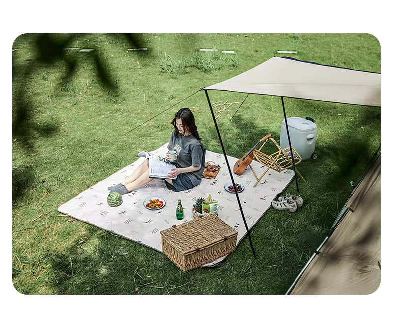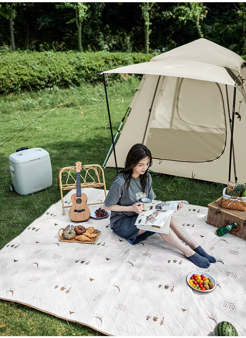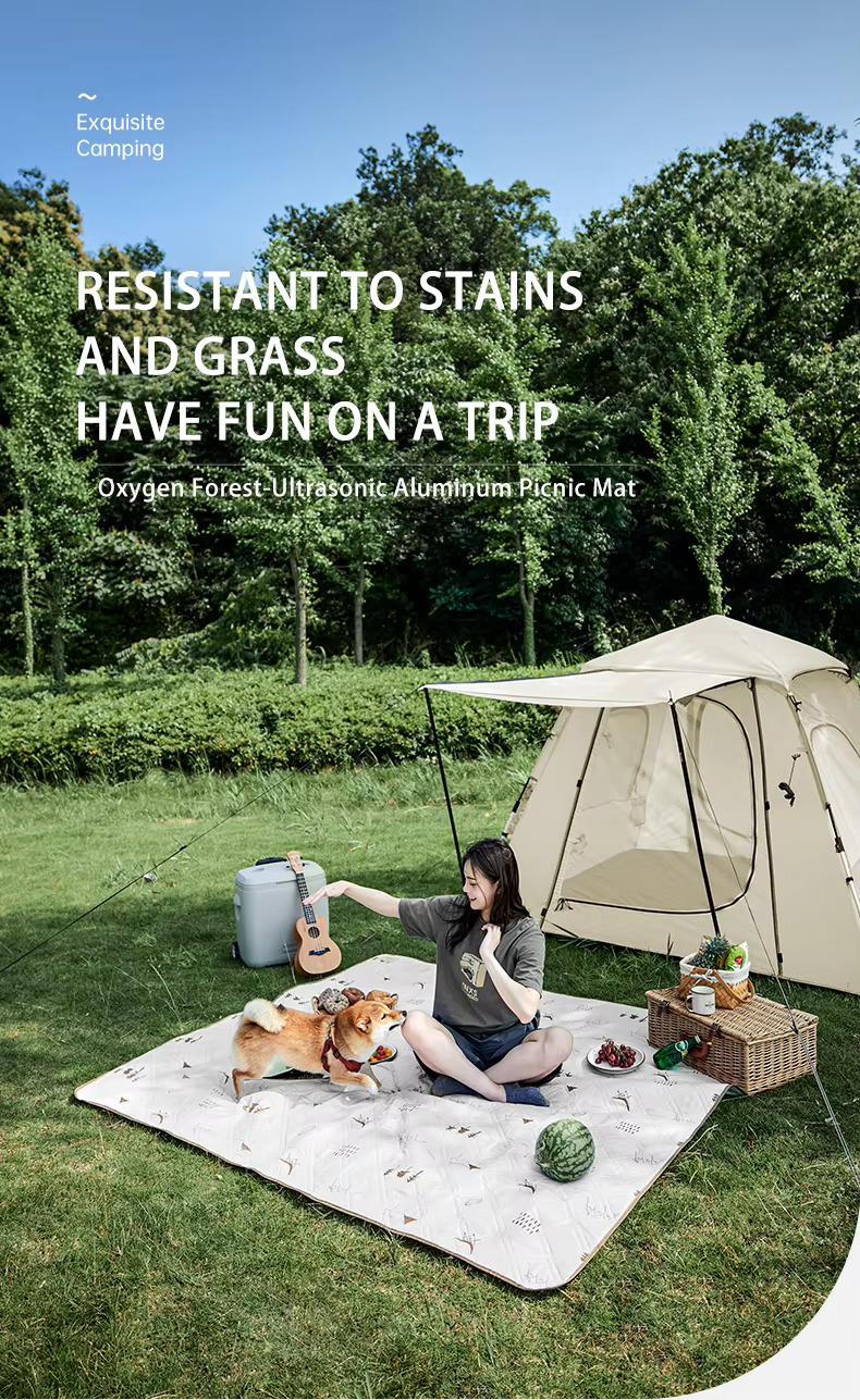 Naturehike Oxygen forest 超音波鋁膜野餐墊,集舒適、實用與美觀於一身。尺寸為200×180cm,面積寬敞,可輕鬆容納多人,適合家庭野餐或朋友聚會。其採用五層加厚複合構造,表層80g春亞紡耐磨、親膚且環保無異味,遇水不吸收;填充150g/m²針刺棉,柔軟舒適;加厚鋁膜底層防潮隔濕,不沾沙草。運用超音波固棉技術,棉花固定不位移,多次清洗仍平整。具備優異的防水防污性能,液體灑上一擦即淨。設有手提織帶,捲狀收納,攜帶便利。無論是戶外露營、公園野餐,或是作為居家寶寶爬墊,都非常合適 。