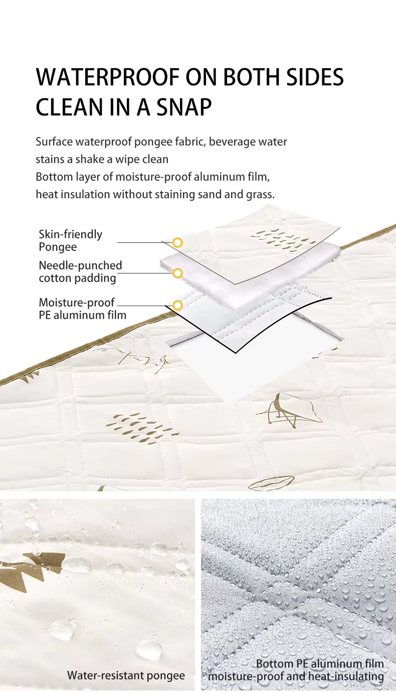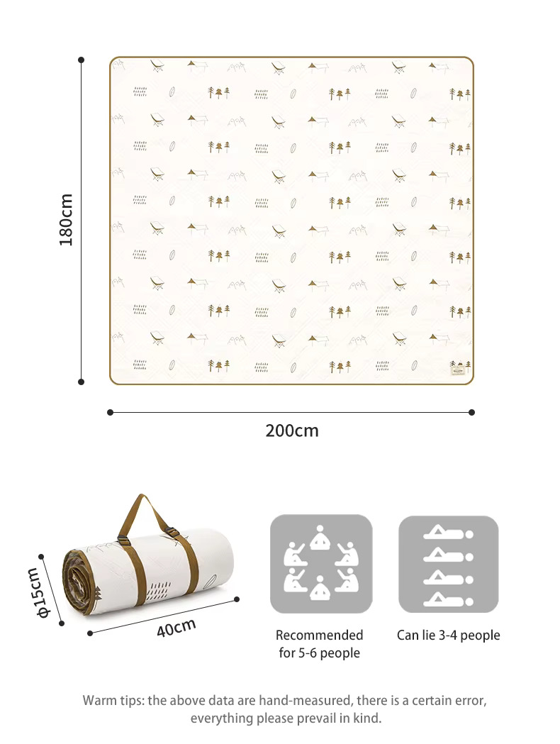 • 一墊多用:不僅適用於戶外野餐、露營,還可作為居家寶寶爬行墊、防潮墊。
