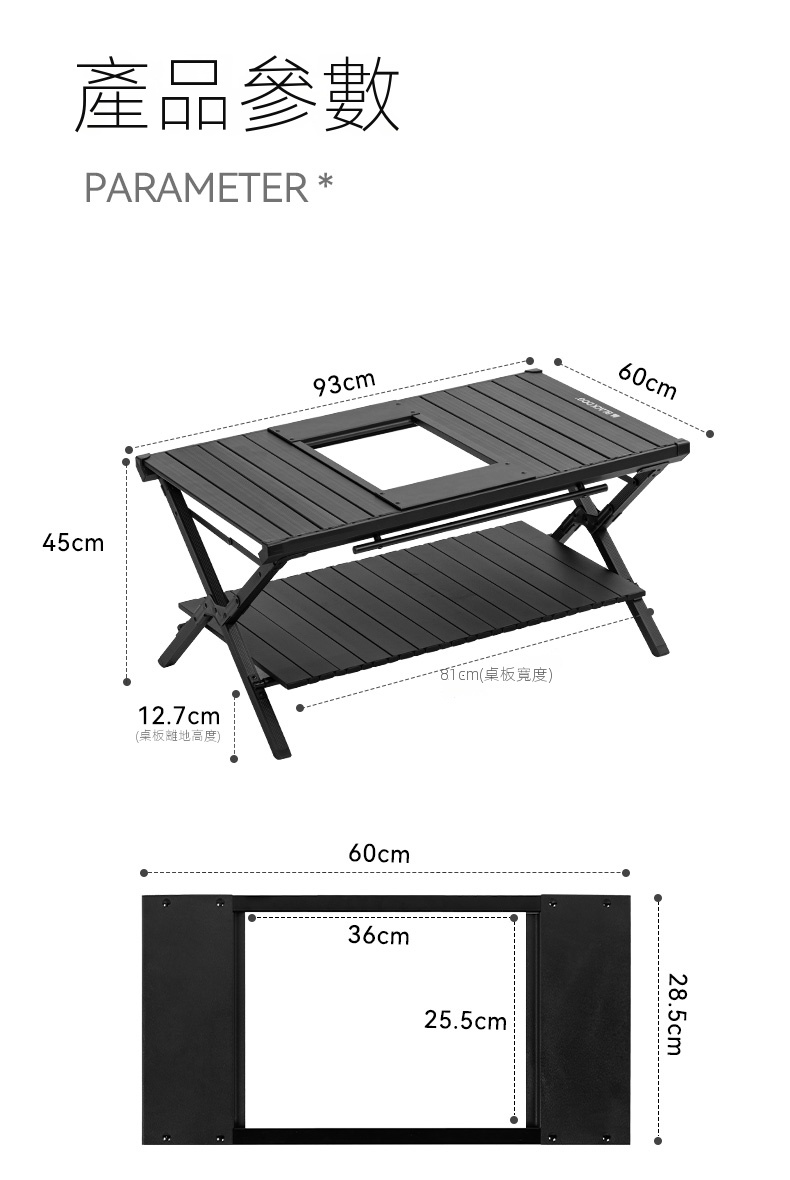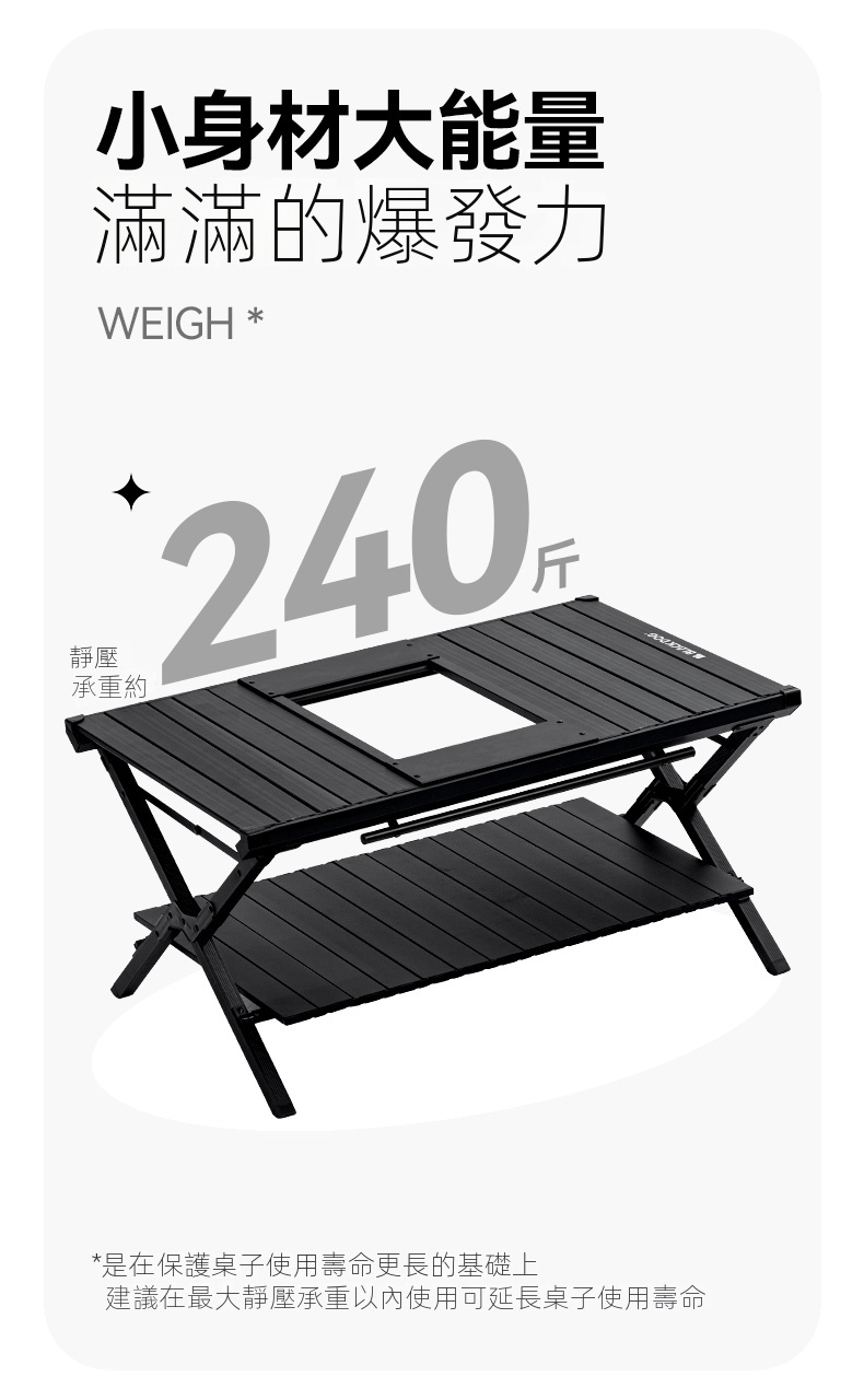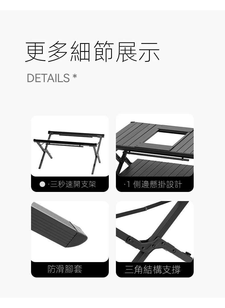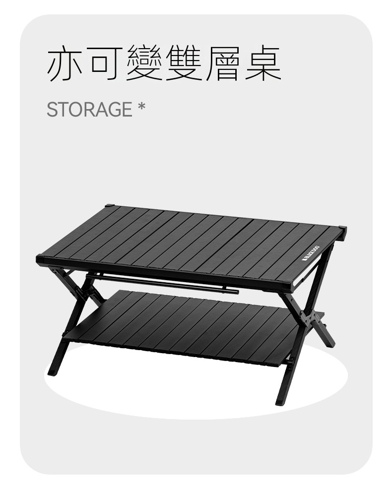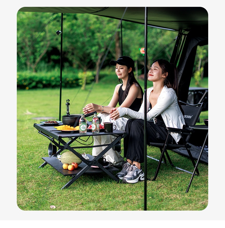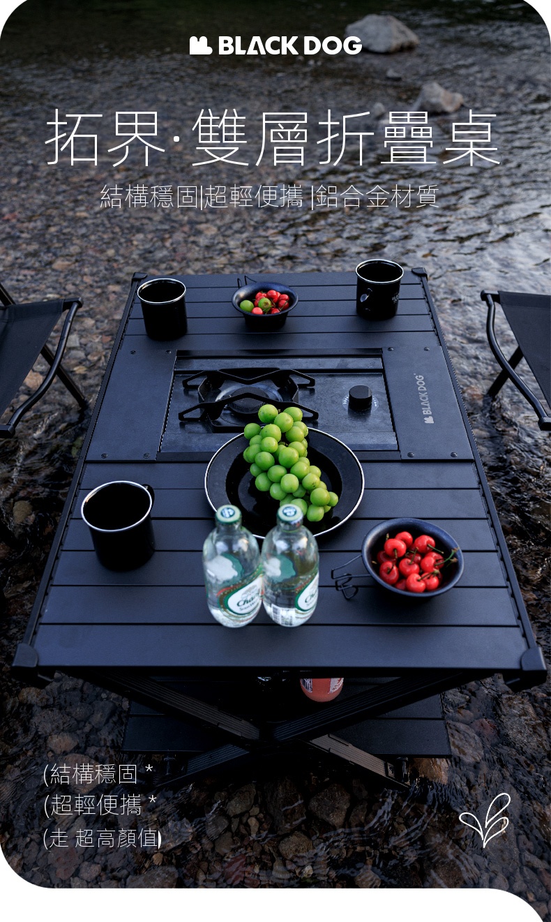 BLACKDOG IGT雙層折疊桌(CBD2450JJ011),堪稱戶外露營的絕佳拍攝檔。其選用軍工級鋁合金骨架,搭配防銹鉸鏈,堅固耐用。憑藉專利折疊關節設計,短短5秒就能快速完成安裝,展開後自動鎖定,即便是女生也可輕鬆單手操作。經典夜幕黑塗層,不僅抗刮擦,還不易顯髒,與各類黑化露營裝備都能完美適配。它的尺寸設計極為精妙,展開後可滿足多人使用需求,無論是小型聚會或家庭出行都綽綽有餘。收納時尺寸小巧,不佔過多空間,攜帶方便。同時,具備卡扣式杯架槽、防滑矽膠墊、隱藏式線材管理等貼心設計,大幅提升了使用的便利性與實用性,為戶外出行增添更多便利 。