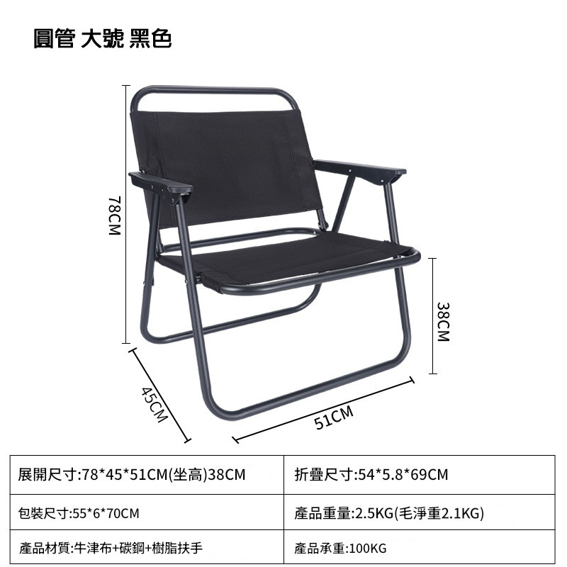 牛津布碳鋼折疊露營椅-圓管 大號 黑色 | 無需安裝 | 坐感舒適 | 即收即走