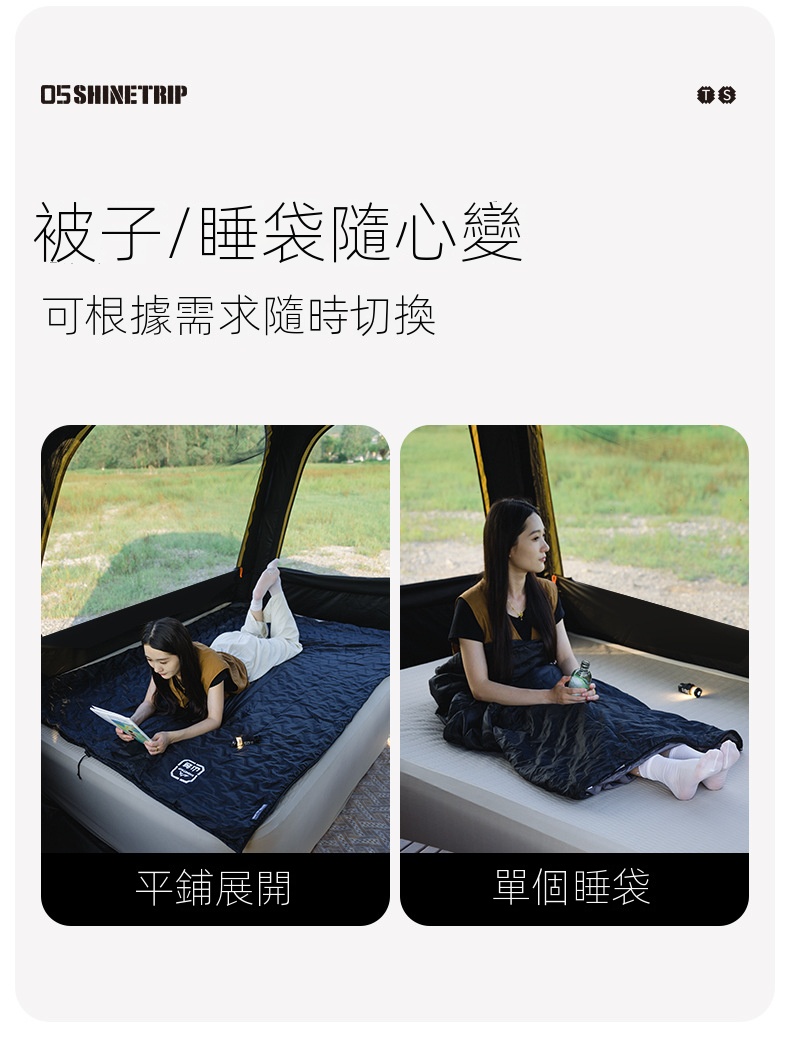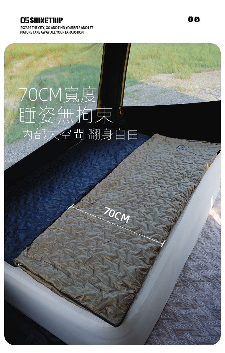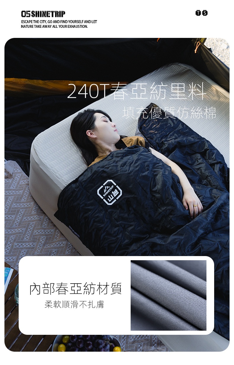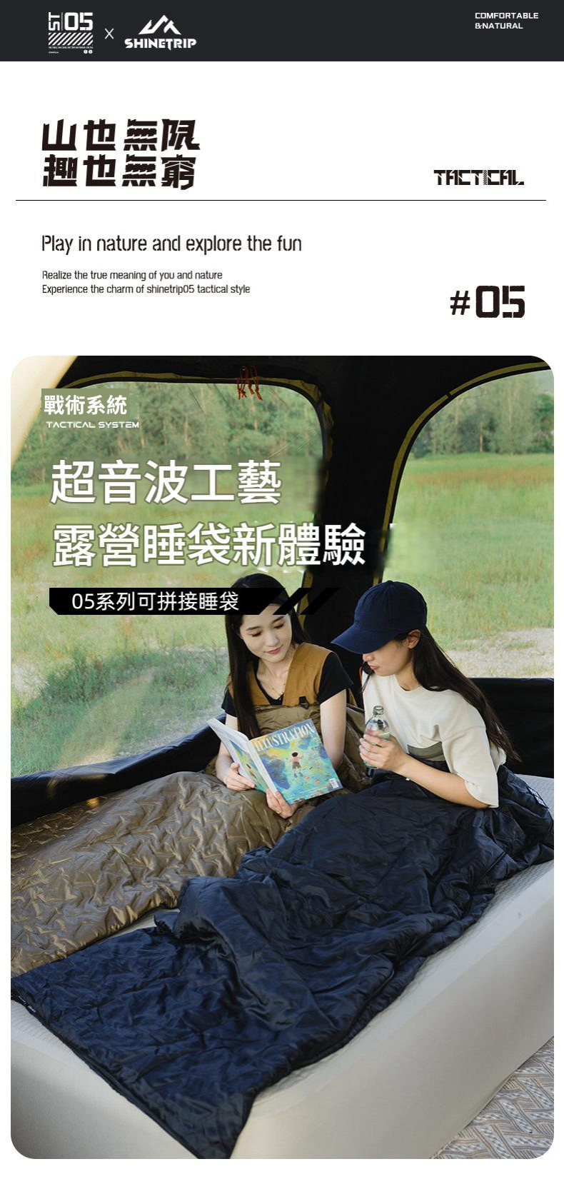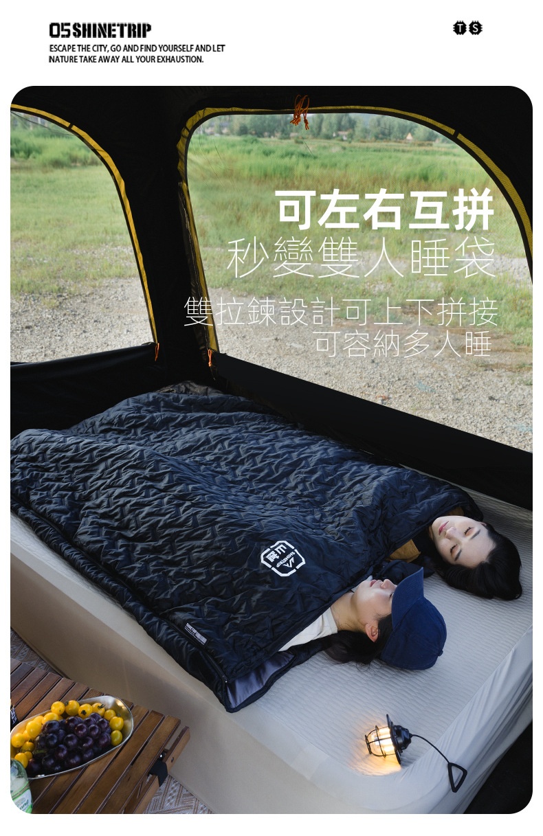 SHINETRIP 山趣 05系列 信封露營睡袋,提供透氣柔軟的舒適體驗,溫度適應範圍為5℃至15℃。獨特的雙拉鍊設計可拼接成雙人睡袋,底部拉鍊方便自由伸腳。它提供充裕睡眠空間,收納後體積小巧輕便易攜帶。無論露營或日常使用,都能享受舒適好眠。