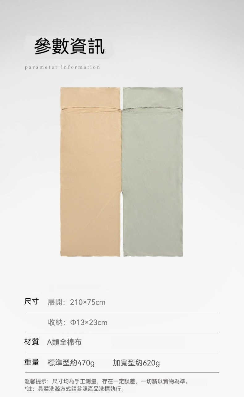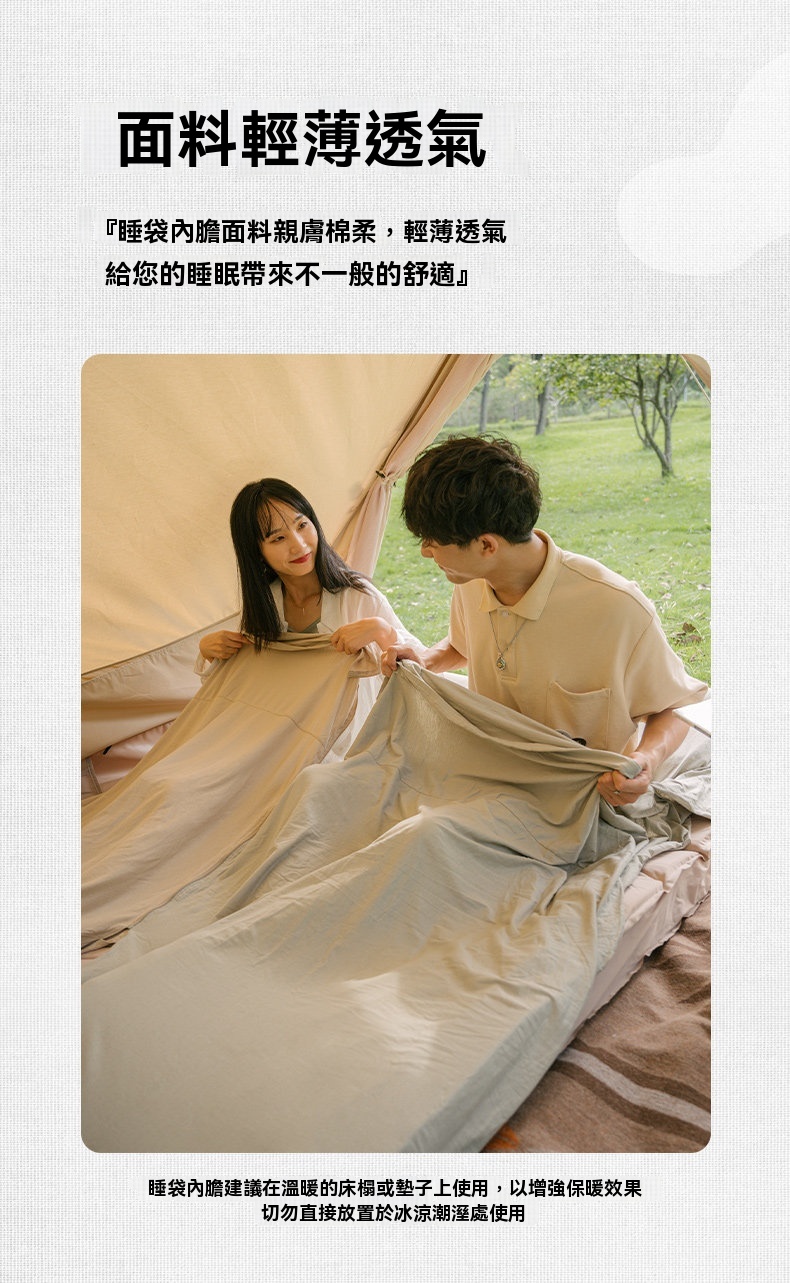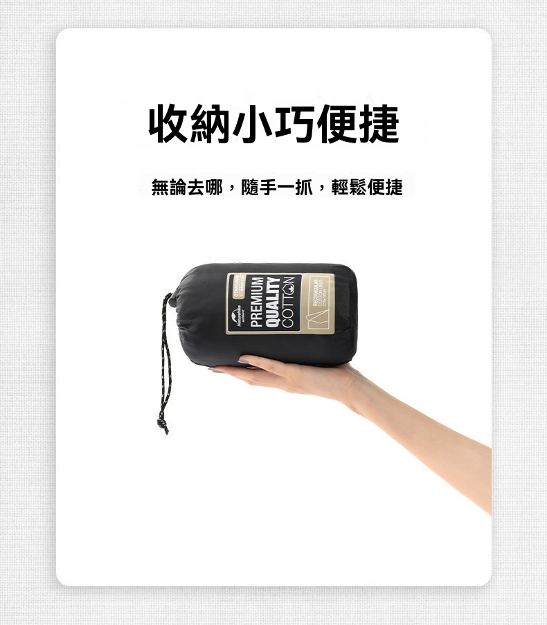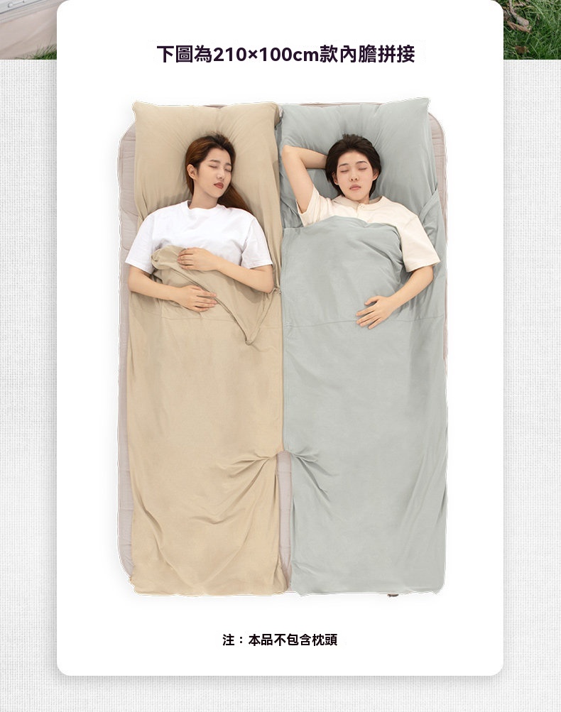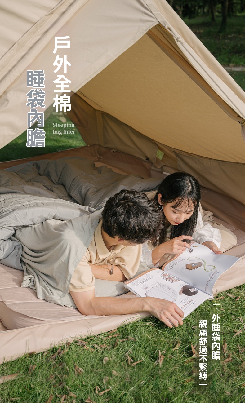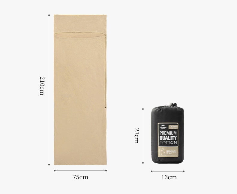 Naturehike 棉質睡袋內膽採用優質全棉面料製成,輕薄透氣、親膚柔軟,可作為睡袋內襯使用,有效隔離髒污並提升睡眠舒適度。內膽具備可拼接設計與加寬空間,能靈活配合雙人使用或滿足各種睡姿;枕部頭套設計便于固定枕頭,不易滑脫。收納後小巧輕便,無論是戶外露營、出差旅行或居家備用,皆能輕鬆攜帶,為你提供潔淨、安心的睡眠環境。