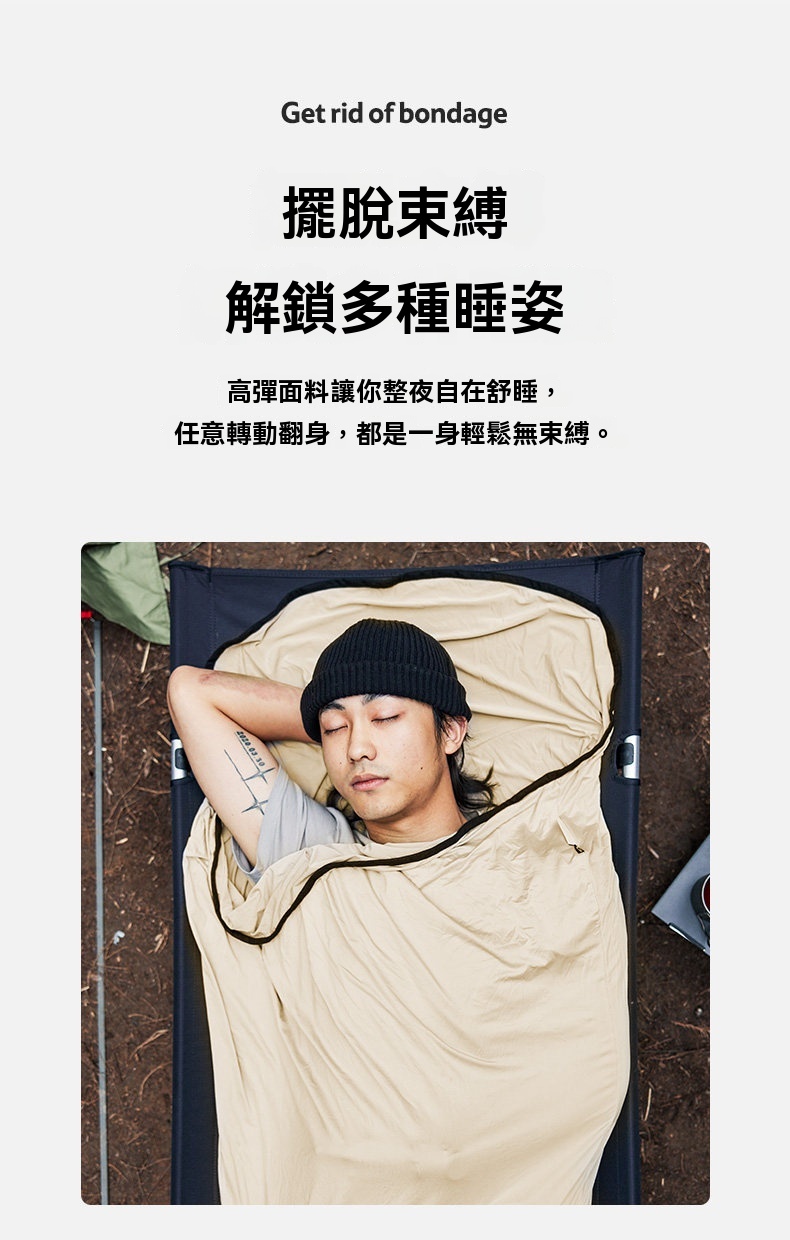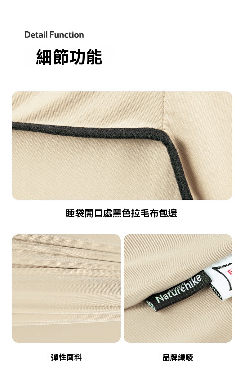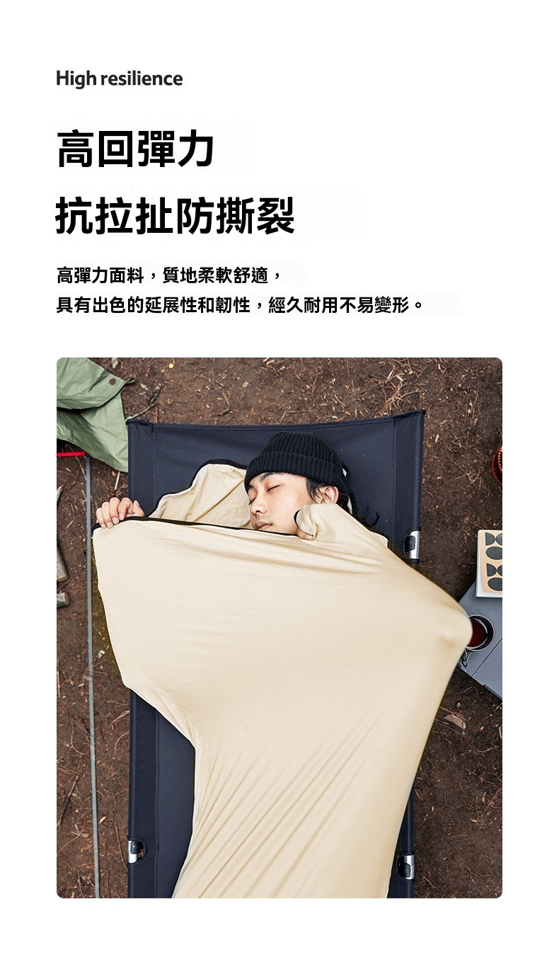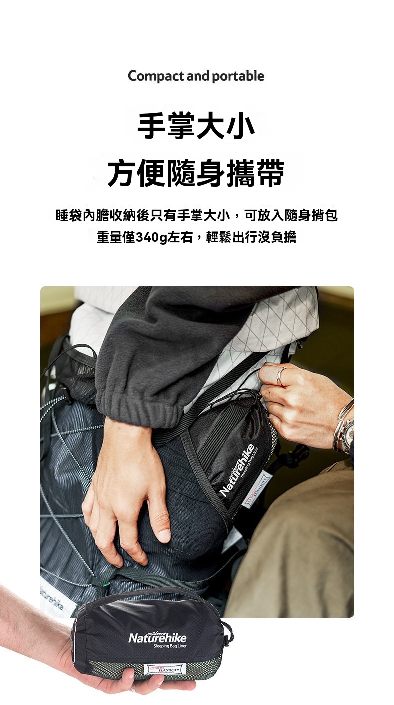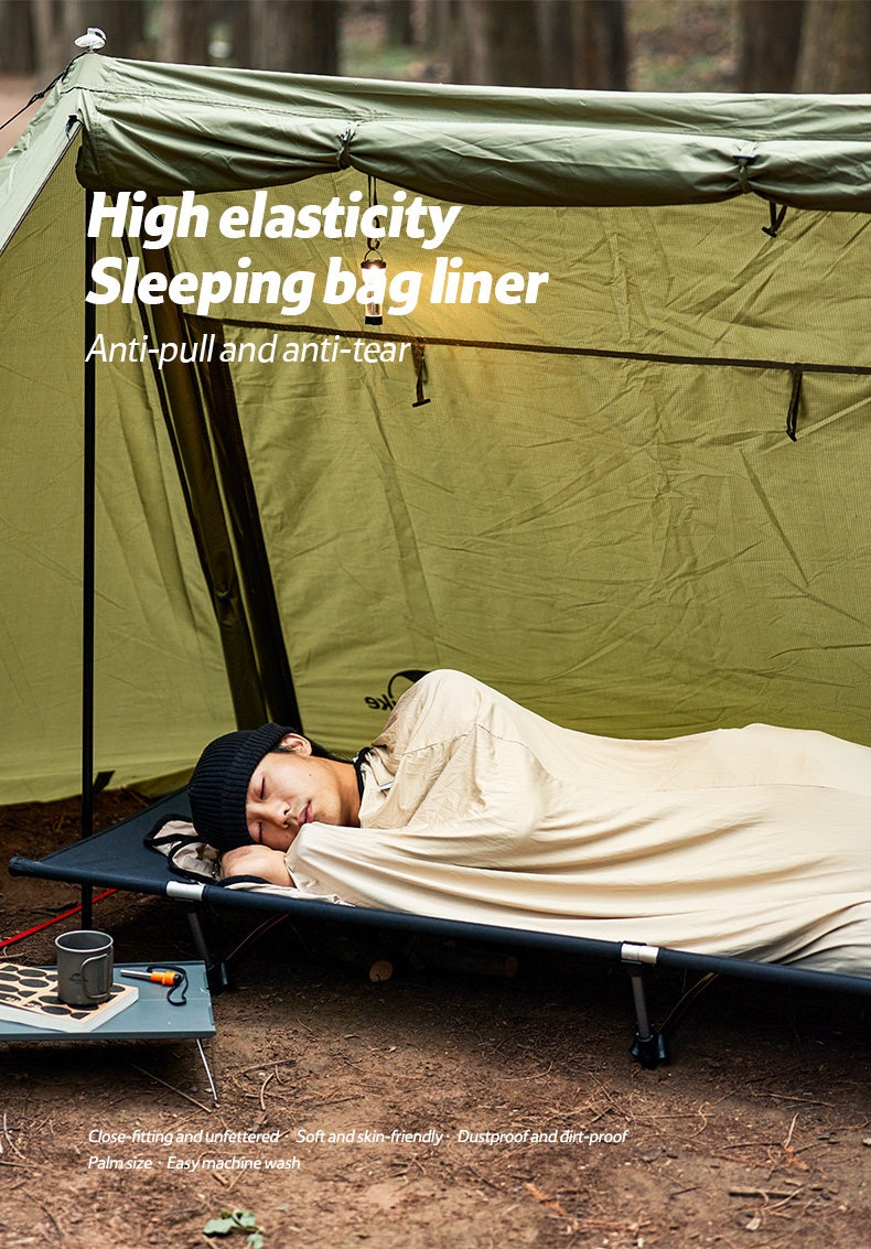 Naturehike 高彈性超輕睡袋內膽採用高回彈面料製成,柔軟親膚且具優異延展性,讓你整夜翻身無束縛,解鎖多種睡姿。內膽可防塵隔髒,保護睡袋清潔,同時具備透氣防潮特性,保持睡眠舒爽。收納後僅手掌大小,輕巧易攜;可直接機洗,方便打理。無論是戶外露營、旅行住宿或居家使用,皆能為你帶來潔淨、舒適且自由的睡眠體驗。