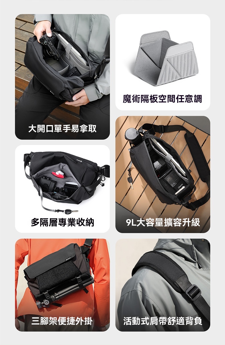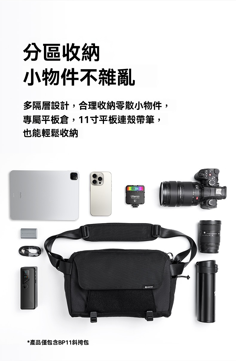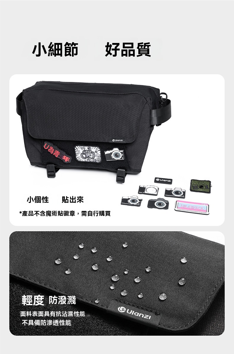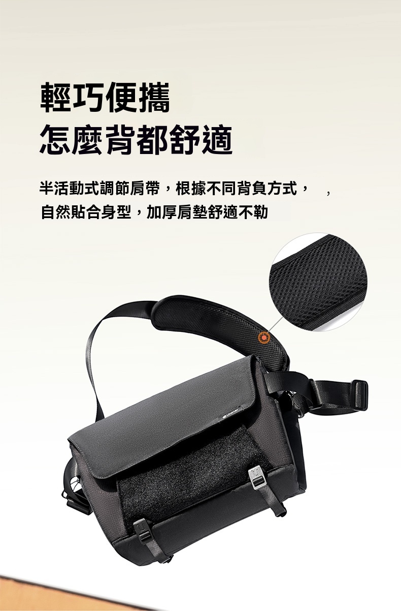 Ulanzi BP11 斜挎包是一款專為攝影愛好者設計的多功能輕便包,適合日常出行與專業攝影需求。該包採用聚酯纖維材質,外觀簡約時尚,容量可從8L擴容至9L,滿足多樣化裝備儲存需求。包內設有多隔層設計,包括平板倉、側邊網格袋和外掛收納袋,能夠合理分類存放相機、鏡頭、平板電腦及其他小物件,保持整潔有序。 肩帶採用半活動式調節設計,搭配加厚肩墊,提供舒適的背負體驗。雙拉頭防潑水拉鏈開口寬敞,單手即可輕鬆打開取物。底部外掛系統支持三腳架或雨傘懸掛,進一步提升實用性。此外,包體表面具備抗沾濕性能,保護內部物品免受輕微汙漬影響。 Ulanzi BP11 斜挎包不僅功能齊全,還注重細節品質,是追求便捷與專業攝影人士的理想選擇。