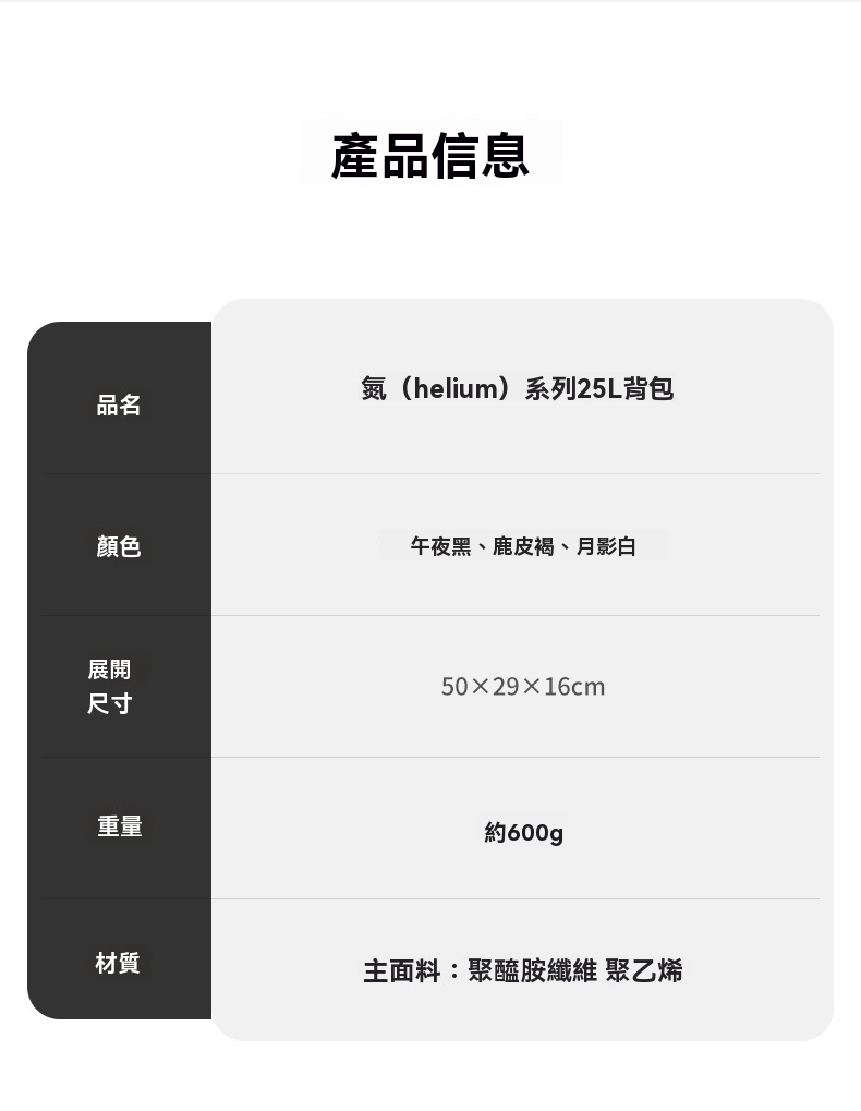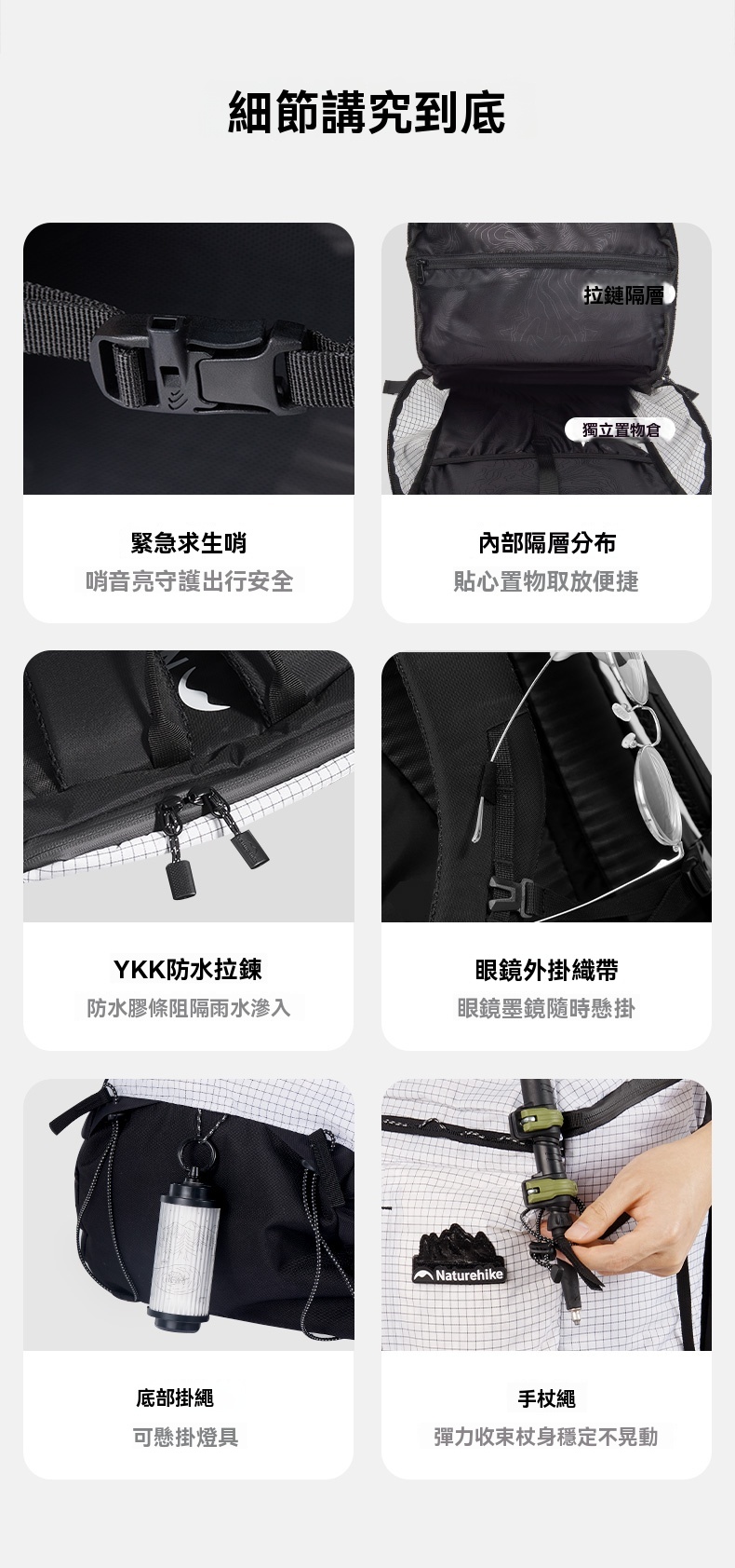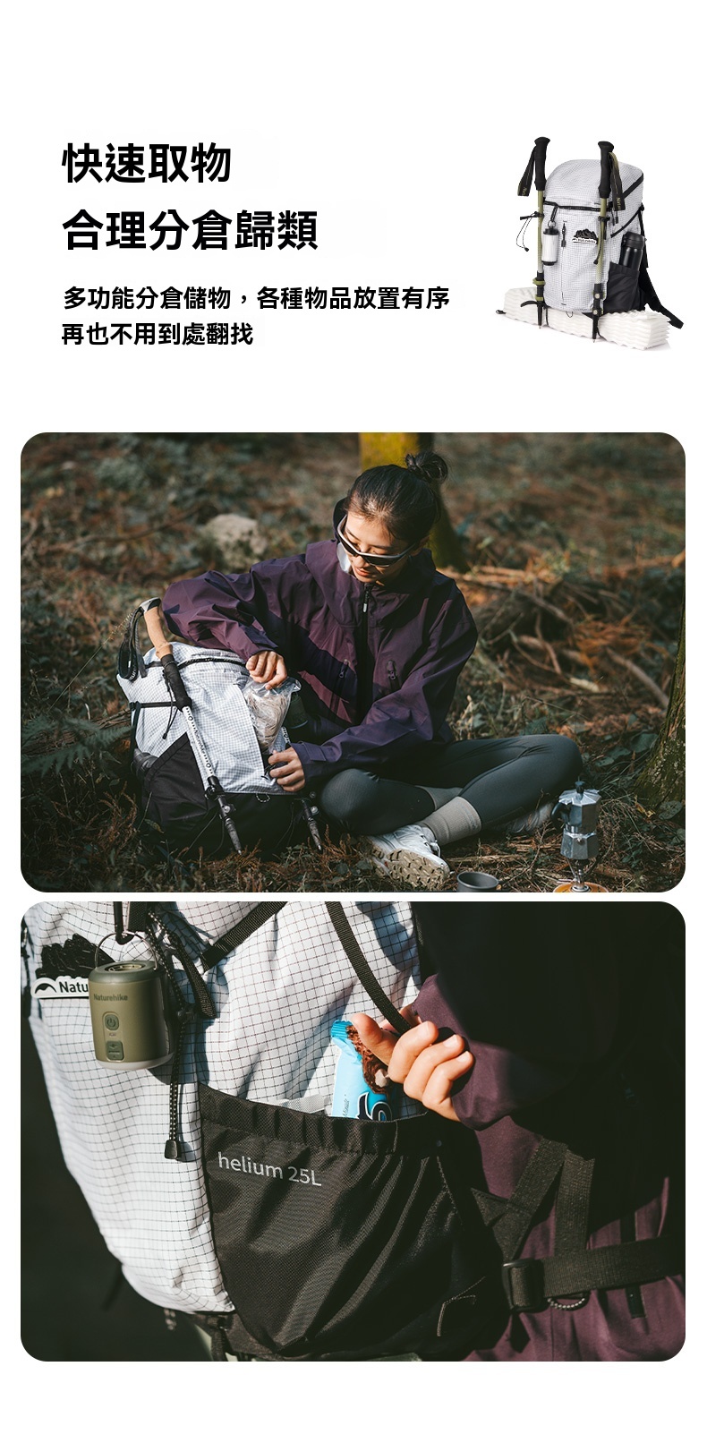 Naturehike氦系列輕量登山包,專為熱愛戶外登山人士打造。它有多種容量可選,能滿足不同行程需求。背包採用人體工學背墊與30mm加厚腰帶的減壓背負系統,科學分壓,長途健行也不累肩,背長還能無極調節。 U型大開口拉鍊,3秒即可快速取放底層裝備。選用優質布料,耐磨且具備良好的防潑水性能。多個收納口袋設計,方便分類存放物品。無論是短途徒步,或是長時間登山探險,它都是可靠夥伴,助你輕鬆奔赴山川,享受戶外樂趣。
