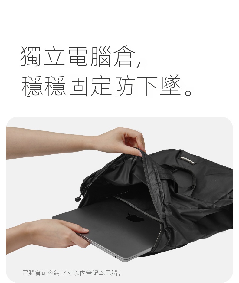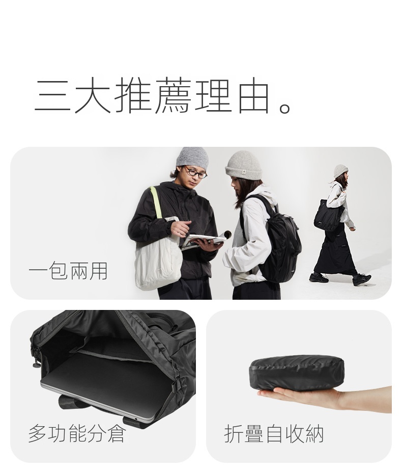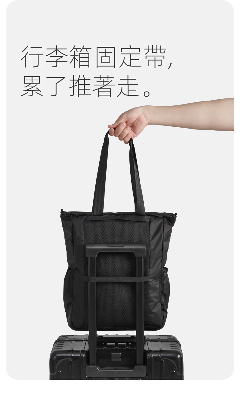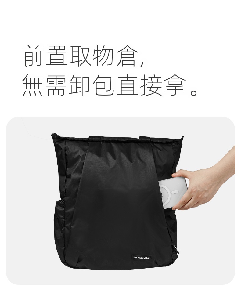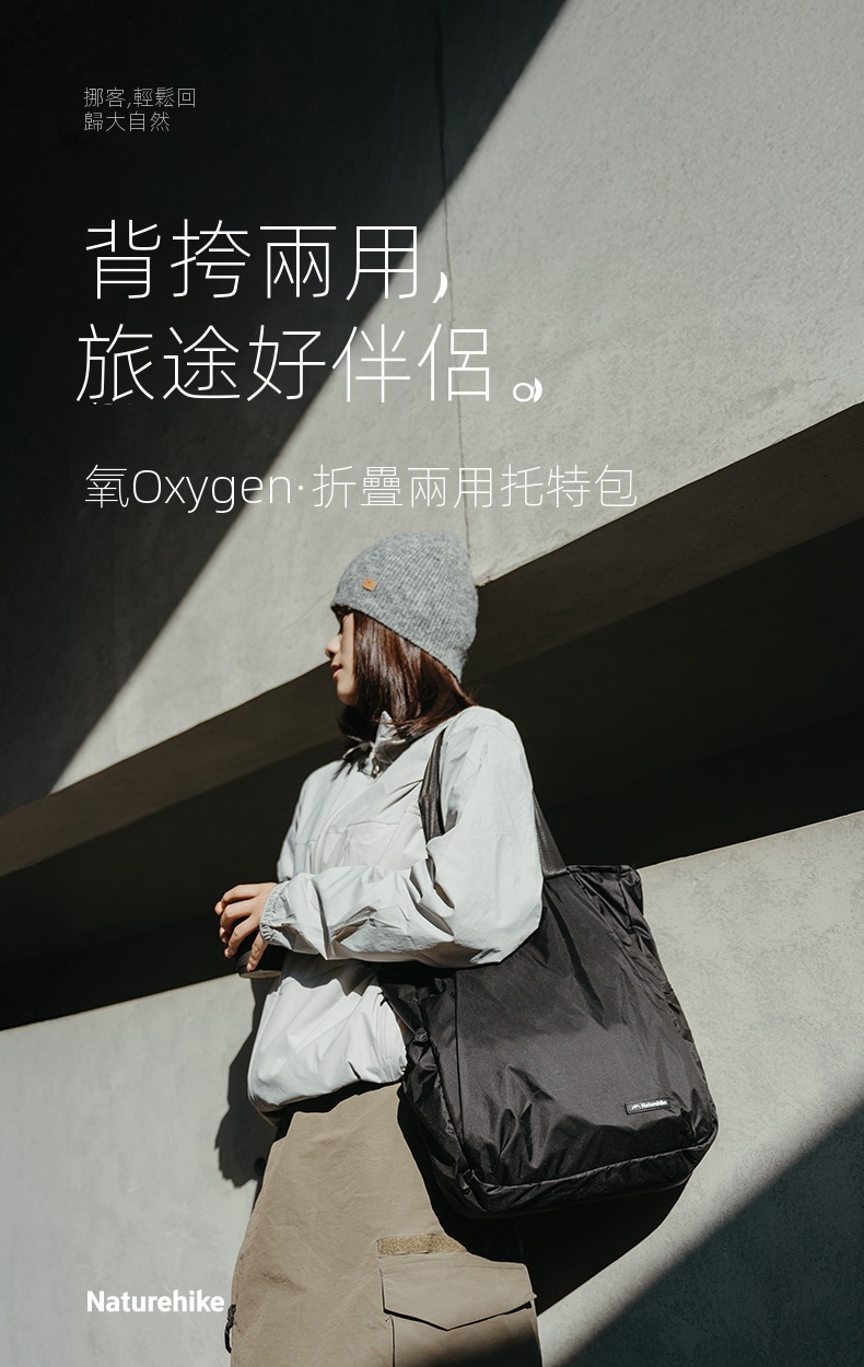 Naturehike Oxygen二合一摺叠通勤包能輕鬆切換背挎模式,一包兩用,既是休閒托特包,也是通勤雙肩包,隱藏式雙肩帶可隨時變身。自帶收納袋,摺疊後僅手掌大小,方便攜帶。大容量主倉設有獨立電腦倉,穩固承載14寸筆電;前置取物倉無需卸包即可取物。3D網格軟背墊透氣舒適,配有行李箱固定帶,長途旅行更省力。採用70D耐撕裂尼龍與無氟防潑水面料,耐用實用。細節處配YKK拉鍊,品質兼備。