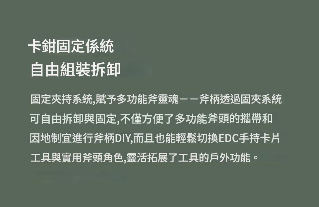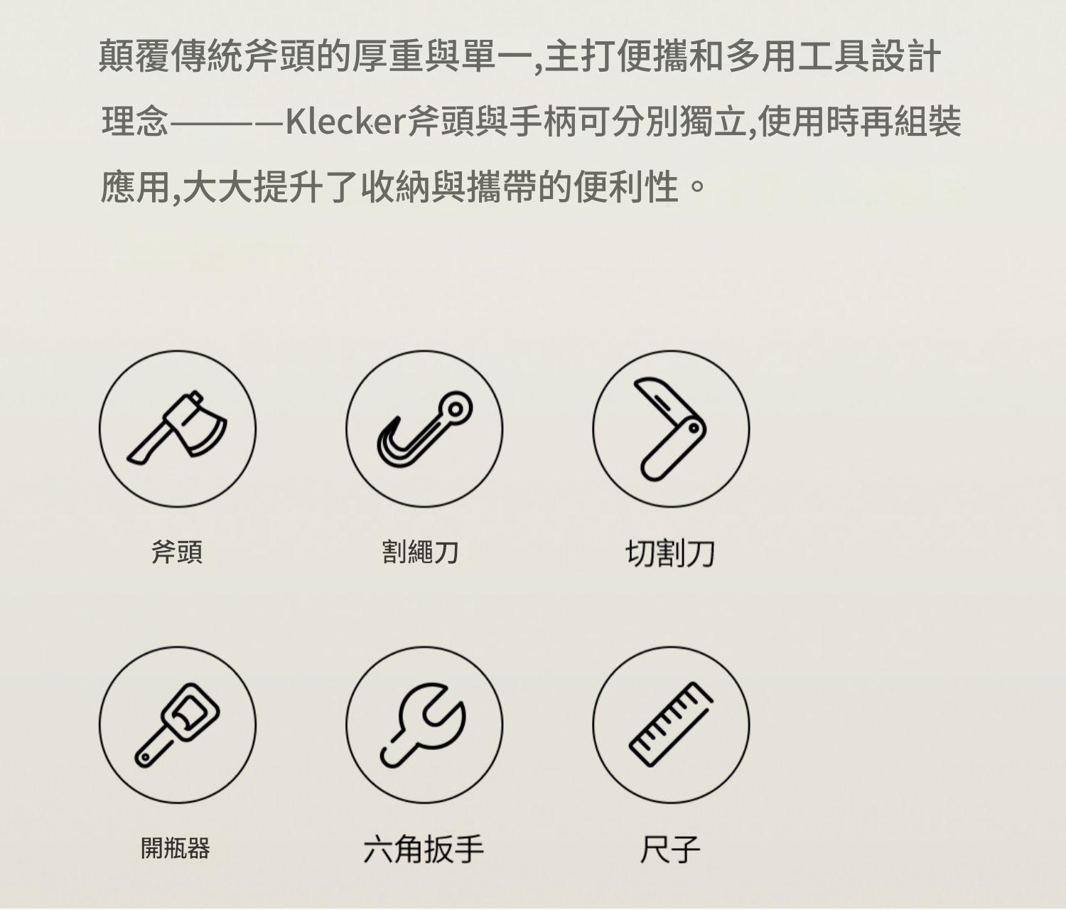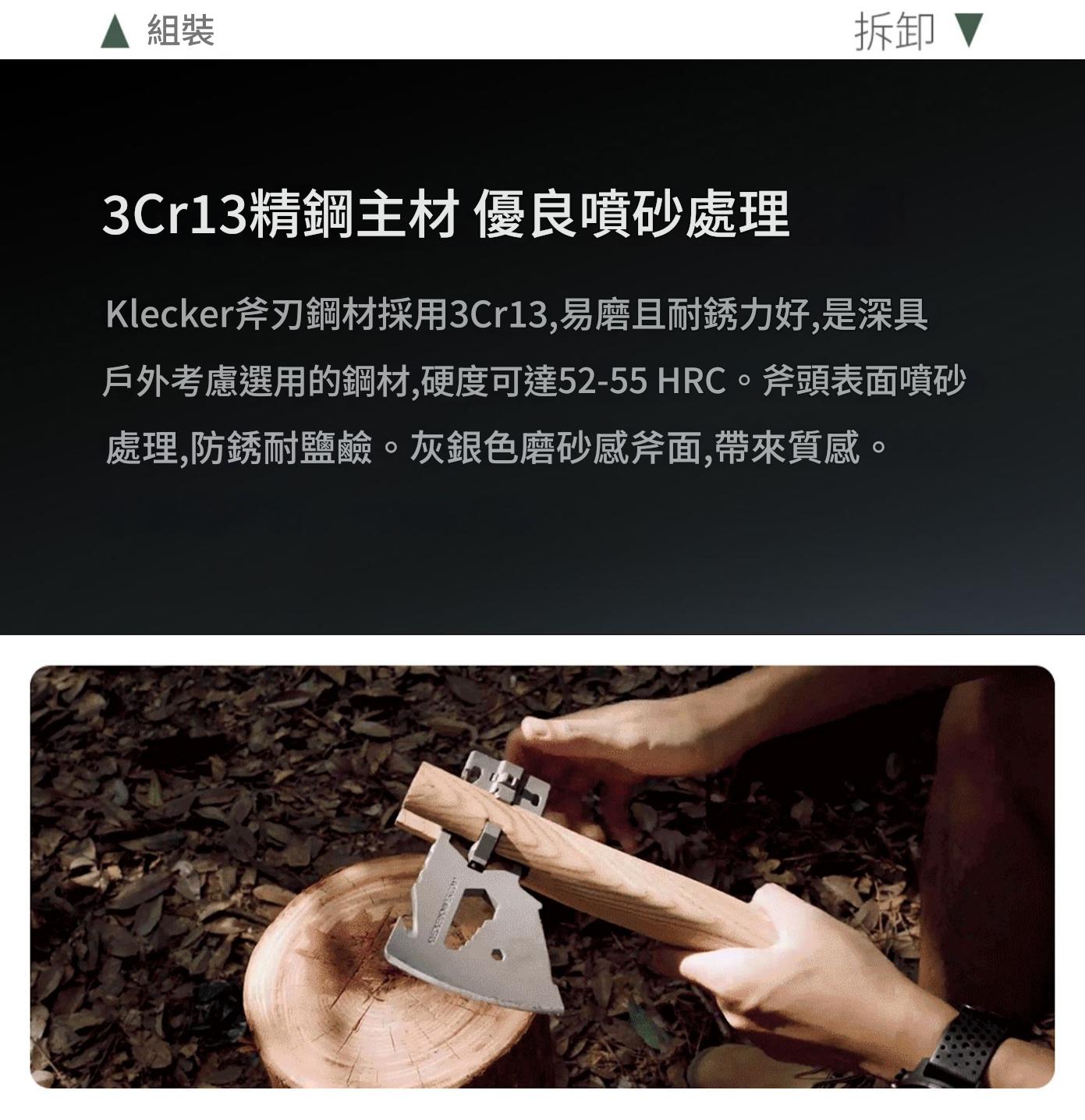 • 快拆設計:斧頭與手柄分離式設計,收納和攜帶方便,使用時簡單組裝,擰上兩顆 KLAX 螺絲、固定手柄、綁上傘繩即可完成。