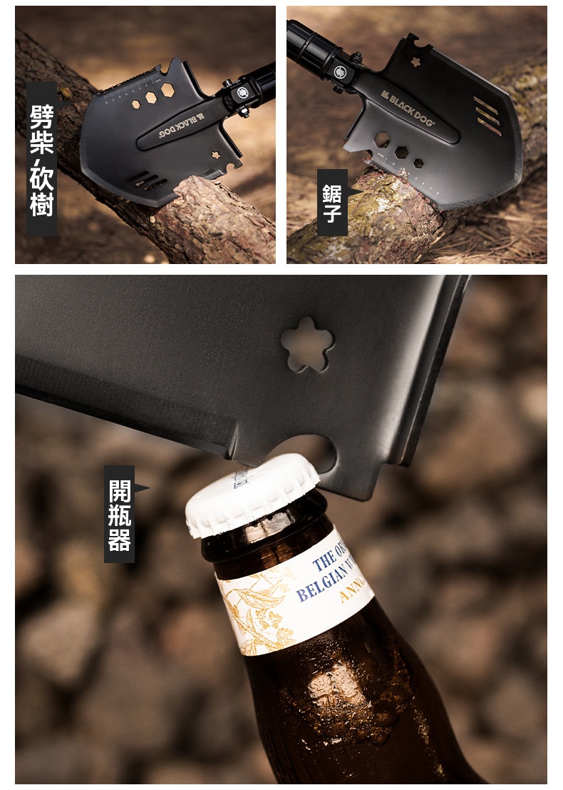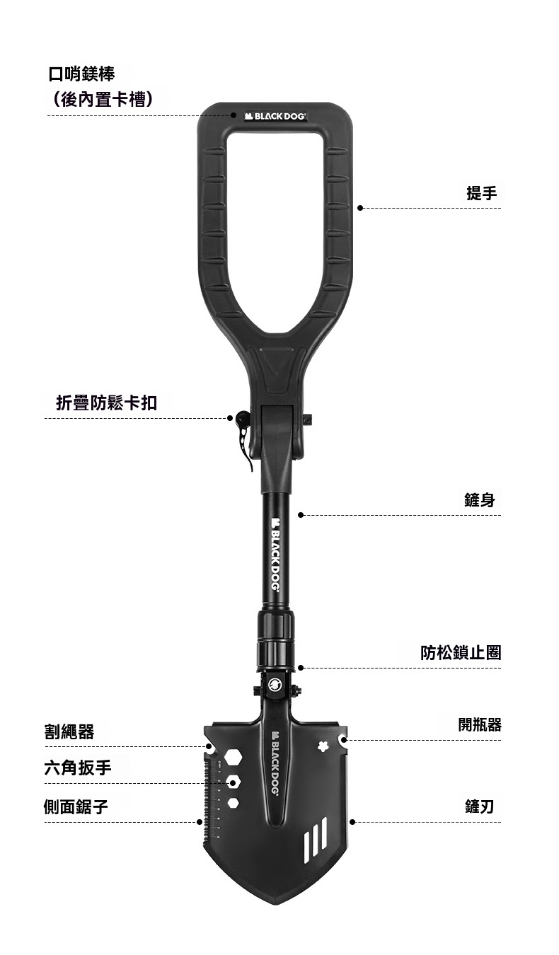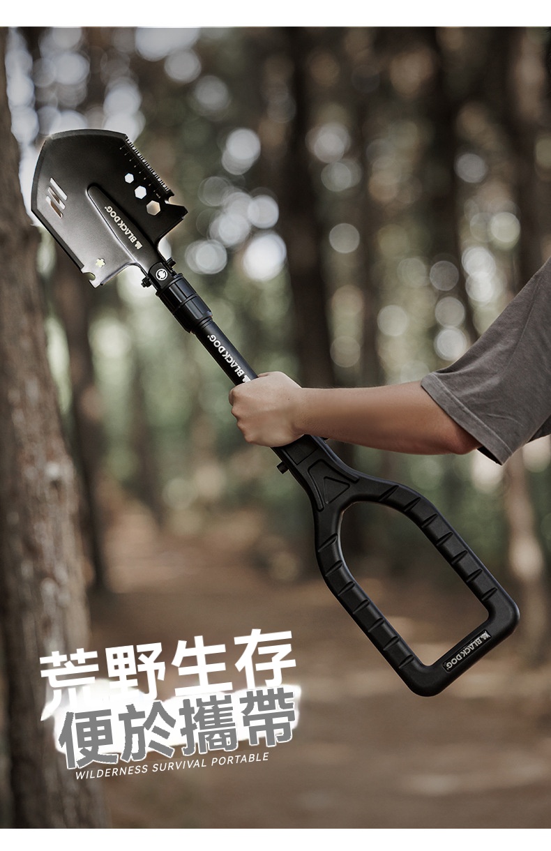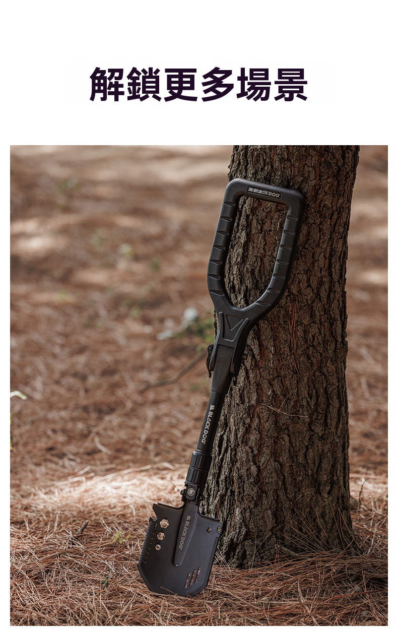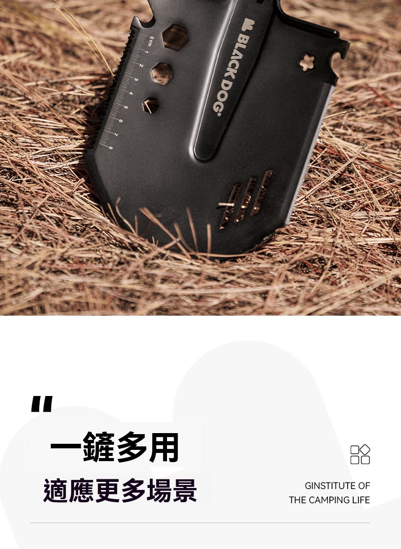 戶外露營、開車出行,怎能少了一個實用的工具? BLACKDOG Defender可折疊工程鏟(CBD2450PJ018)絕對是你的得力助手!這款工程鏟採用黑色外觀設計,酷颯十足。它具備三段折疊功能,方便收納攜帶,輕鬆放入背包或車載後行李箱。別看它能折疊,功能卻十分強大。它集鏟、刨、劈、鋸等多種功能於一身,鏟土、刨地輕鬆高效,還能用於劈柴、鋸木。同時,鏟上也設計了開瓶、取釘等實用細節,內建口哨鎂棒,在不同場景都能派上用場,是戶外愛好者的絕佳選擇 。