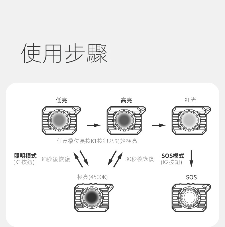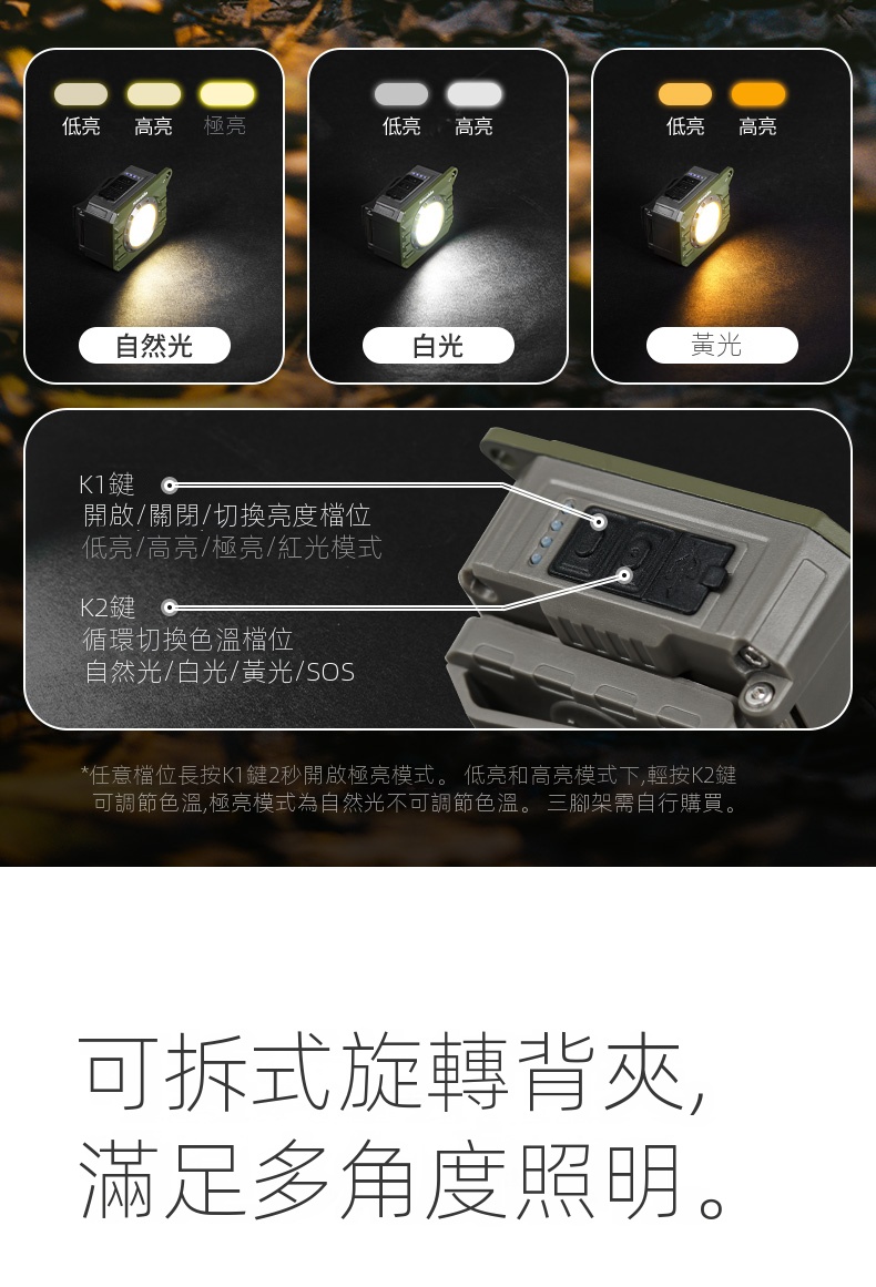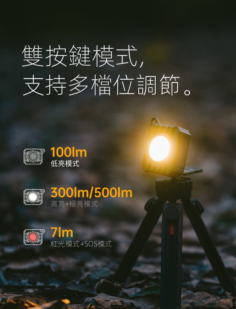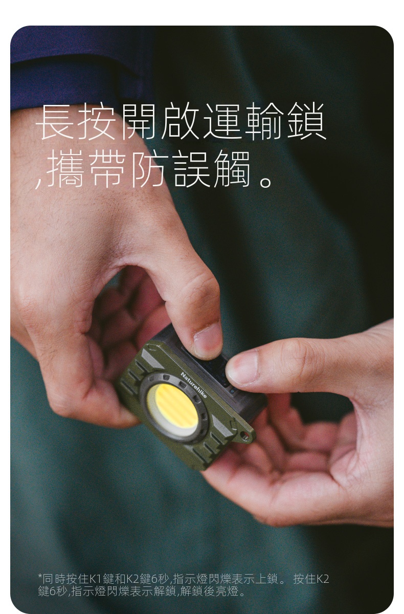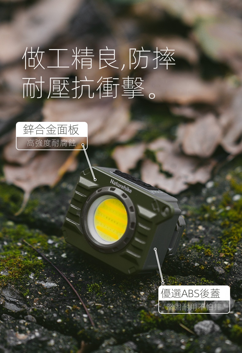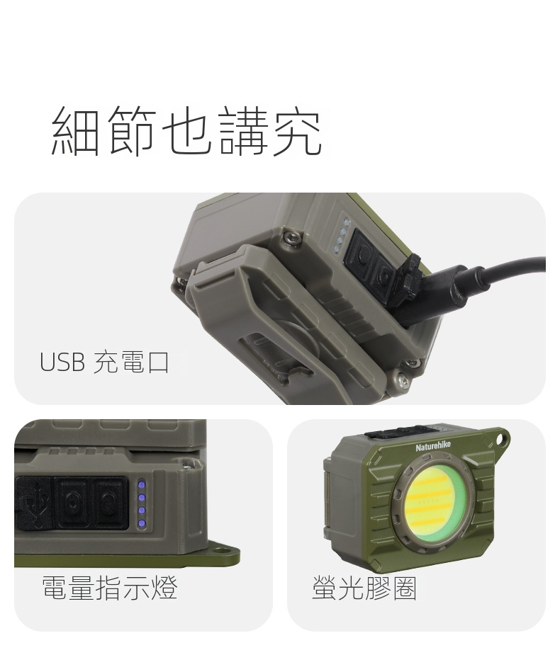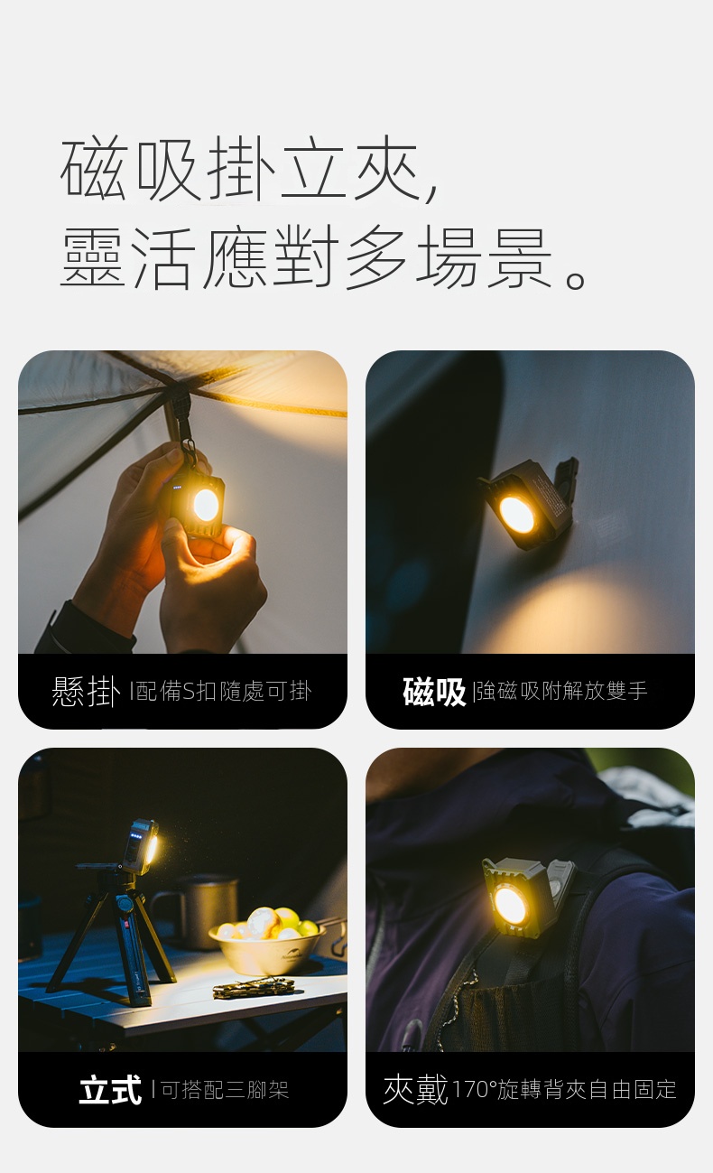 Naturehike 輝光MINI背包夾燈,輕巧便攜,迷你設計方便隨身攜帶。雙按鍵模式支持多檔位調節,包括高亮、極亮、紅光及SOS模式,滿足不同場景需求。配備可拆式旋轉背夾和磁吸掛立夾,靈活應對多種照明角度,並支援170°旋轉固定。續航時間長達數小時,適合戶外過夜使用。採用鋅合金面板與ABS後蓋,具備IPX4級防水防塵性能,耐用耐摔。USB充電口設計,內建電量指示燈,長按開啟運輸鎖功能,防止誤觸。