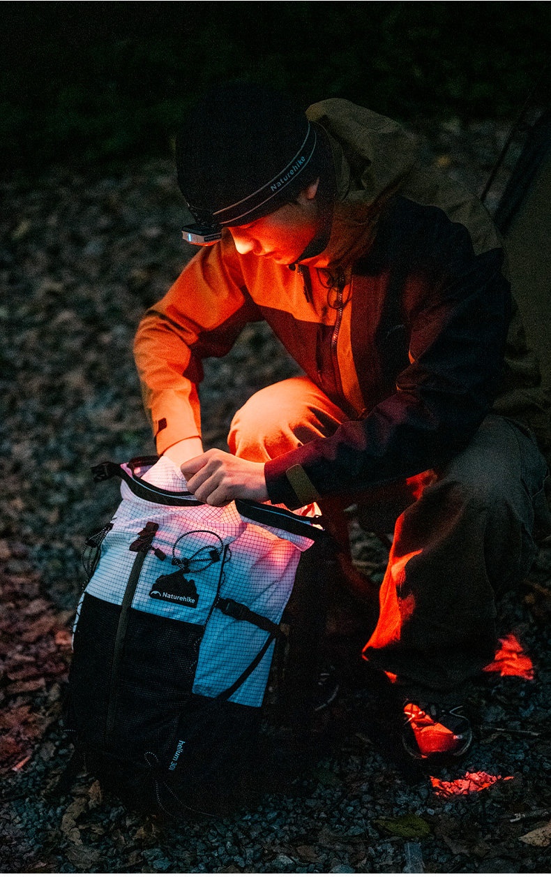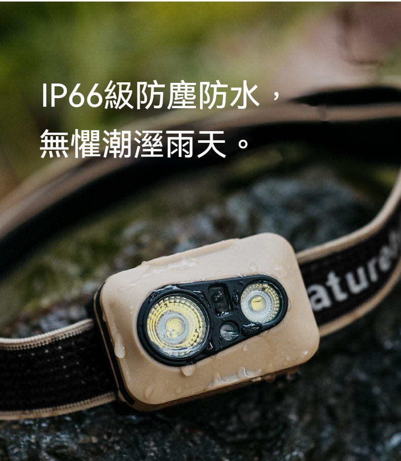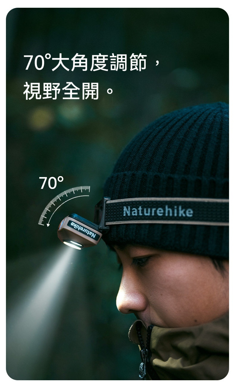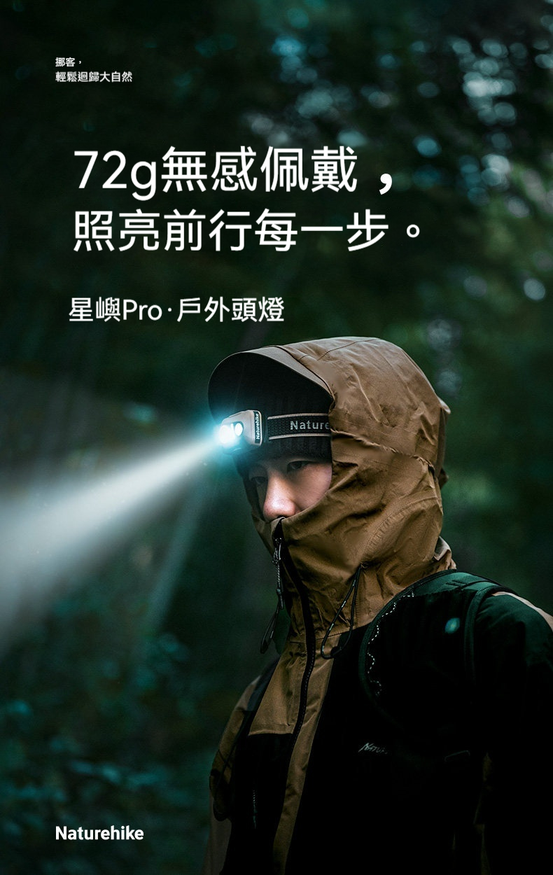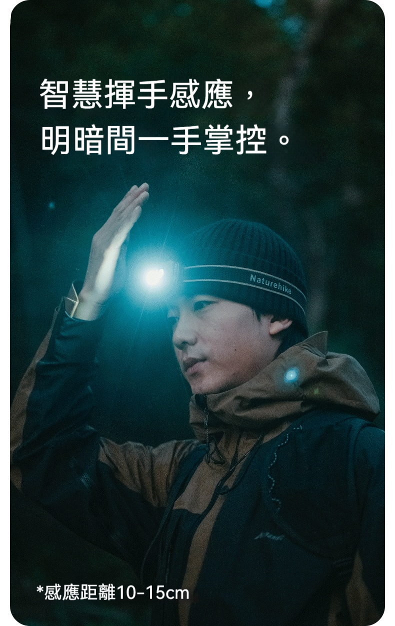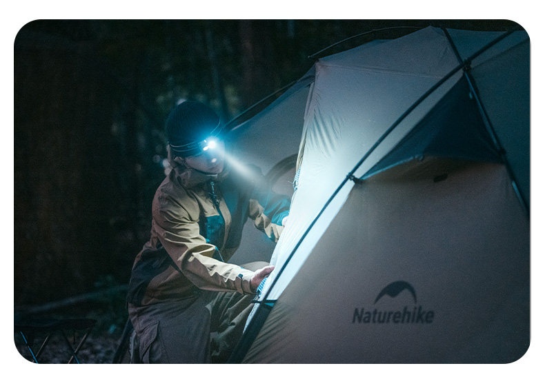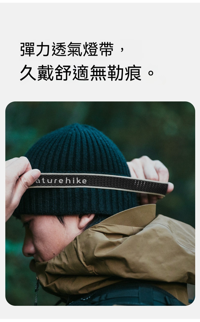 Naturehike 星嶼 · 戶外登山超輕強光頭戴式照明燈,重量僅72克,佩戴輕盈無感。採用CREE燈珠,提供400流明高亮照明,具紅白雙光源與多檔位切換。IP66防塵防水等級,無懼惡劣天氣。內建1200mAh電池,續航最長達24小時,支援Type-C充電與智慧揮手感應,70°調節角度,是徒步、露營等活動的可靠照明裝備。