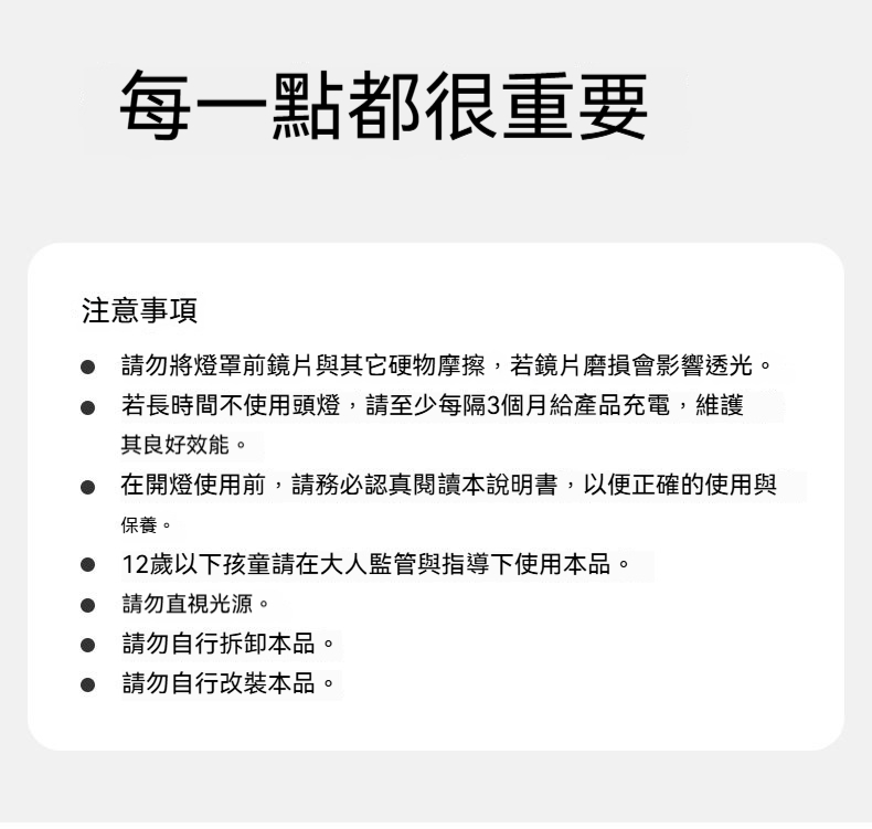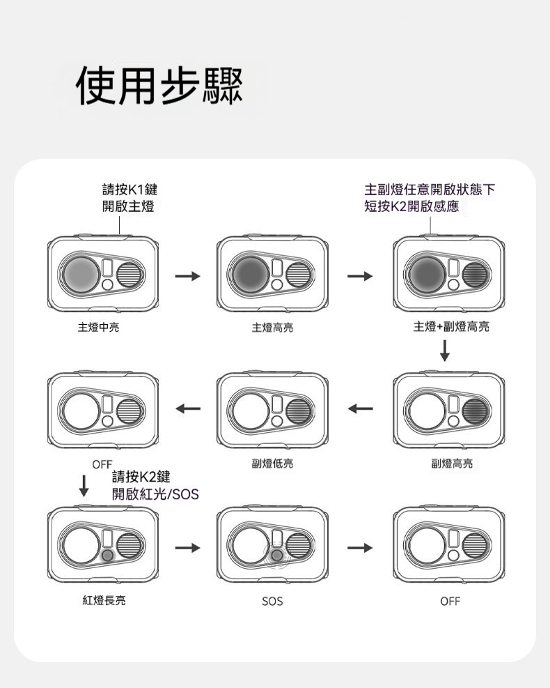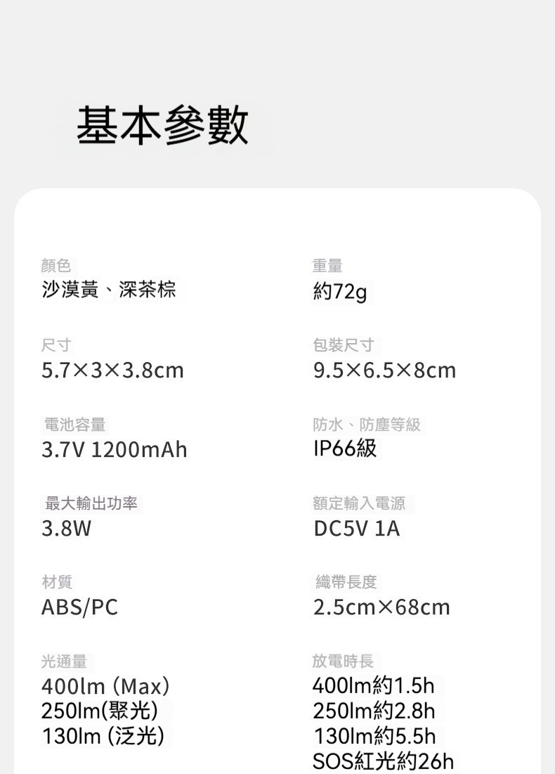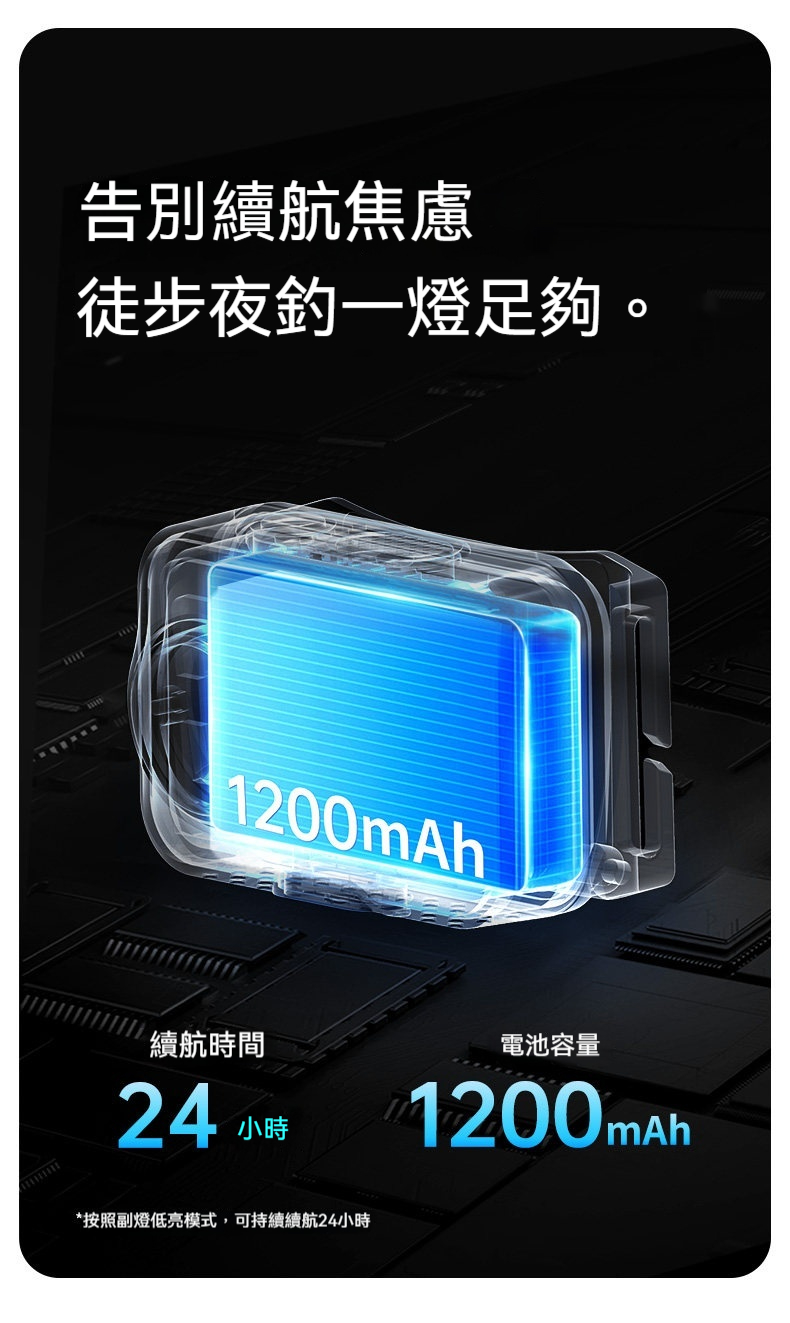 • 長效續航:1200mAh電池,副燈低亮模式可持續使用約24小時