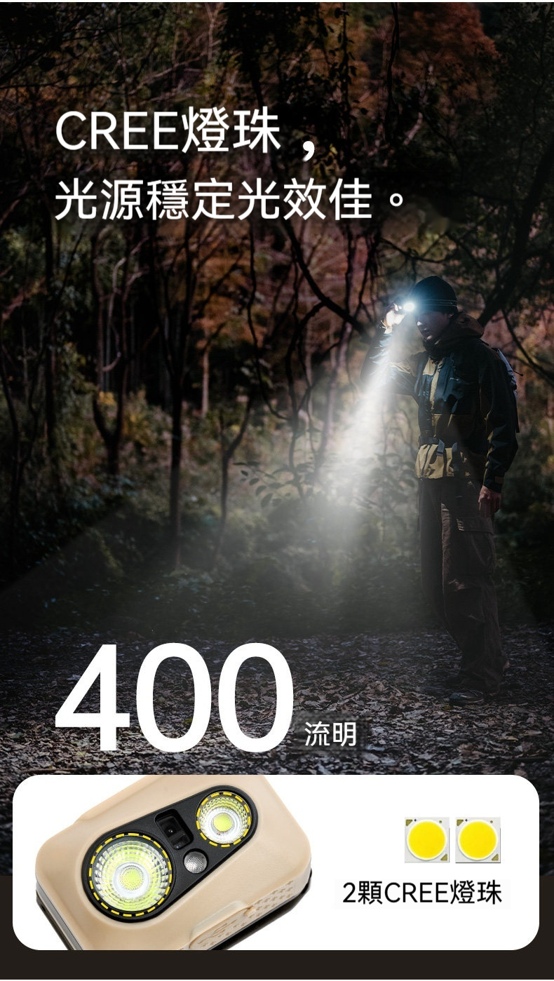 • 高亮照明:搭載2顆CREE燈珠,最大400流明,聚光、泛光及紅光多模式可選