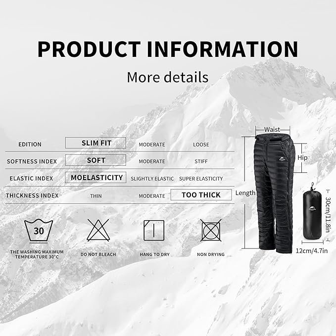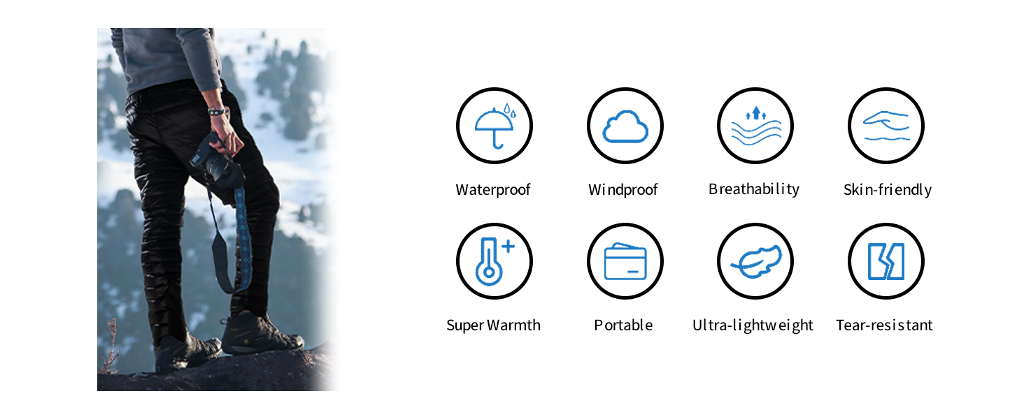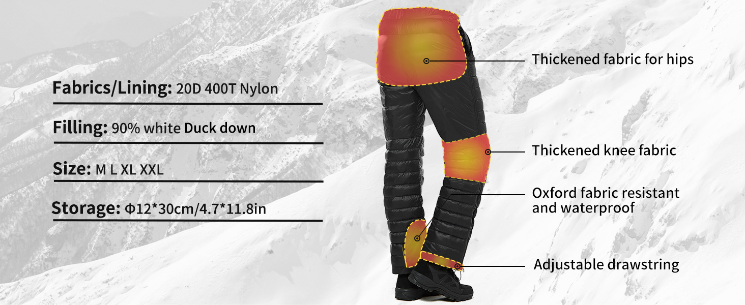 Naturehike羽裳雙面拉鍊鴨絨褲(CYY2441FS012),是寒冷時節的貼心伴侶。其含絨量高達90%,絨子含量達85.2%,精選細密蓬鬆的白鴨絨,纖維細微氣孔有效隔絕冷空氣、留存自身熱量。 20D輕柔防鑽絨布料,輕軟且經DWR技術處理,具備防潑水效果。採用德國防跑絨針與高密集針機,每3公分13針,多層防護精密鎖絨。部分款式在布料中添加石墨烯纖維,借助褲腳內纖維導電絲傳導靜電,使膝蓋處石墨烯產熱,溫暖整條褲子,伴你無懼低溫,自在出行。