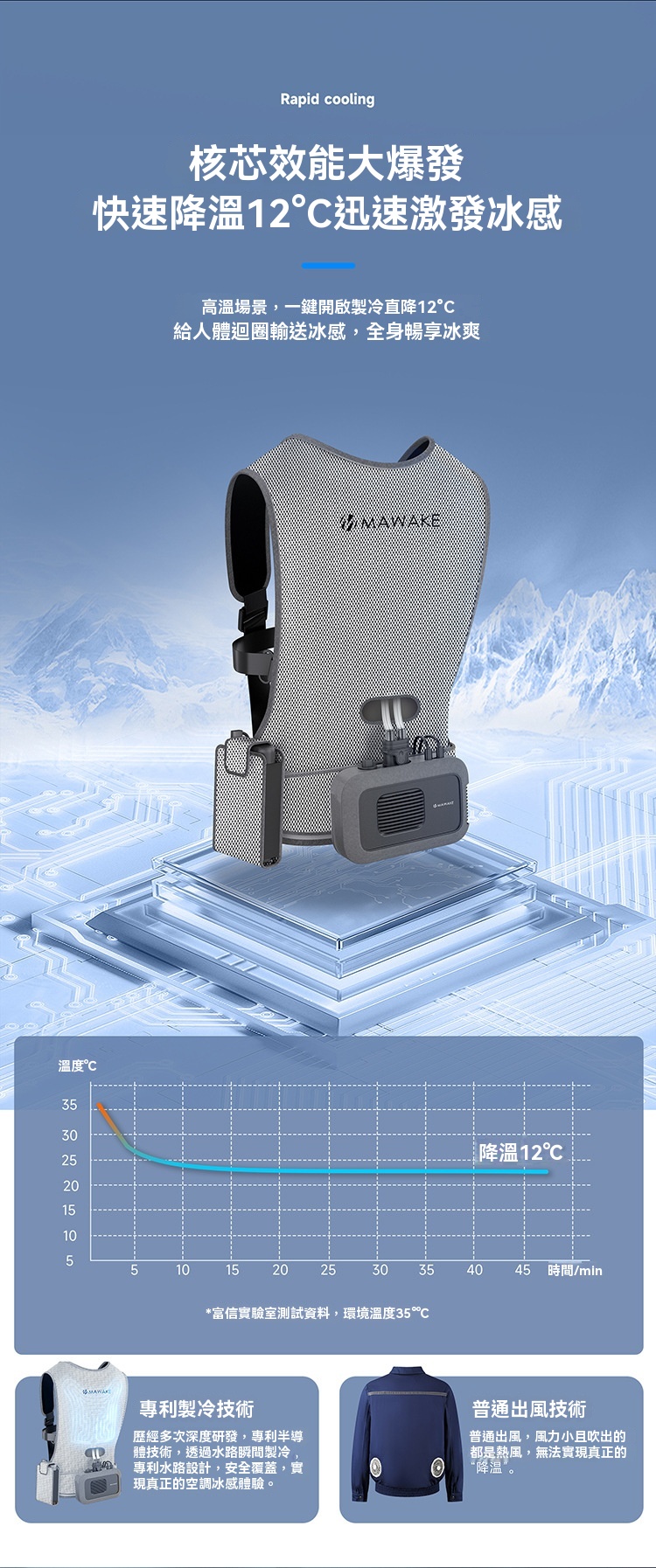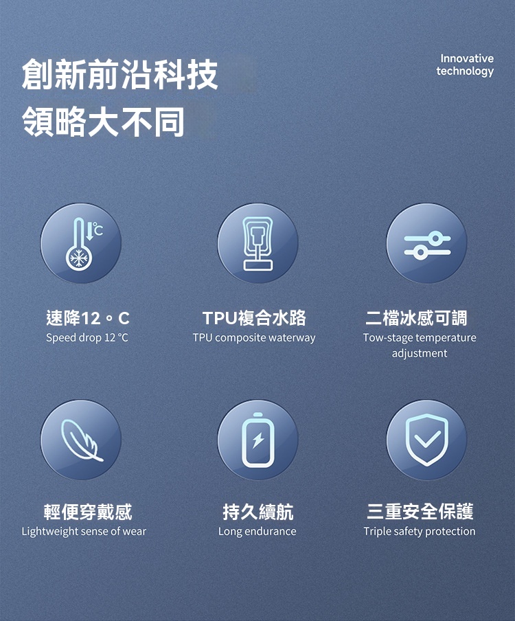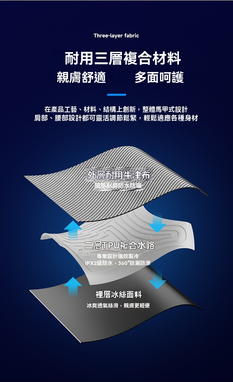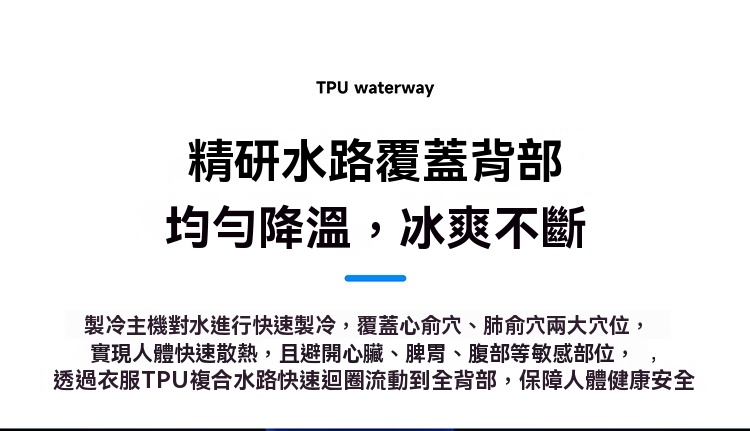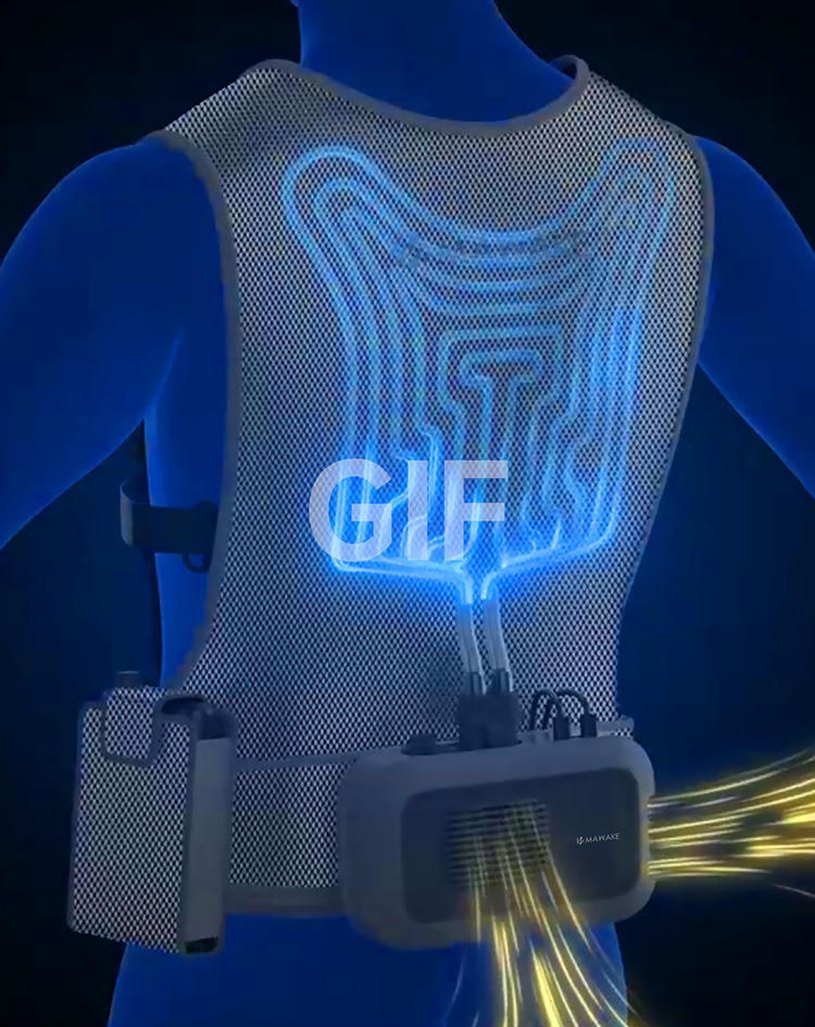 • 循環冷卻:採用水循環系統,以冰塊為冷源,冷水在衣內網格通道循環流動,快速帶走體表熱量,降溫高效。