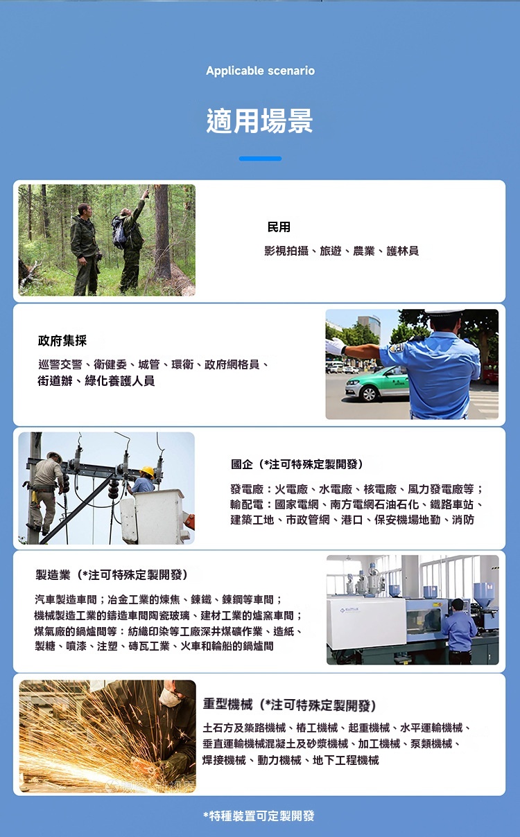 • 場景適配:專為戶外工作者及愛好者設計,快遞配送、工地作業、戶外運動等場景皆可輕鬆駕馭。