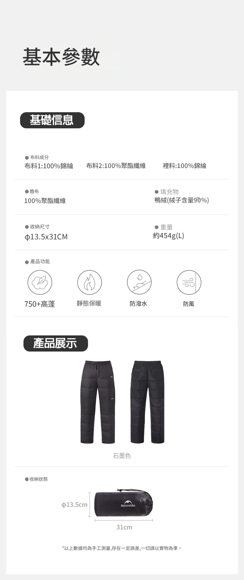 Naturehike DW-280 戶外白鴨絨保暖羽絨褲 (CNK2550FS011) - 黑色-L碼 | 靜態保暖 | 750FP+高蓬白鴨絨