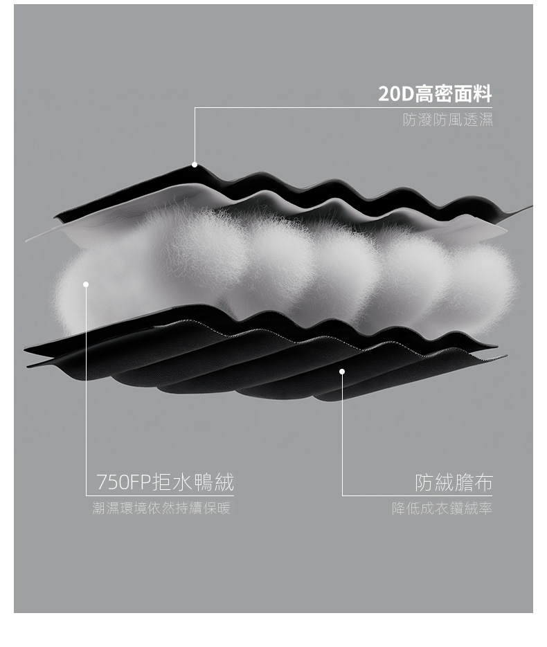 • 750FP+高蓬白鴨絨填充,輕盈保暖,適合-15至0℃環境