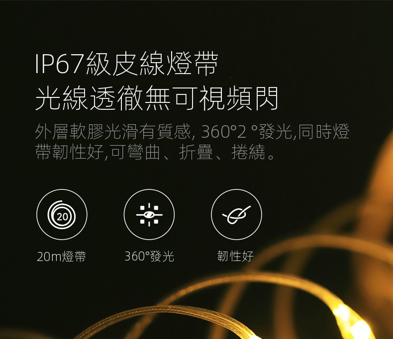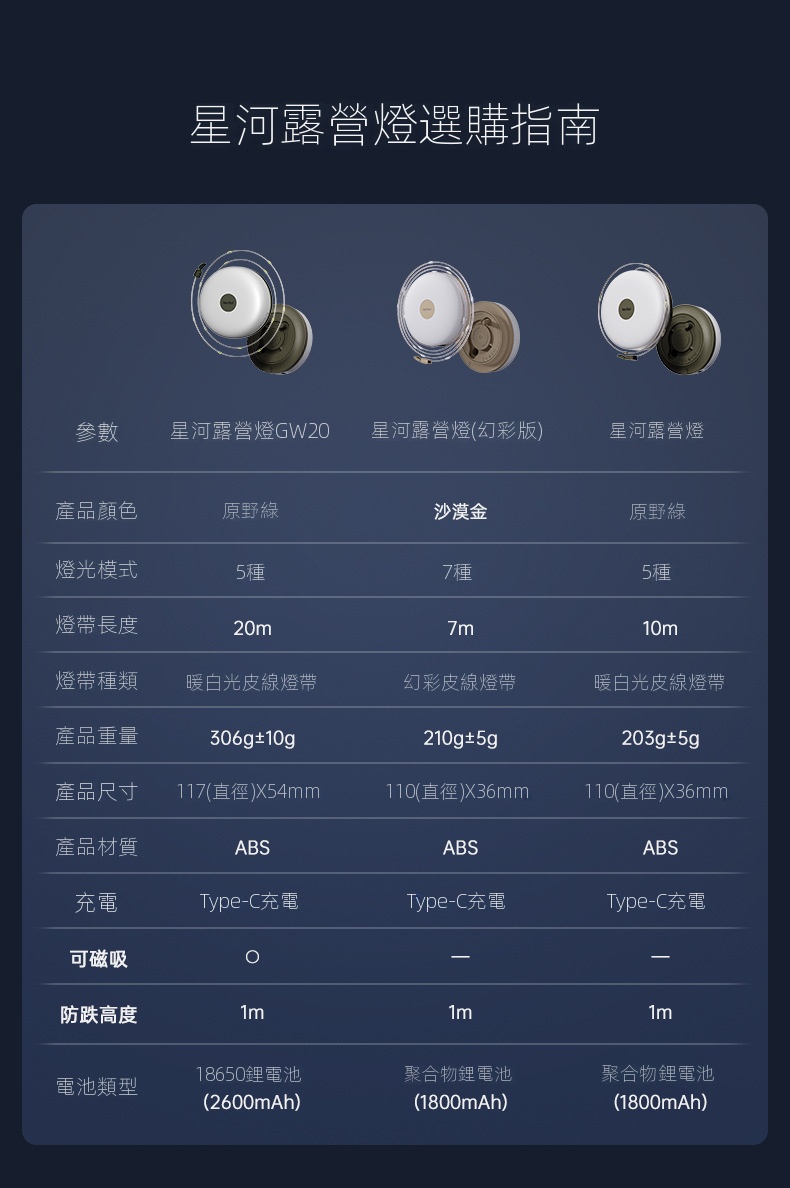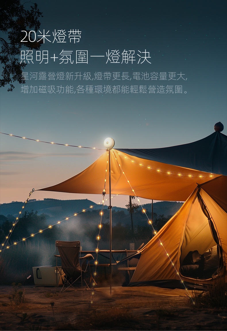 納拓GW20星河露營燈帶,升級版20米燈帶,提供全場景氛圍照明。燈帶具備5種燈光模式,配備2600mAh大容量電池,續航力強大且支持邊充邊用。採用Type-C充電接口,搭配18650鋰電池,具備過充過放保護功能,安全可靠。燈具尺寸為117mm(直徑)×54mm,輕巧便攜。燈帶採用IP67級皮線設計,360°發光,韌性佳可彎曲折疊。新增磁吸功能,多角度固定,實現多樣化照明需求。無論是露營還是戶外活動,都能輕鬆營造完美氛圍。