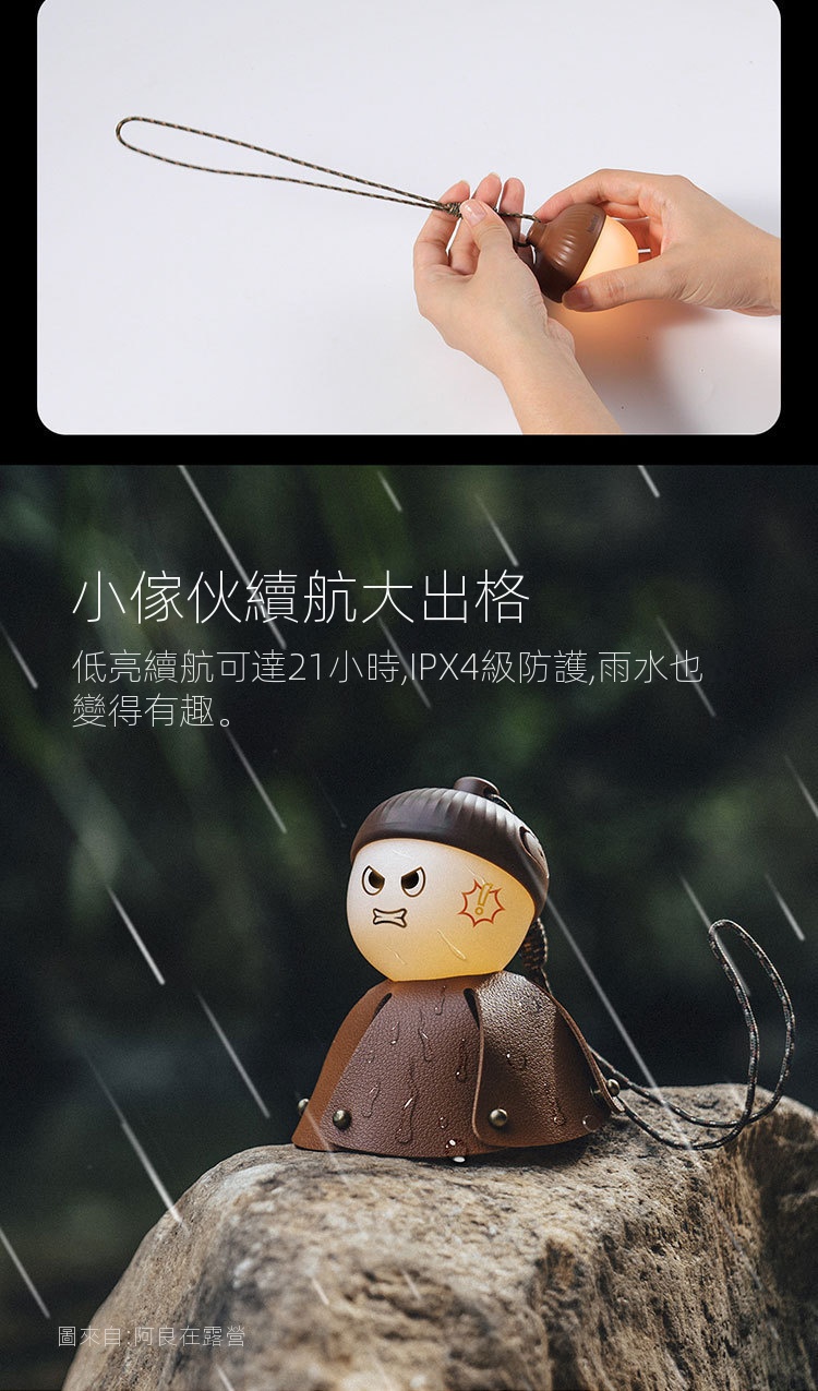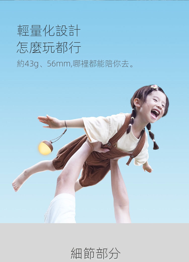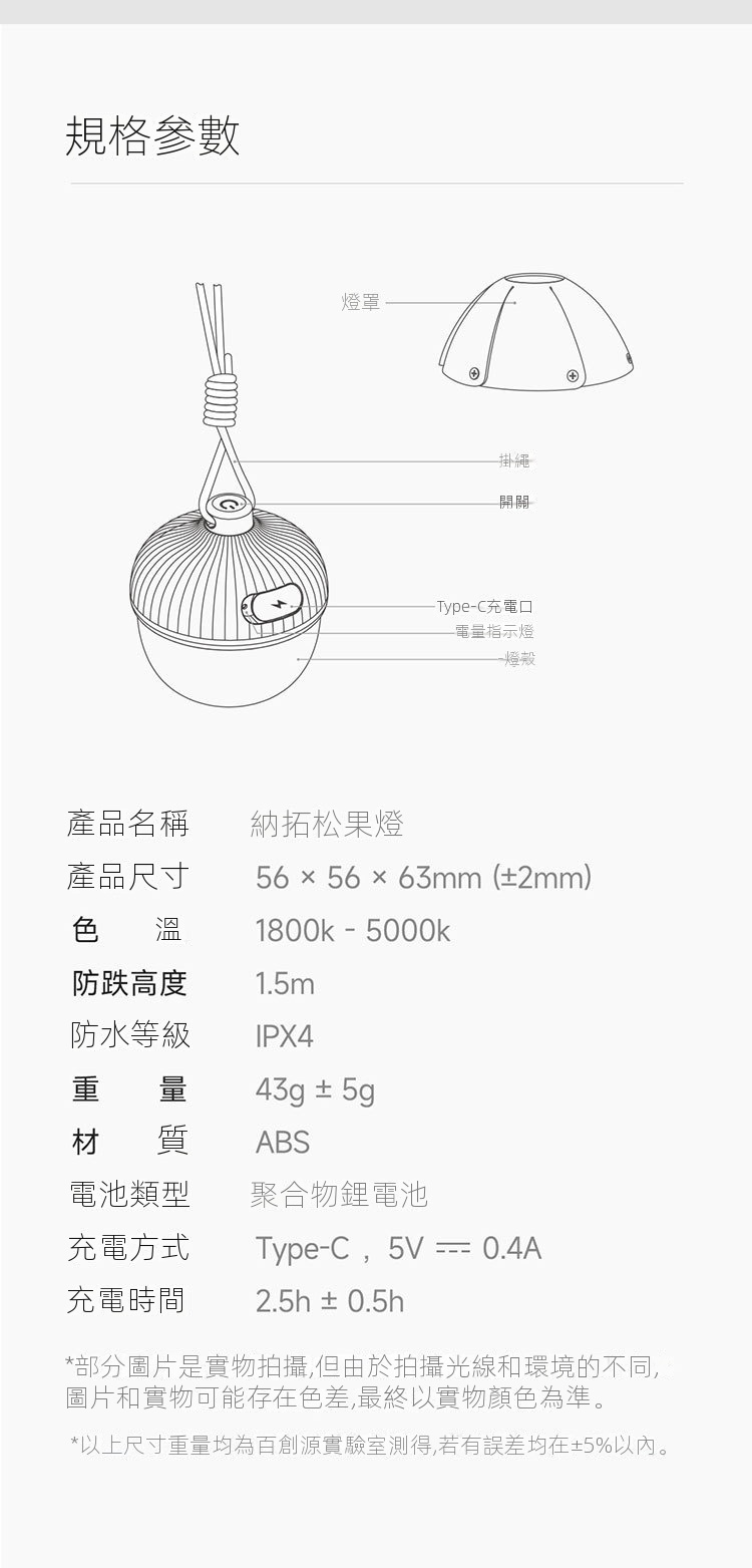 納拓松果燈是一款造型可愛、輕量化設計的氛圍燈,模擬松果外觀,重量僅約43g,直徑56mm,方便攜帶。內建黃白雙色光LED燈珠,支援無極色溫調節,能營造多種氛圍。續航表現優異,低亮模式下可達21小時,具IPX4防水等級,適合戶外使用。採用Type-C充電介面,隱藏式充電口設計防水防塵。不僅是照明工具,還可作為桌搭道具或背包裝飾,搭配輕質耐用的傘繩,能掛能綁,隨處懸掛。用戶可自行DIY配件,創造專屬的松果燈形象,增添趣味性與個人風格。