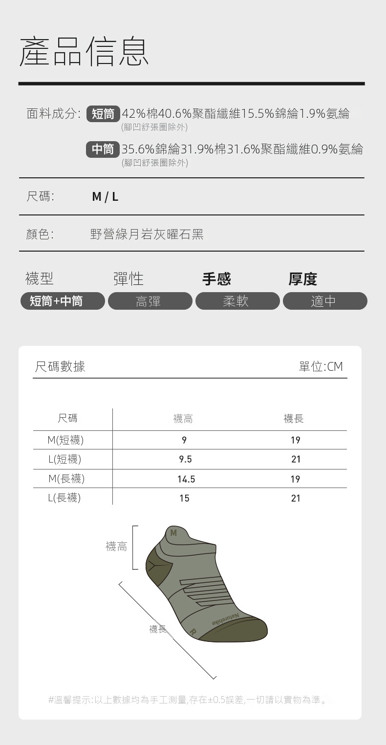 • 面料成分:42%棉,40.6%聚酯纖維,15.5%錦綸,1.9%氨綸(腳凹舒張圈除外)