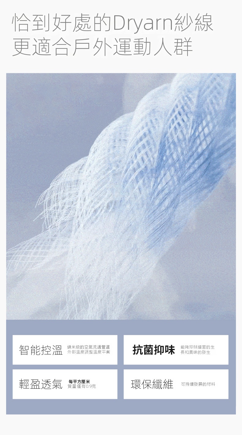• Dryarn紗線提供智能控溫功能,適應不同環境溫度