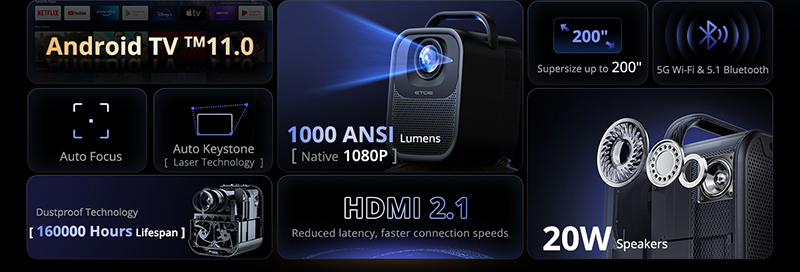 ETOE Seal Pro Android TV 投影機 - 黑色 | 1000ANSI Lumens亮度 | 內置Chromecast | 香港行貨