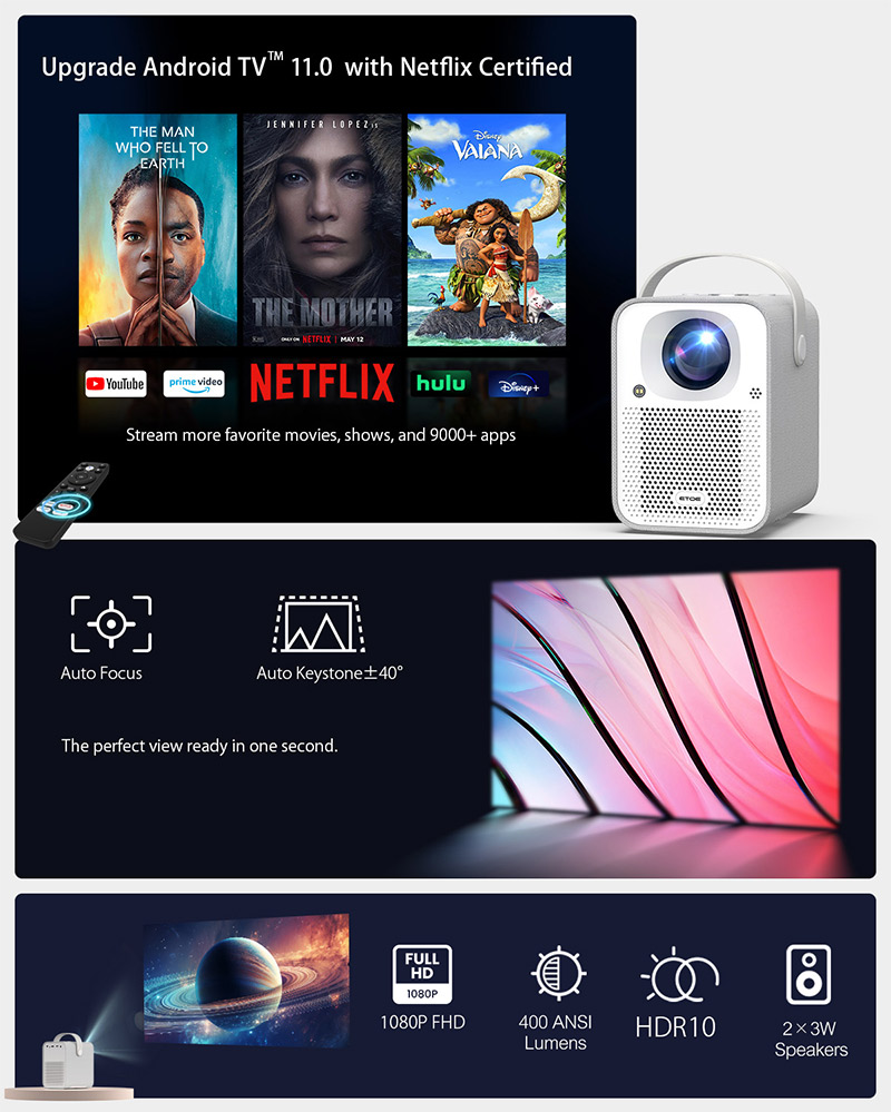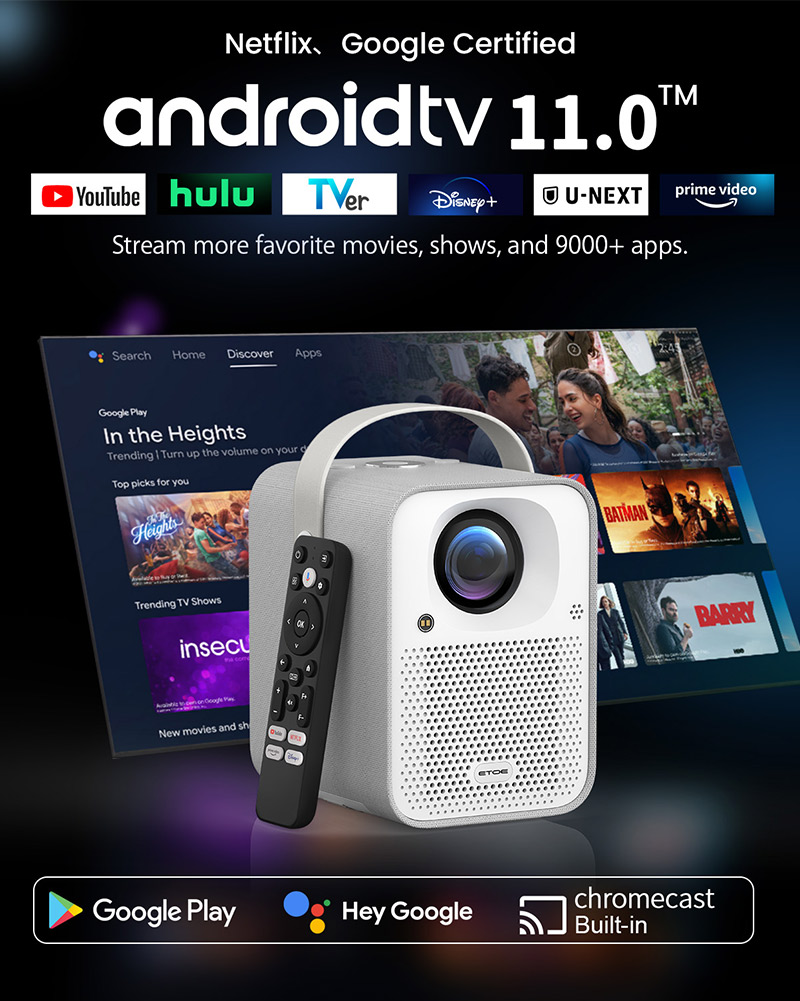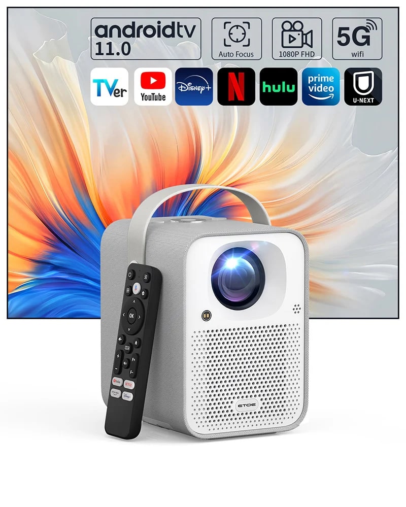 ETOE Seal Android TV投影機是一款集智慧與便利於一體的家庭娛樂設備。它搭載Android TV 11.0系統,內建Chromecast功能,支援語音控制。投影機採用全封閉式設計,配備1080P原生解析度和1000 ANSI流明的亮度,即使在日光條件下也能呈現清晰畫面。此外,它支援自動對焦和梯形校正,操作簡單,適合家庭劇院和商務簡報。其內建高品質揚聲器和杜比音效,無需額外音響即可享受影院級體驗。
