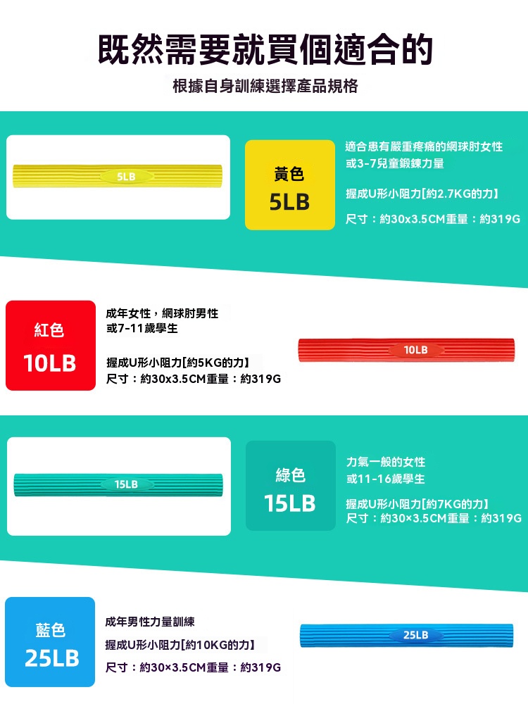 • 阻力級別:5lb(約2.7KG力)、10lb(約5KG力)、15lb(約7KG力)、25lb(約10KG力)