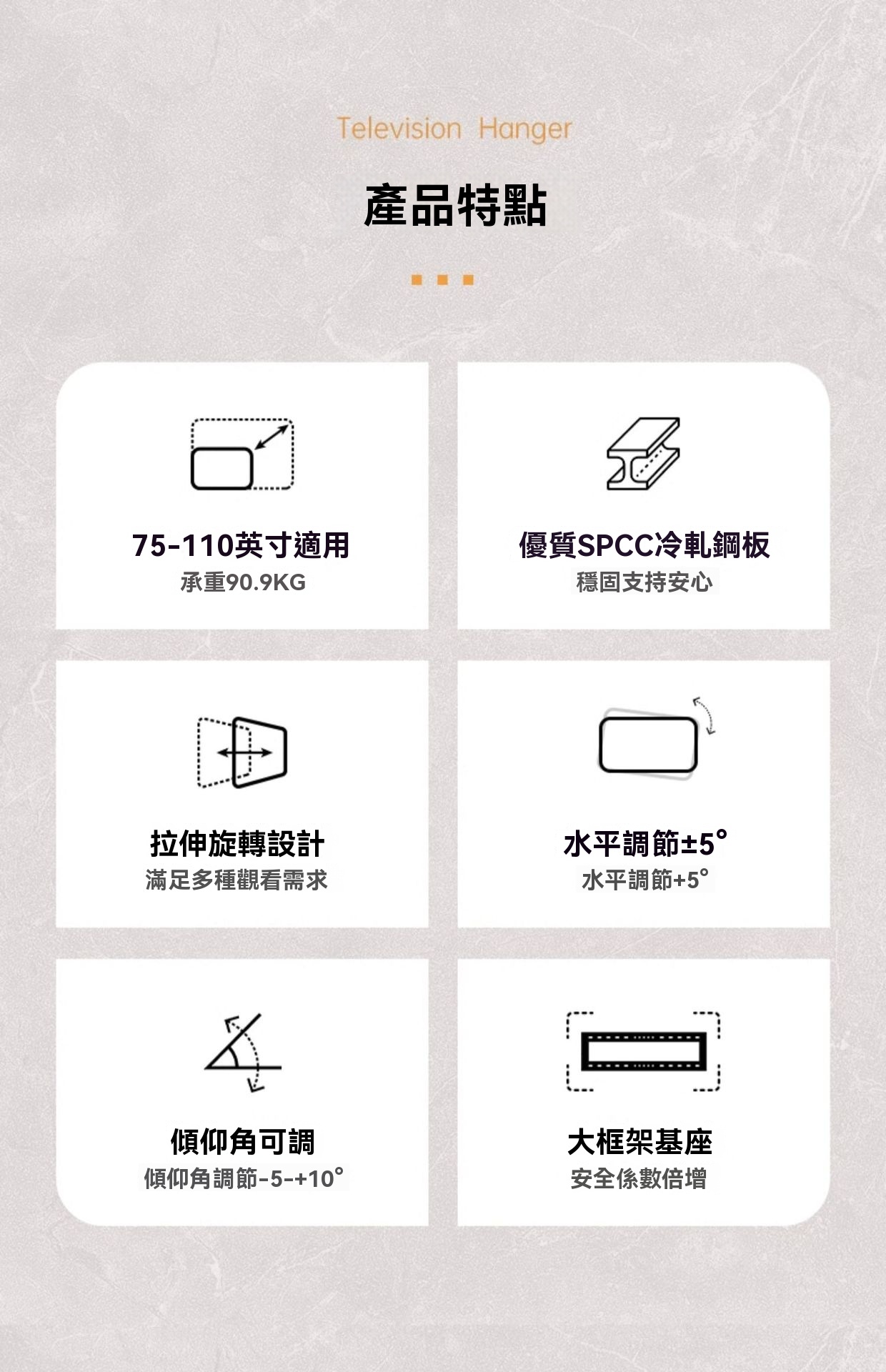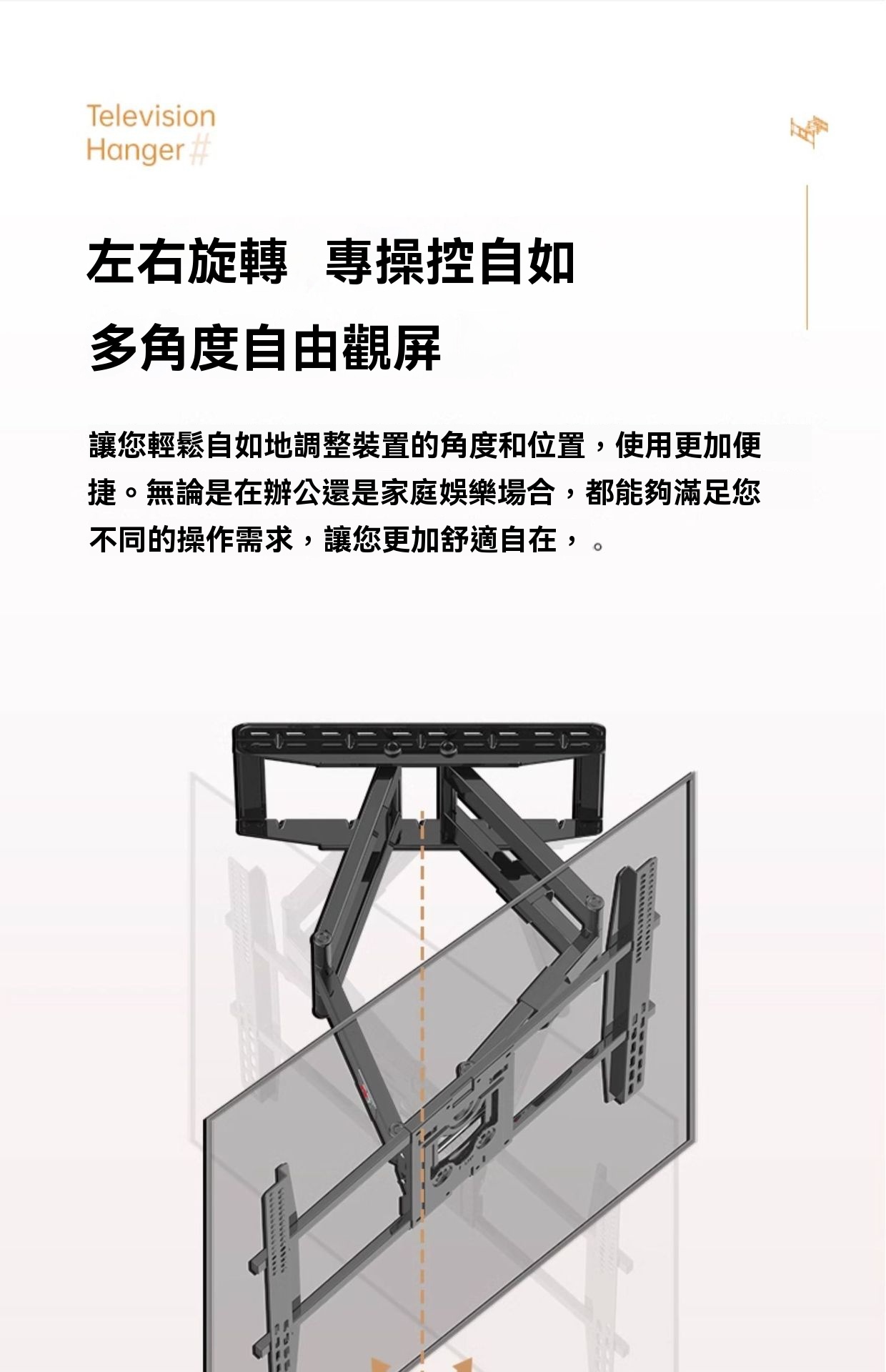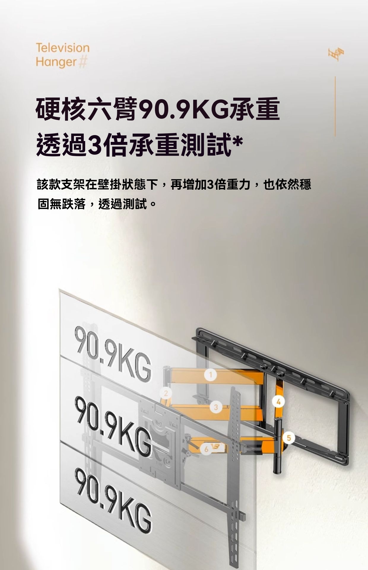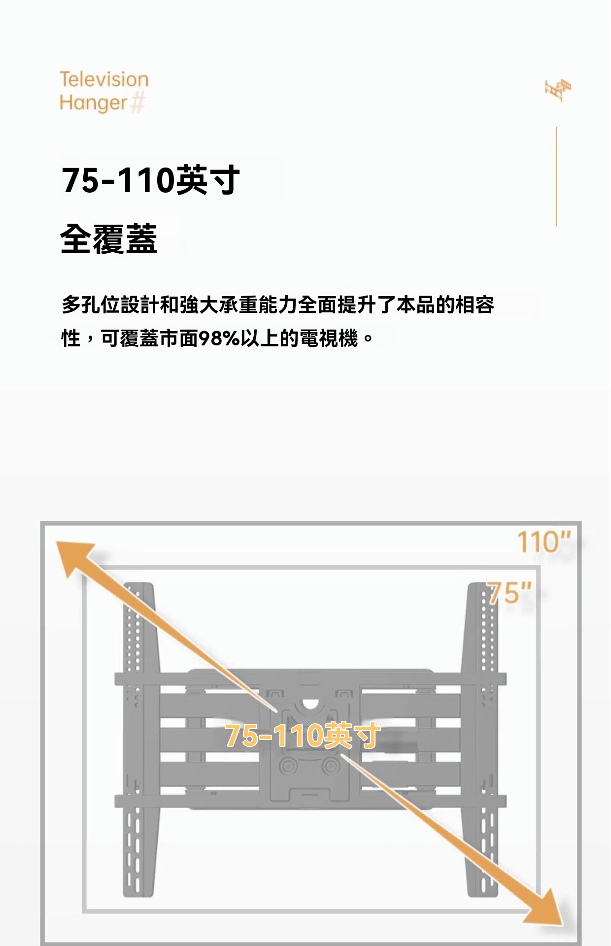 適配 75-110 吋三星、創維、海信等主流品牌電視,通用性拉滿適合多種機種。精選冷軋鋼優質材質打造,搭配重型粗壯 6 臂結構與加寬加厚牆板,承重高達 90.9 公斤,安裝後穩固不晃,給大屏電視穩穩守護。支援靈活伸縮與旋轉調節,輕鬆切換舒適觀賞角度,躺臥、側坐都能享受沉浸式觀影體驗。壁掛設計高效省空間,讓客廳、臥室、會議室告別雜亂,安裝便捷上手快。經典黑色外觀簡約大氣,適合各類裝潢風格,兼具強烈實用性與顏值質感,是大螢幕電視的優質搭配之選。