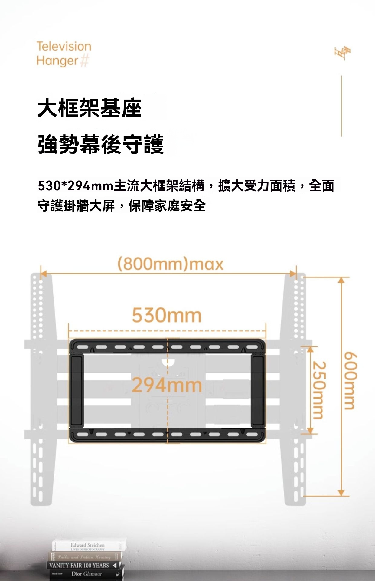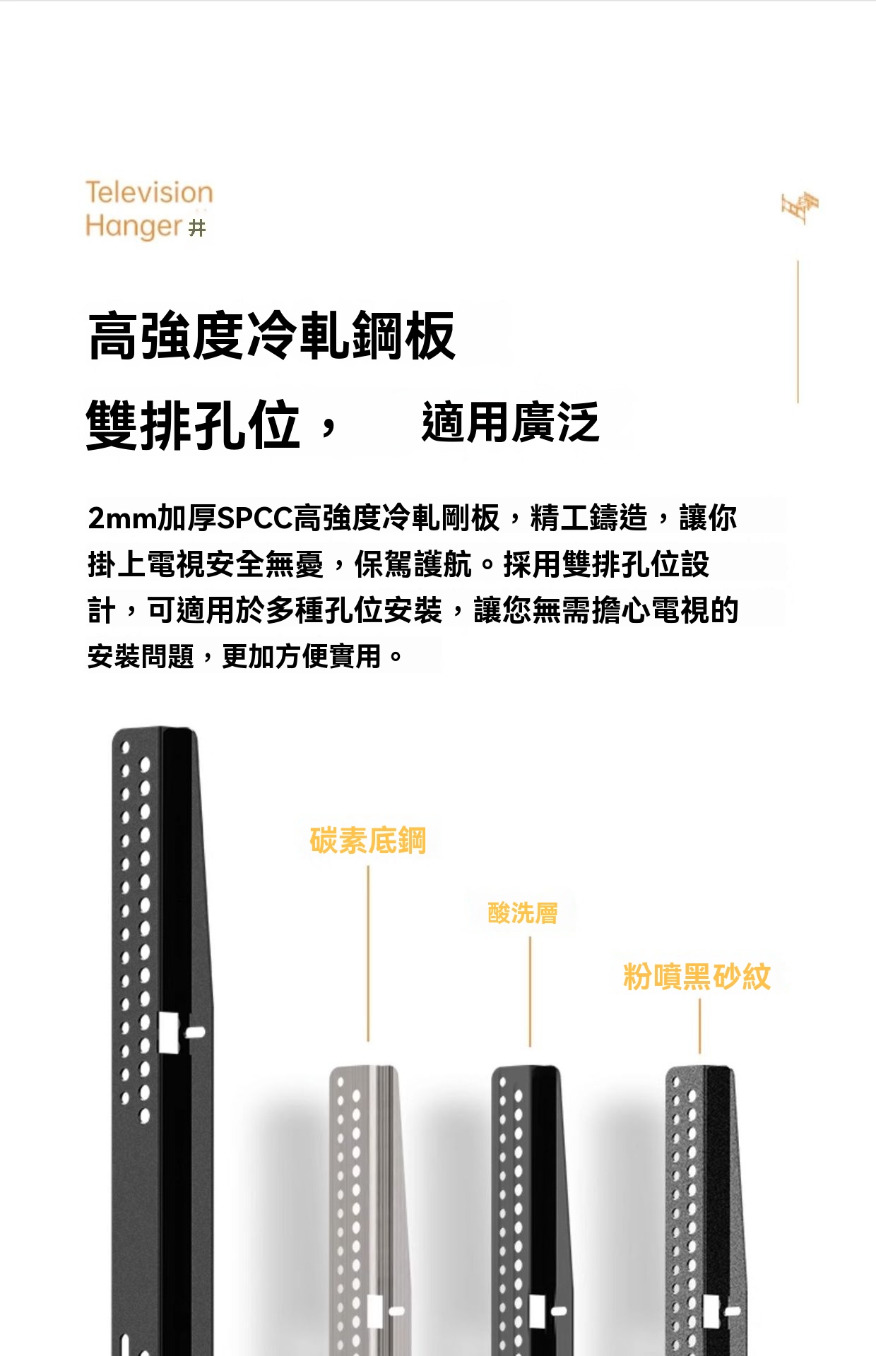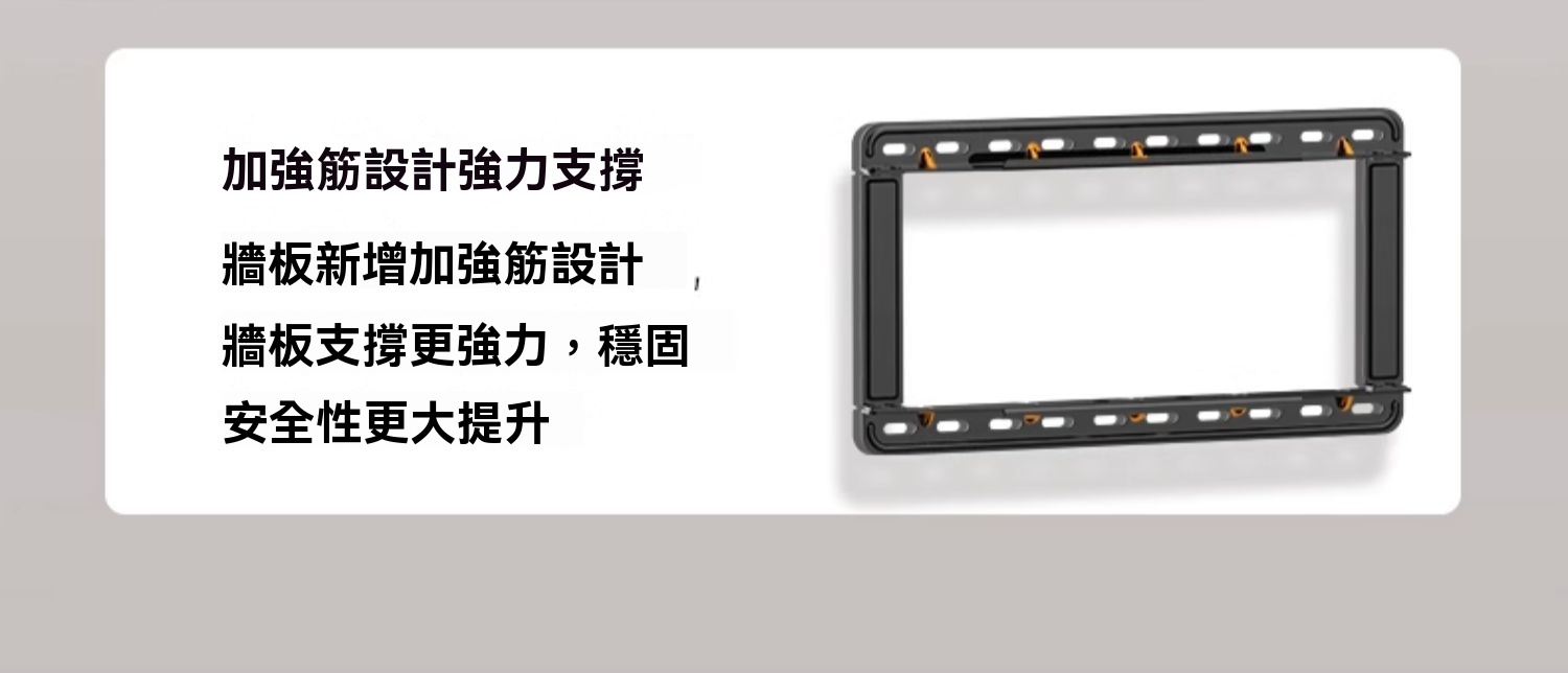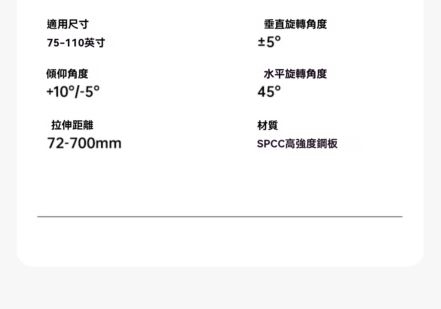 適配 75-110 吋三星、創維、海信等主流品牌電視,通用性拉滿適合多種機種。精選冷軋鋼優質材質打造,搭配重型粗壯 6 臂結構與加寬加厚牆板,承重高達 90.9 公斤,安裝後穩固不晃,給大屏電視穩穩守護。支援靈活伸縮與旋轉調節,輕鬆切換舒適觀賞角度,躺臥、側坐都能享受沉浸式觀影體驗。壁掛設計高效省空間,讓客廳、臥室、會議室告別雜亂,安裝便捷上手快。經典黑色外觀簡約大氣,適合各類裝潢風格,兼具強烈實用性與顏值質感,是大螢幕電視的優質搭配之選。