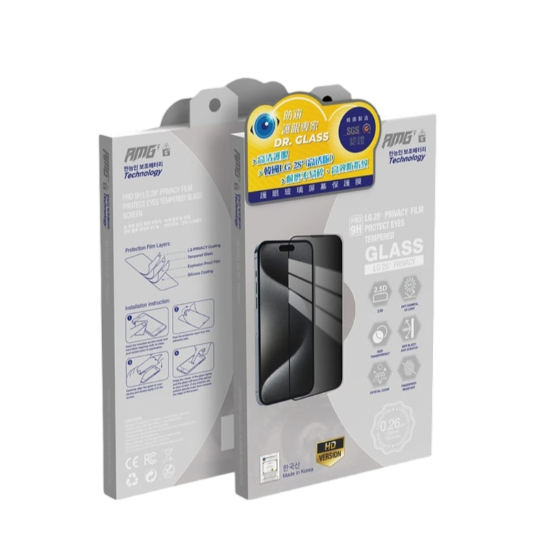 AMG-CT iPhone 系列防窺保護貼適合 iPhone14 - 16機型,產品採用韓國 Dr.Glass 物料,韓國製造,通過國際 SGS 測試認證與 80g 鉛球防爆測試,耐磨不易碎。它具備 0.26mm 超薄玻璃材質,搭配高效能防指紋塗層,使用體驗順滑。在核心功能上,其能有效阻隔左右兩側 28 度偷窺,同時可阻隔 70% 藍光,兼顧隱私保護與眼部防護,為用戶在使用 iPhone 時築牢屏幕安全與隱私防線。