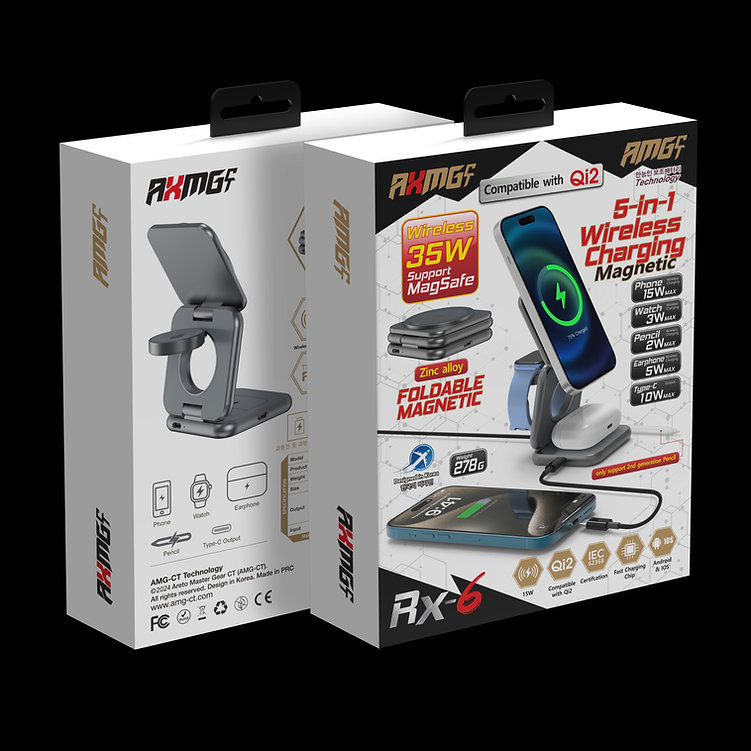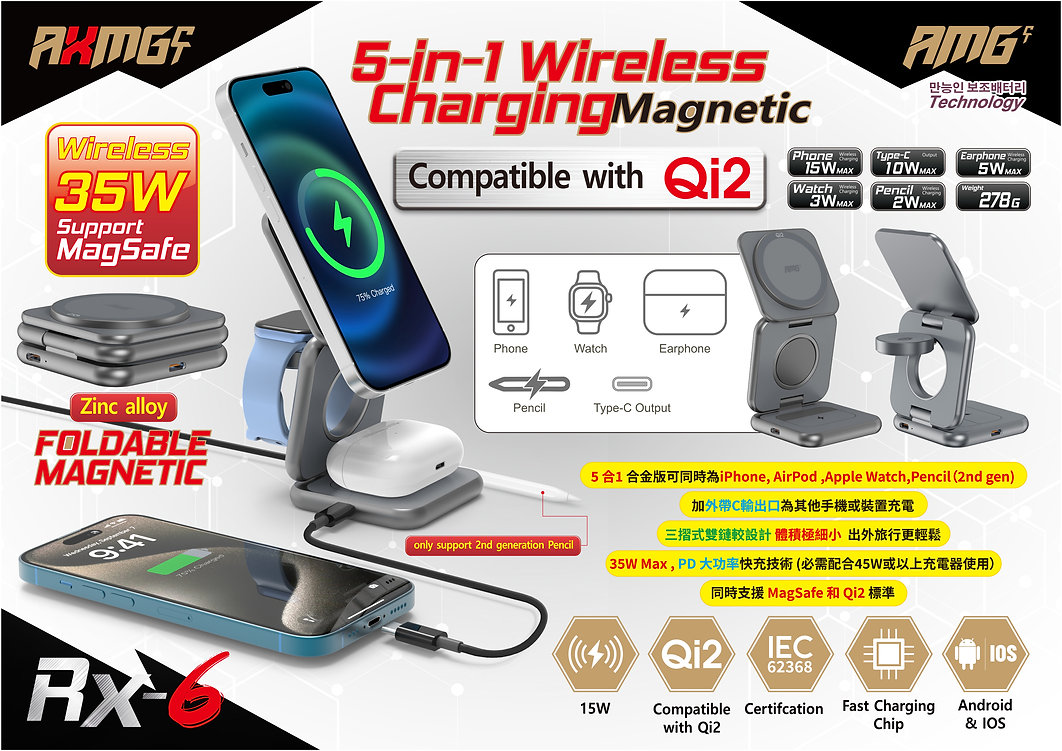 AMG-CT RX-6 5in1 Magsafe 三摺合式無線座充,為合金材質,僅重278g,尺寸68mm(L)×68mm(W)×28mm(H),採用三摺式雙鏈較設計,體積小巧便攜,適合外出旅行。它支援MagSafe與Qi2雙標準,擁有35W Max PD高功率快充技術(需搭配45W以上充電器使用),可同時為iPhone、AirPod、Apple Watch及第二代Apple Pencil充電,還帶Type-C輸出口,能為其他手機或裝置補電,各設備對應充電功率分別為手機15W(MAX)、耳機10W(MAX)。