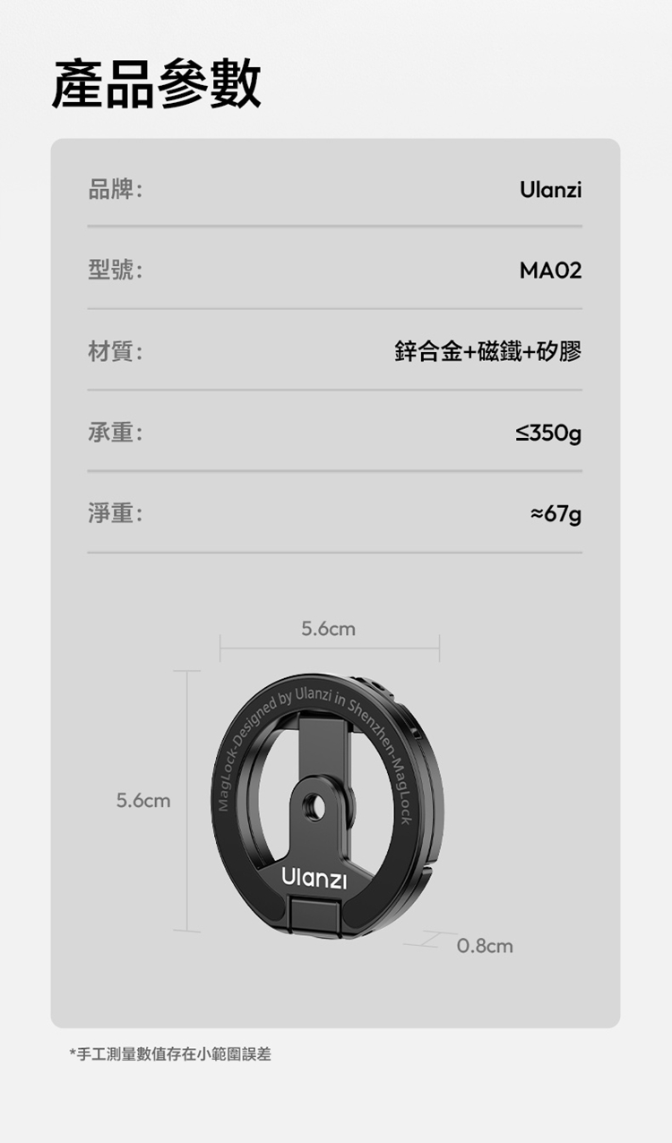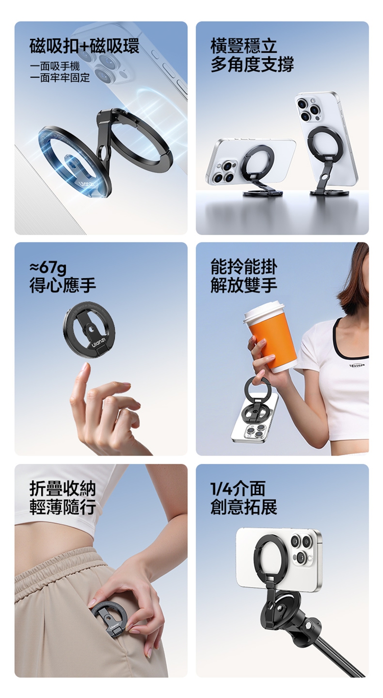 ULANZI MA02 MagLock 雙磁吸手機支架(黑色),是兼具實用性與便攜性的手機配件。它支援 MagSafe,蘋果、安卓設備通用,搭配磁吸殼或贈送的磁吸片即可穩固使用。採用雙環磁吸設計,14N 強力磁環吸附力足,能牢固固定手機,金屬材質打造,上手質感佳,磨砂表面細膩不滑手,做工精緻無毛刺。具備桌上型支架與手持握柄雙模式,折疊關節阻尼合理,角度調節靈活,可滿足追劇、辦公、直播、自拍等多場景需求,底部還設有防滑墊與 1/4"-20 螺紋口,能適配運動相機支架。折疊後輕薄小巧,便於收納攜帶,優質、旅行使用便捷,性價比出眾,是日常出差使用的優質選擇。