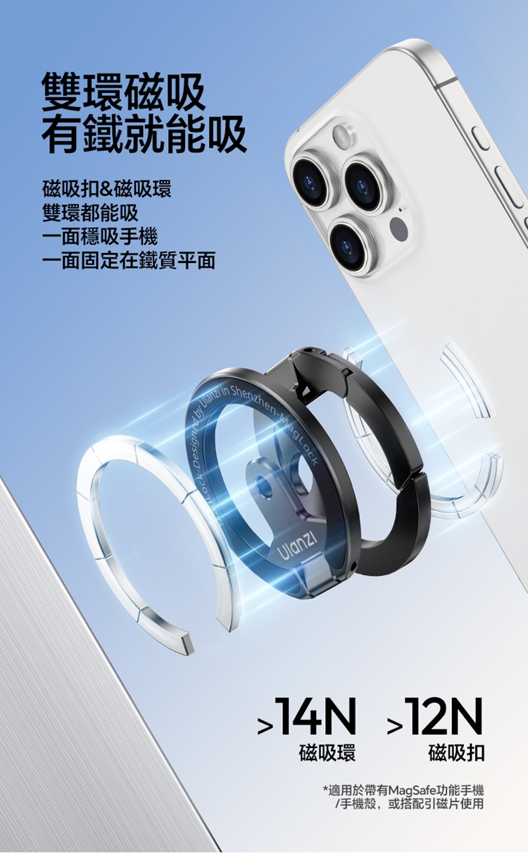 • 【雙環強力磁吸】:採用專利 MagLock 雙磁吸設計。一面穩固吸附手機(需手機或手機殼支援磁吸功能),另一面牢固吸附任何鐵製平面,實現快速、可靠的固定,解放您的雙手。