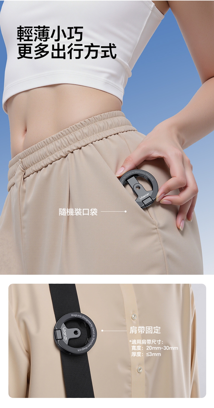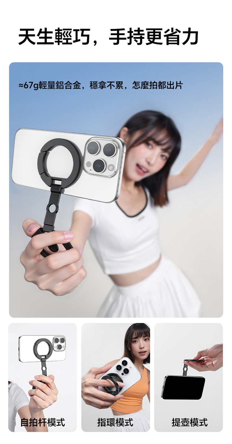 • 【能拎能掛 隨處固定】:獨特的磁吸掛扣設計,既可作為方便提拿的手拎環,亦可作為吊掛固定的支架。隨時隨地將手機掛在背包、欄杆或任何物件上,讓拍攝更加靈活便捷。