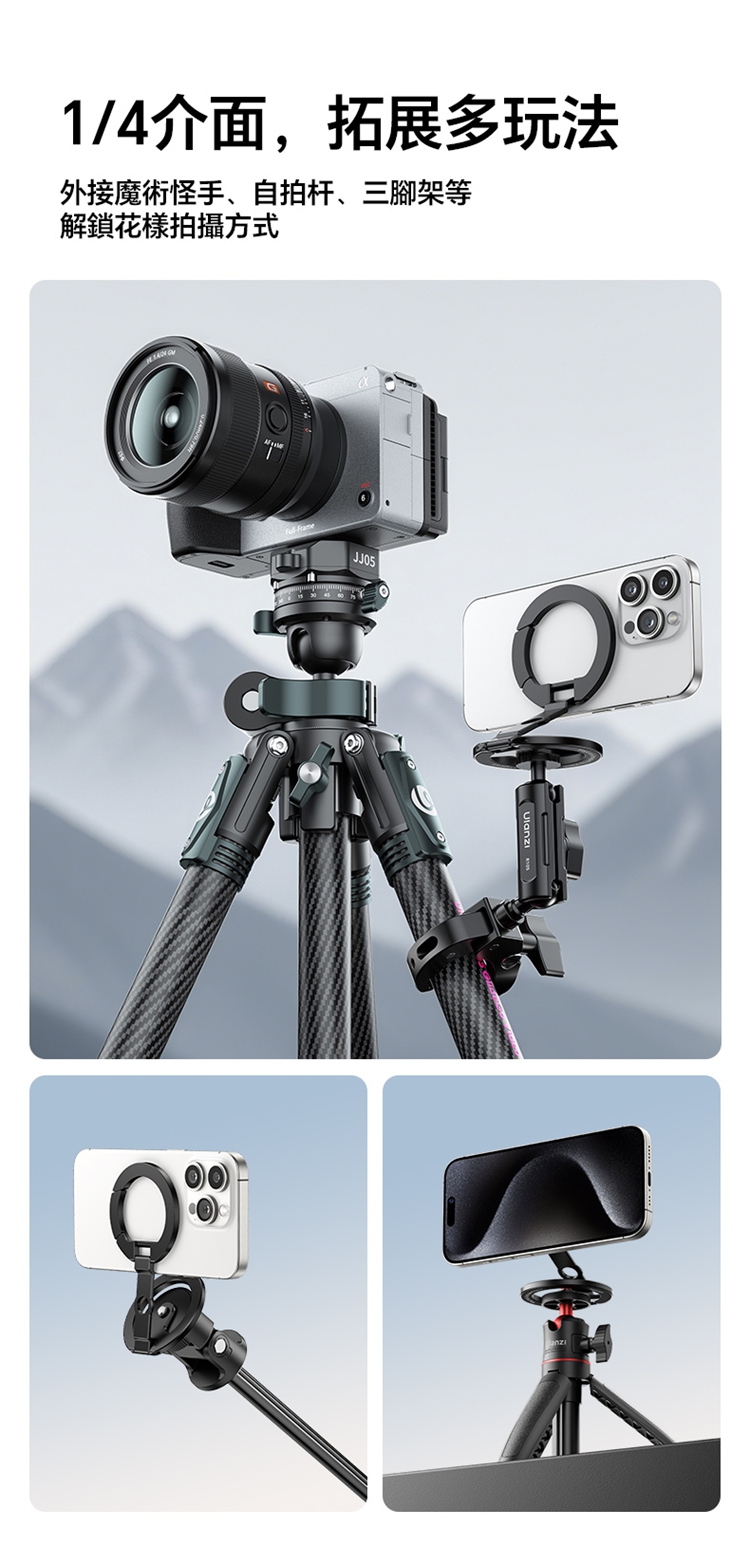• 【1/4″ 專業拓展接口】:底部設有標準 1/4″ 螺紋接口,可無縫連接魔術手、自拍桿、三腳架等專業攝影配件,解鎖無限創意玩法,構建您的行動影像工作站。