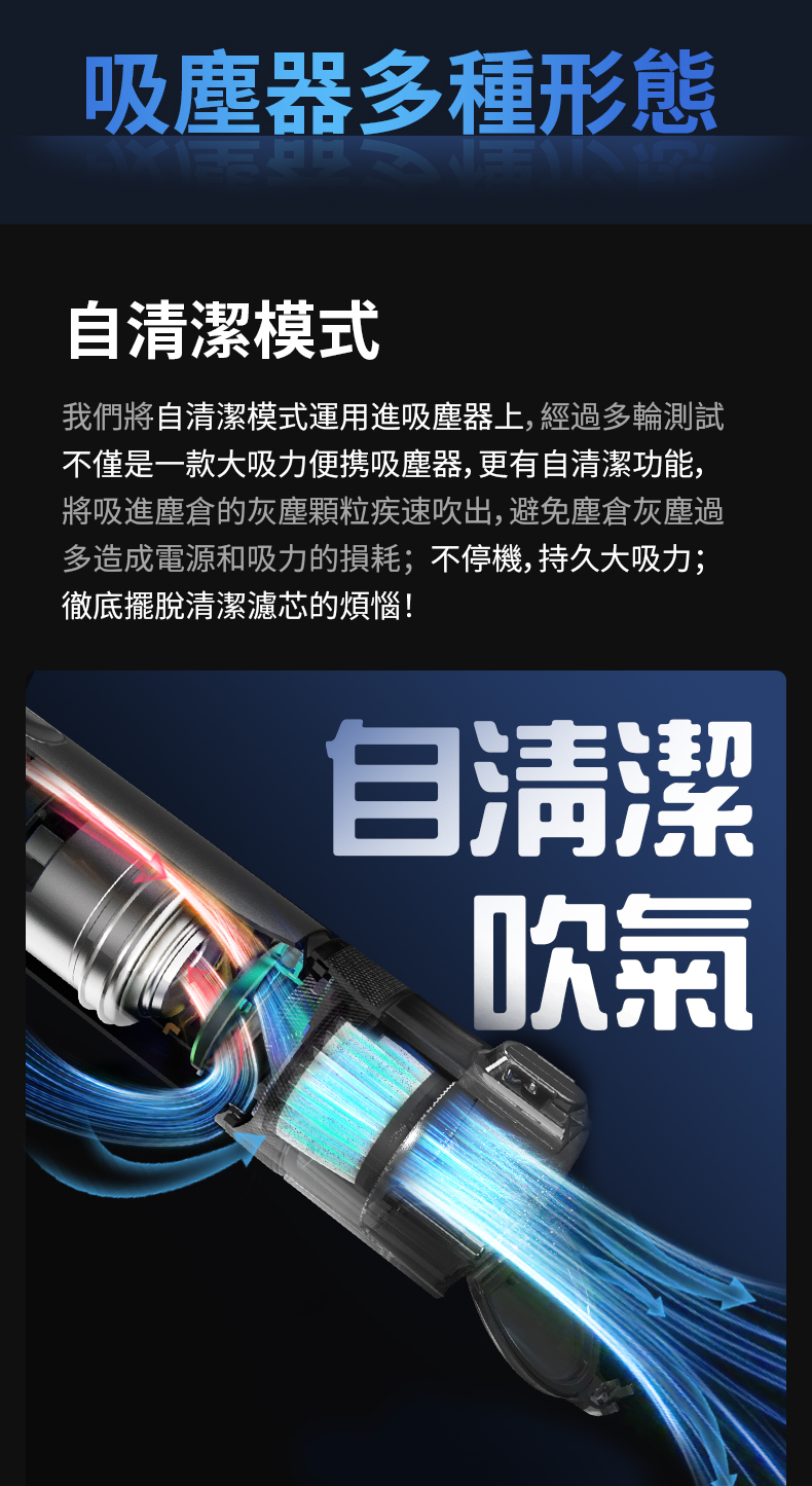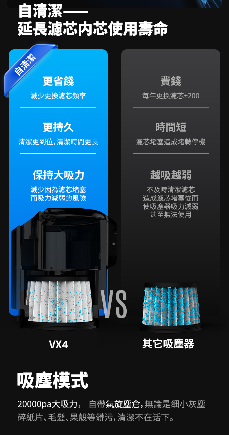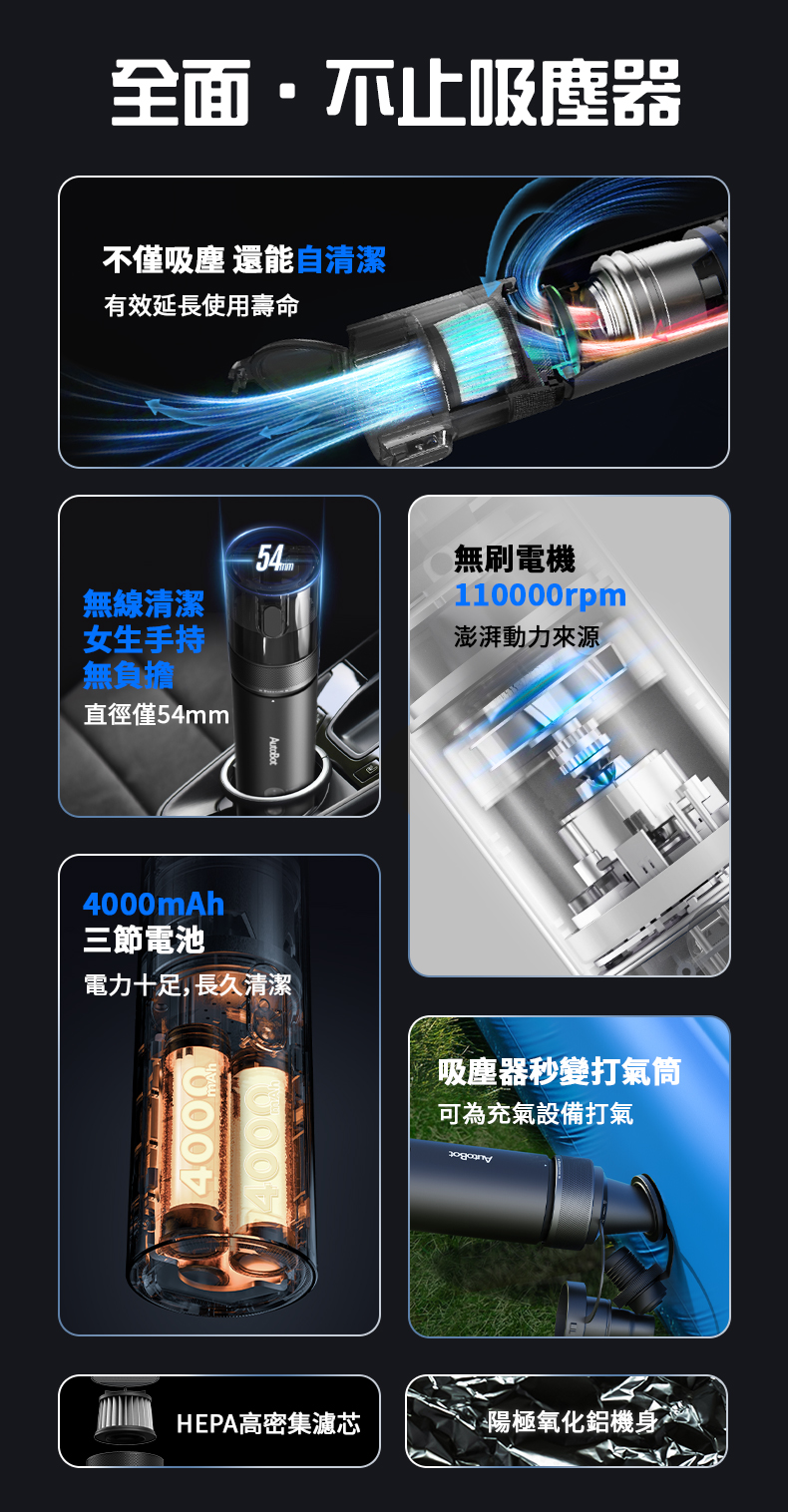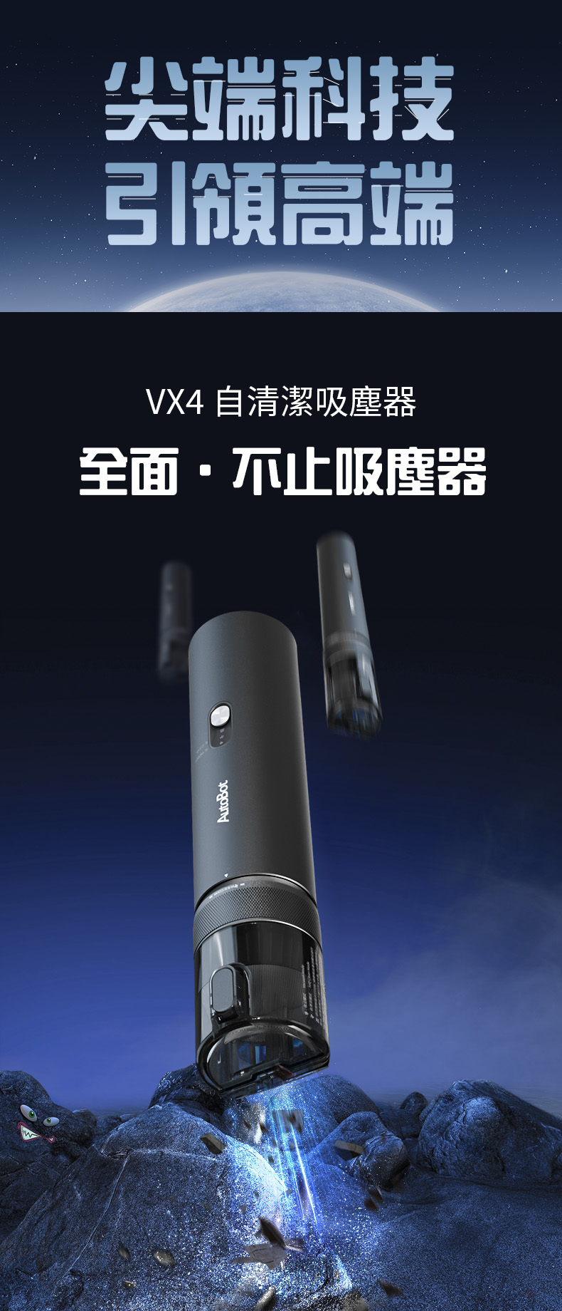 AutoBot VX4 Max 便攜式吹吸兩用吸塵器憑藉尖端科技,打造高效清潔體驗。機身小巧,僅 54×256mm 尺寸、588g 重量,握持使用無負擔。核心亮點在於創新反吹自清模式,可疾速吹出塵倉灰塵,避免濾芯堵塞,減少更換頻率,持久保持大吸力。其吸力最高可達 20,000Pa,搭配氣旋塵倉,可輕鬆應付細小灰塵、毛髮、果屑等各類髒污。三大模式靈活切換,4000mAh 電池支援最長 70 分鐘續航,170W 額定功率與 80ml 塵盒容量,讓清潔高效又省心,是實用便捷的生活電器。