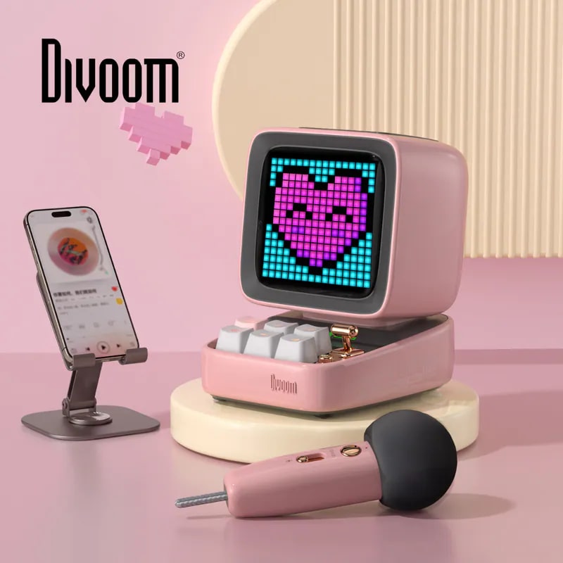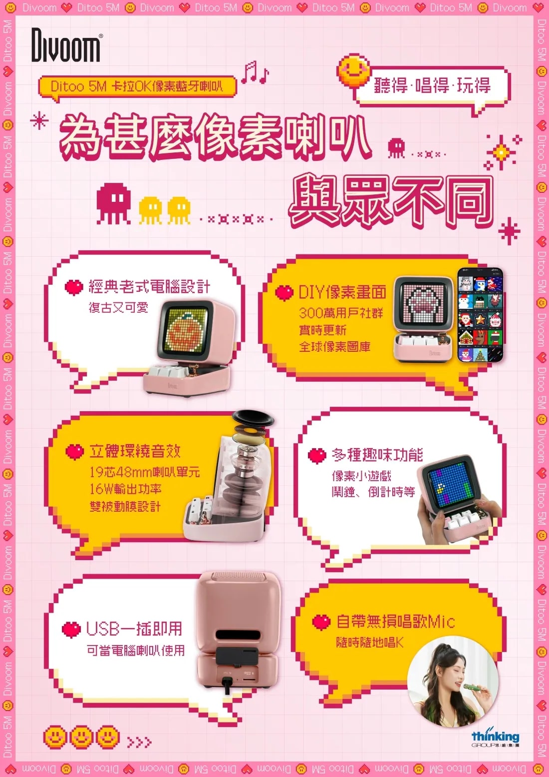 潮人必入的 Divoom Ditoo 5M 卡拉 OK 像素藍牙喇叭,把復古美學與全能體驗拉滿! 90 年代 「大頭電腦」 靈感設計,16x16 像素螢幕 + 飛機推桿 + RGB 機械鍵盤,鋼琴烤漆質感十足,三色可選超吸睛。 48mm 揚聲器搭配 15W 強輸出,雙被動膜加持,低音沉穩、聲場開闊,音質直接拉滿。 K 歌更是專業級,2.4G 抗干擾技術告別雜音,7 種音效隨心切換,APP 一鍵消原音,想唱就唱超盡興。連結 Divoom 專屬 APP,能 DIY 像素創作、玩轉 15 款懷舊遊戲,還能當時鐘、鬧鐘,甚至體驗 DJ 混音樂趣。 8 小時長續航 + 藍牙 5.3、USB、TF 卡三重連接,實用又便捷,精緻禮盒套裝,自用送禮都超有儀式感!