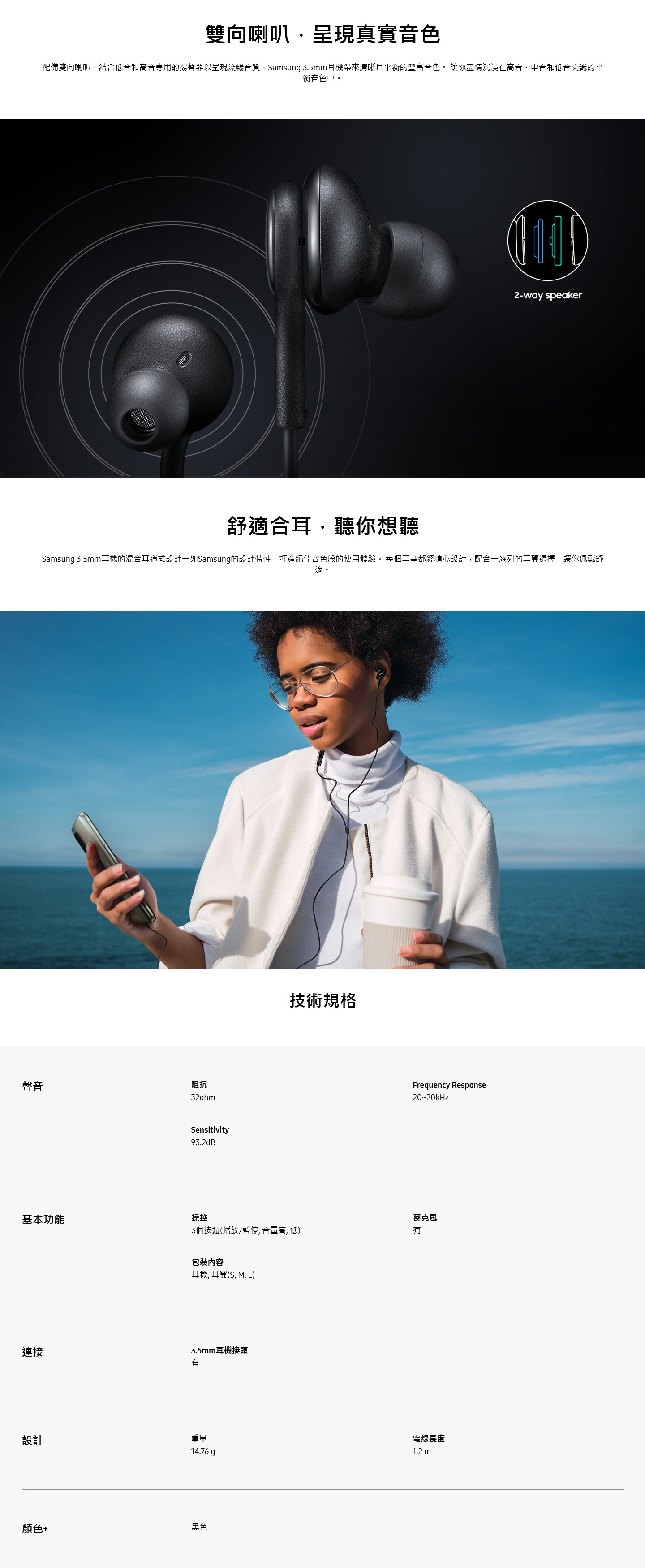 SAMSUNG EO-IA500 是一款主打均衡音質與舒適佩戴的 3.5mm 入耳式耳機,機身呈現經典黑色。其搭載雙向揚聲器系統,配備專屬低音單元與高音單元,可呈現清晰平衡的飽滿音效,讓高、中、低頻交織融合,帶來沉浸聽覺體驗。採用三星標誌性混合耳道式設計,搭配附贈的 S、M、L 三種尺寸耳帽,能適配不同耳型,實現穩固貼合與配戴舒適感。耳機配備三鍵操控系統,可輕鬆實現播放 / 暫停及音量調節,內建麥克風支援通話功能。機身僅重 14.76g,搭配 1.2 公尺線纜,便攜實用。其音質參數亮眼,阻抗 32ohm,頻率響應覆蓋 20~20kHz,靈敏度達 93.2dB,滿足日常聽音需求。