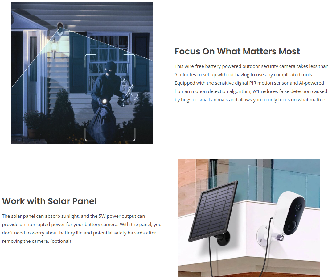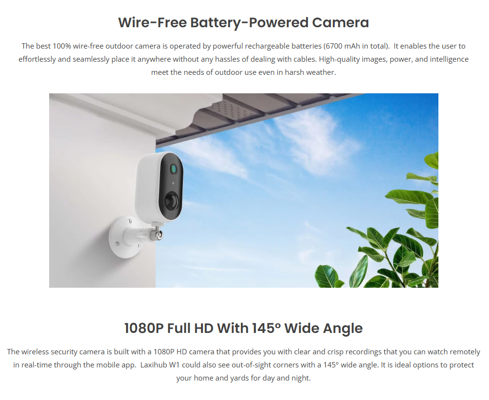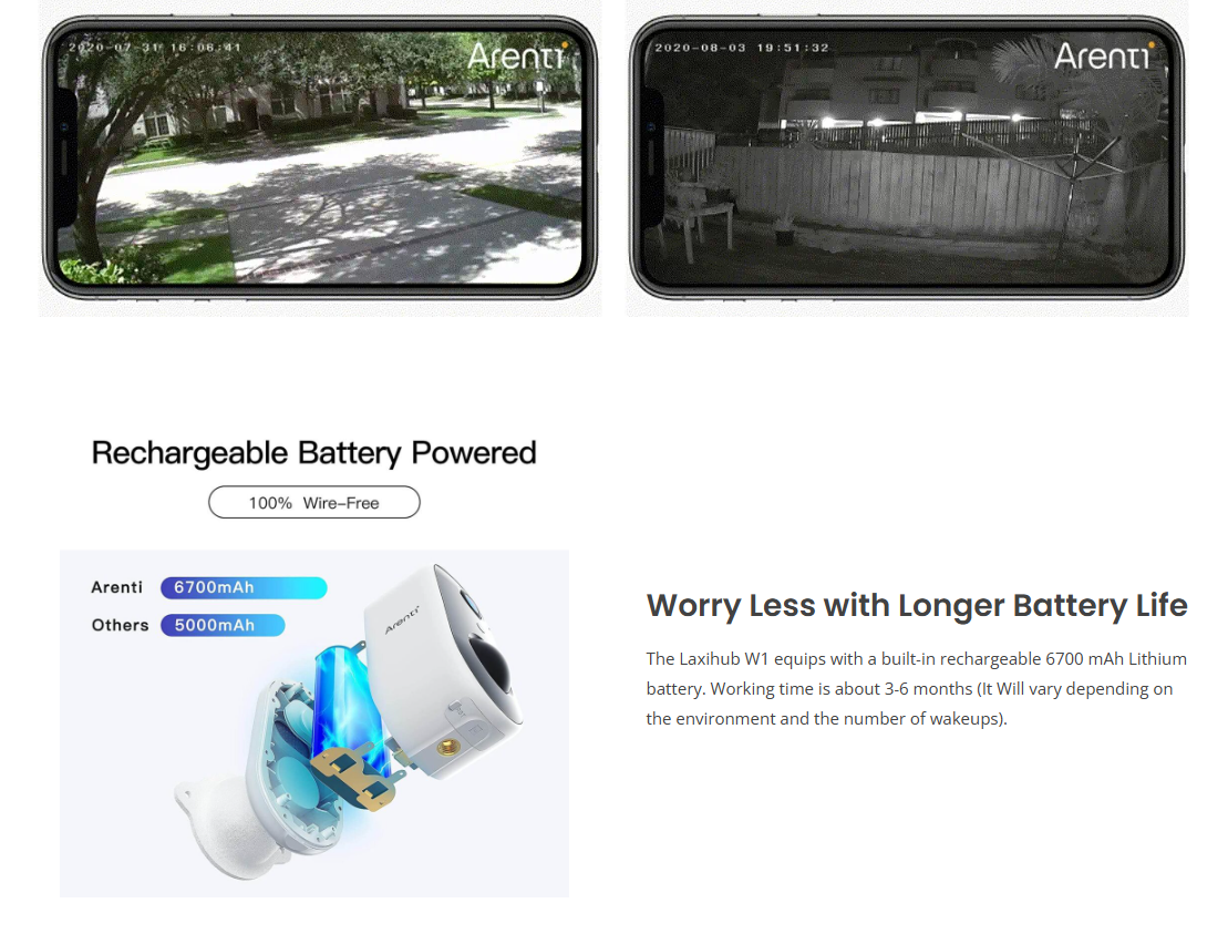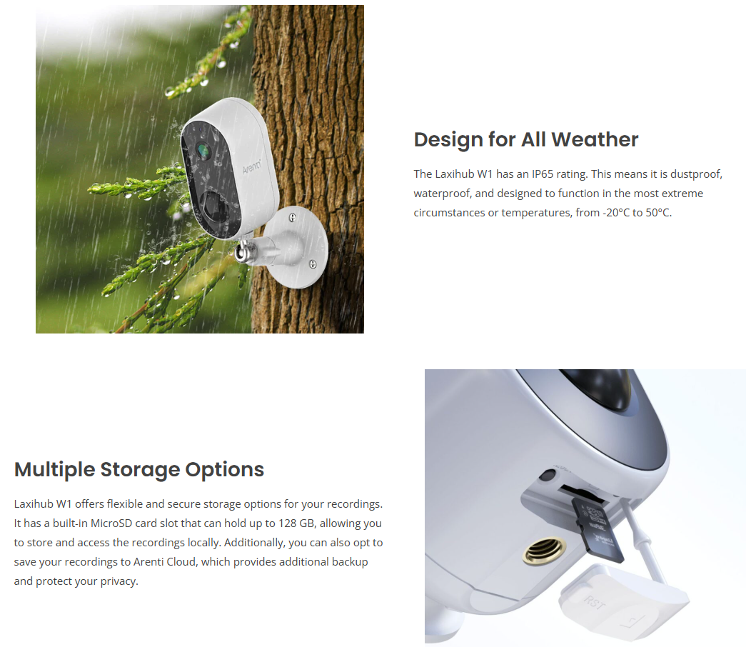 Arenti Laxihub W1戶外無線電池攝影機是一款功能強大的安防設備。它採用100%無線設計,配備6700mAh可充電鋰電池,續航力3-6個月。具備1080P全高清畫質,145°廣角鏡頭,搭配增強夜視功能,可清晰記錄10公尺內畫面。支持AI人形檢測與PIR運動感測,能減少誤報。具備雙向音頻,可透過Arenti應用程式與他人交流,也相容於亞馬遜Alexa和Google助理。此外,IP65級防水防塵,適應各種惡劣天氣,支援SD卡及雲端儲存。