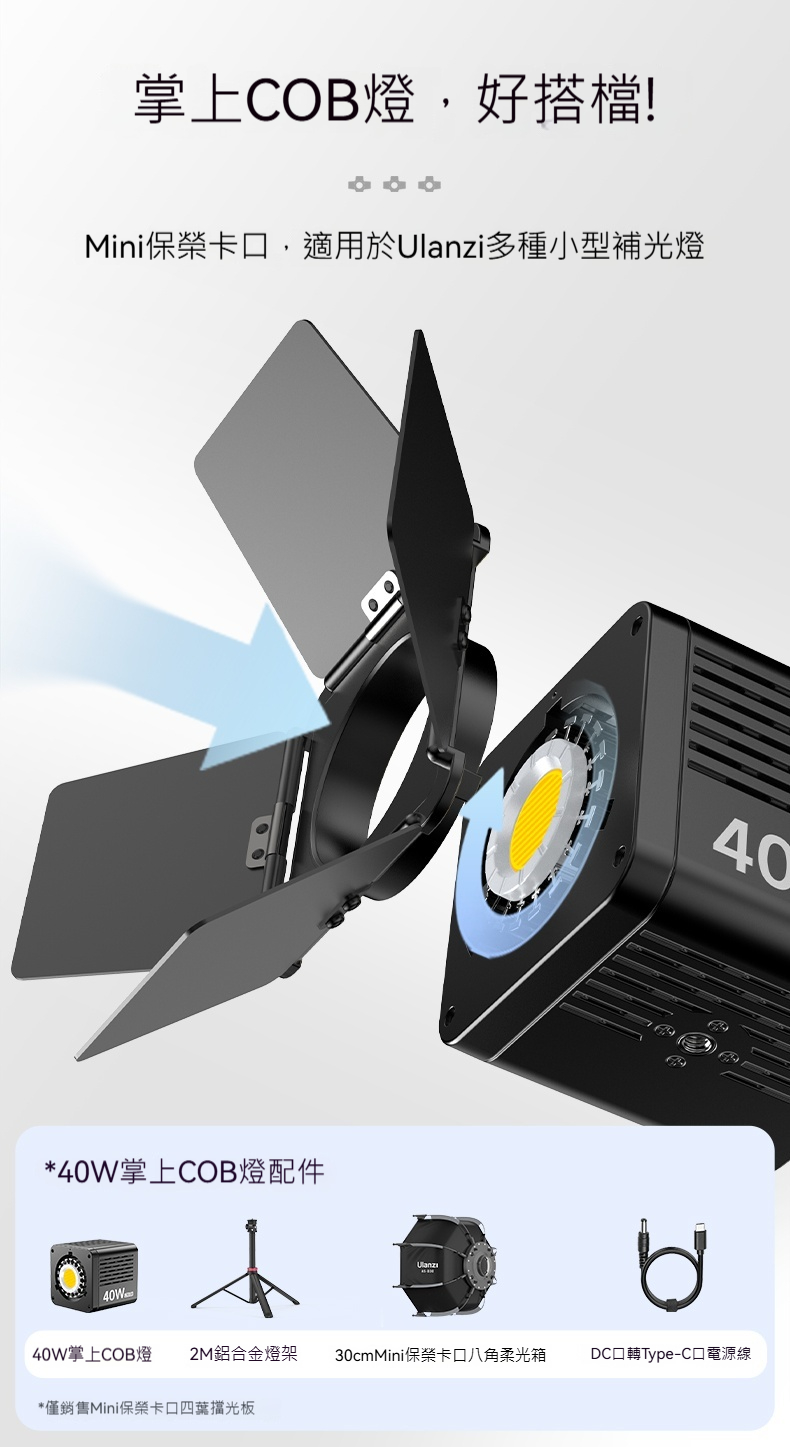 • 適用於Ulanzi多種小型補光燈,特別適合40W掌上COB燈