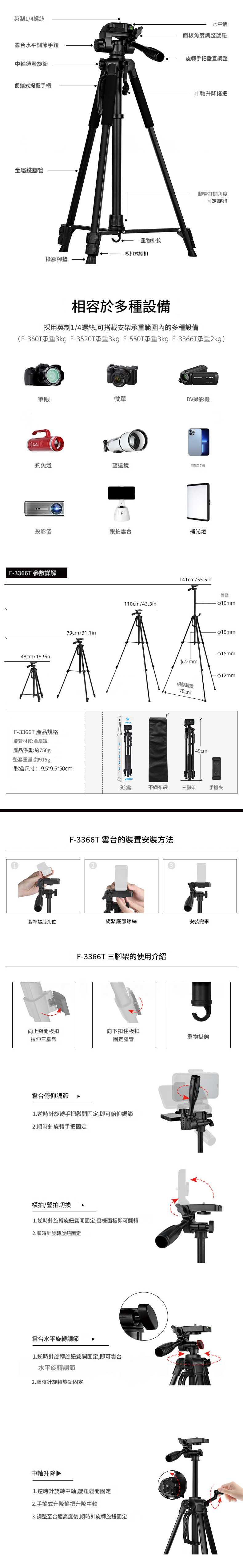 雲景F3366T多功能三腳架,可相容多重設備,承重達2kg。採用金屬鐵腳管,堅固耐用,適合單反、微單、DV攝像機等多種設備。配備便利的水平儀與面板角度調整旋鈕,確保拍攝穩定。中軸升降設計,輕鬆調節高度。附藍牙遙控器與腳管護套,操作簡便,提升使用體驗。無論戶外攝影或直播自拍,皆能滿足需求。