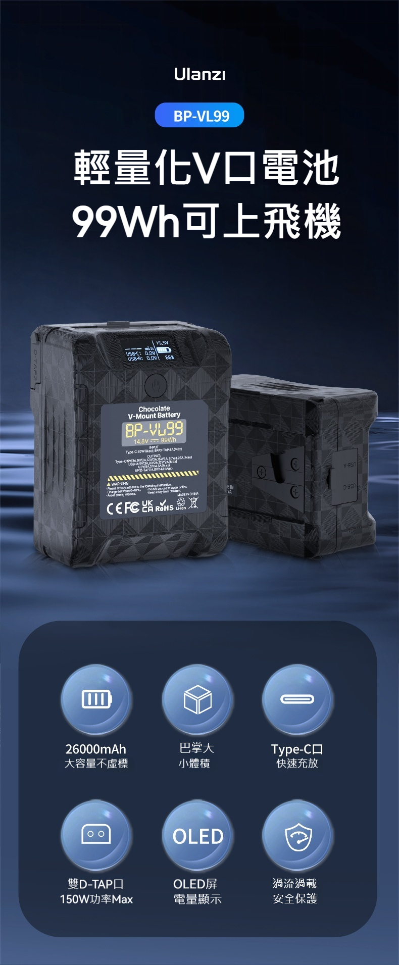 Ulanzi BP-VL99 V口攝影機移動電源 - 標準版 | 26000mAh | V扣輕量化充電