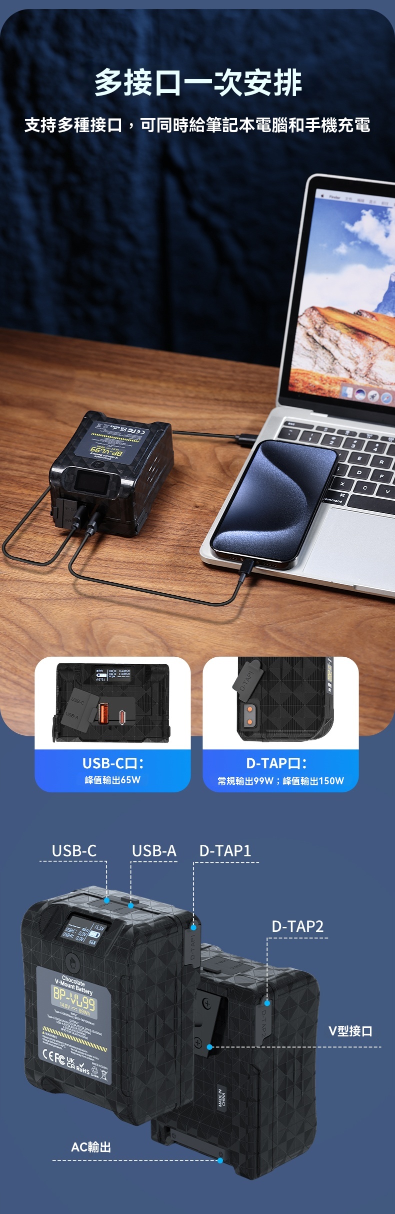 • 雙D-TAP接口,支持多設備同時充電,峰值輸出150W,常規輸出99W